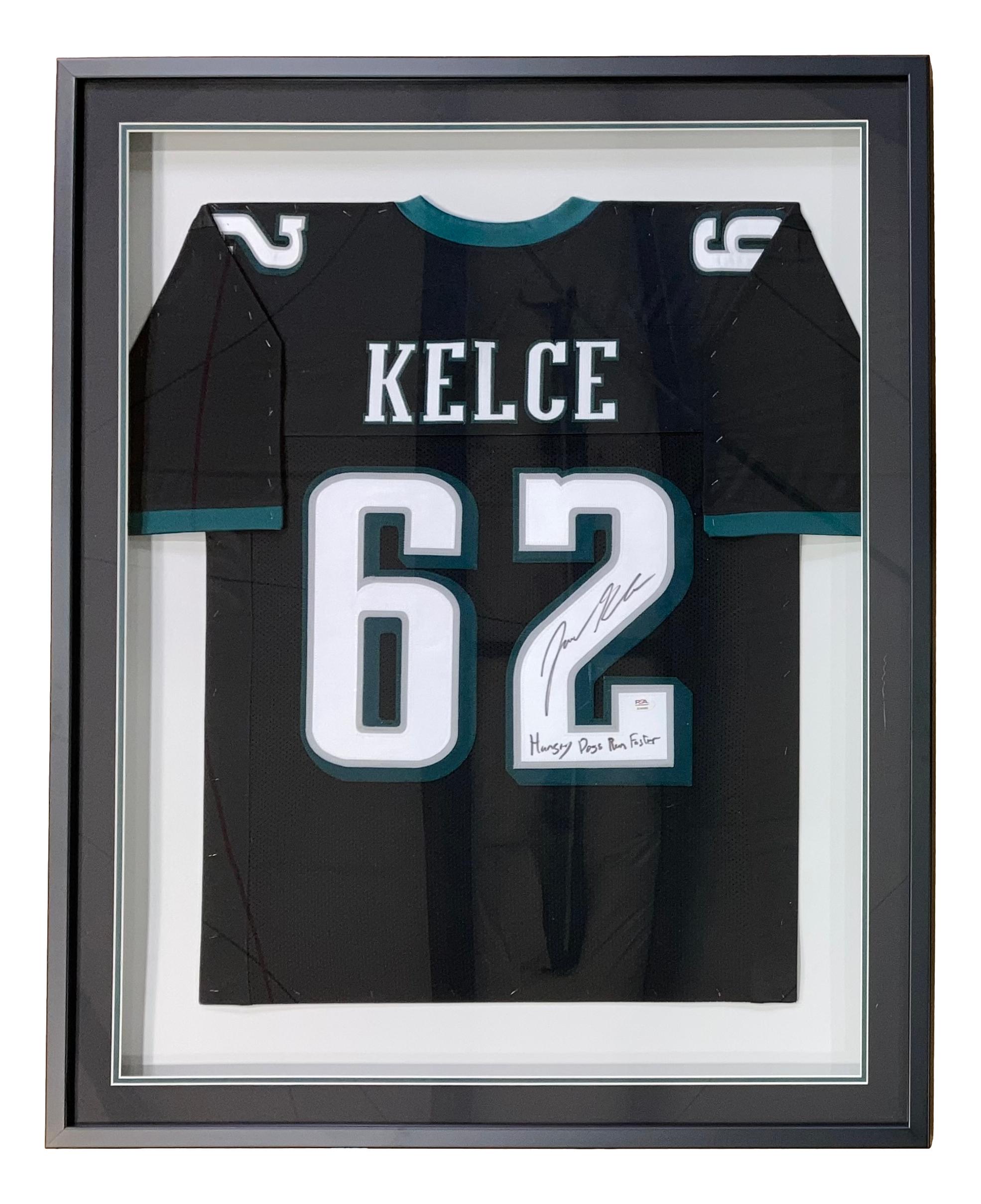 Custom frame measures 32" x 38" in size and features a jersey that has been hand-signed and inscribed by Jason Kelce (Philadelphia Eagles).