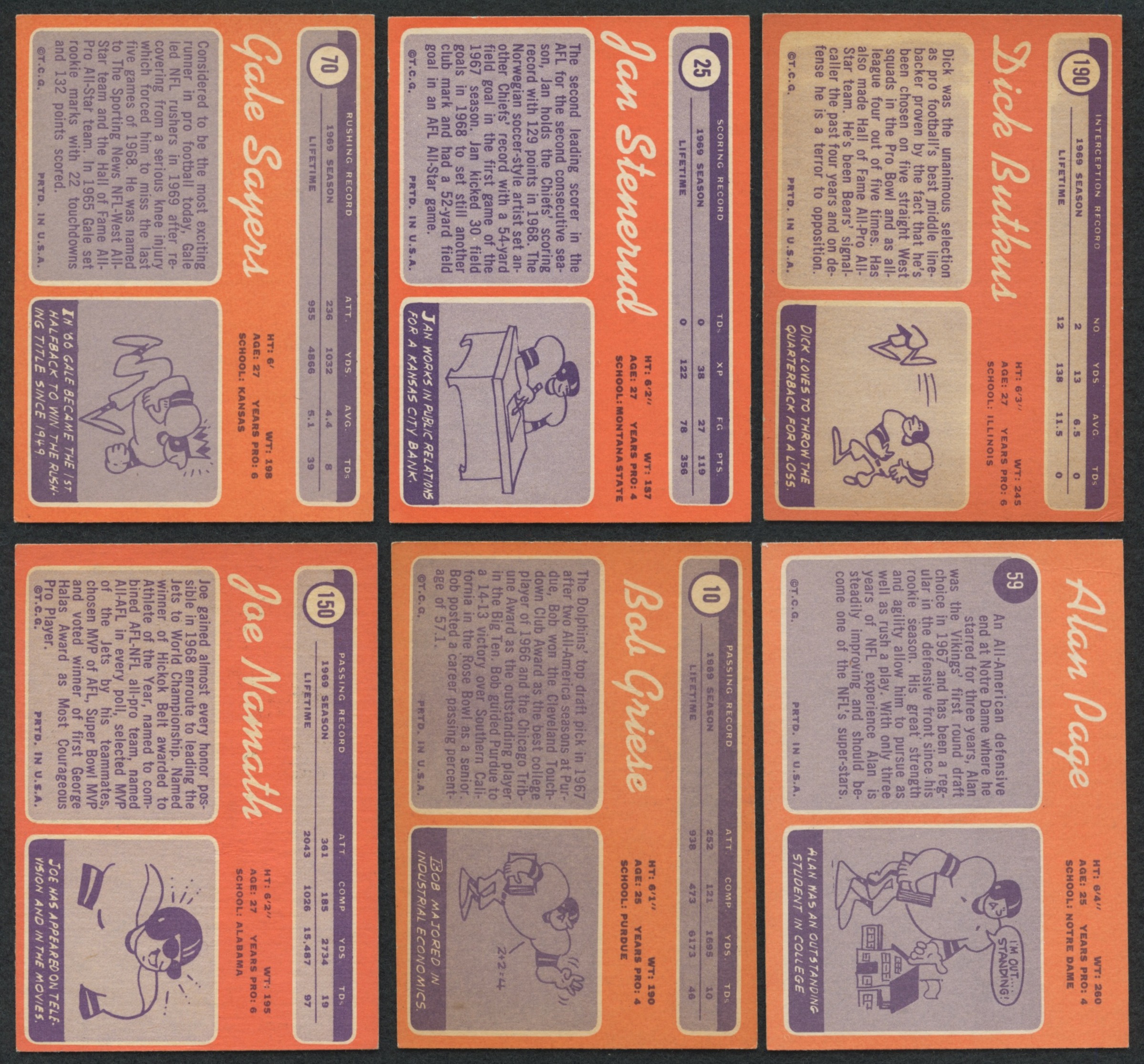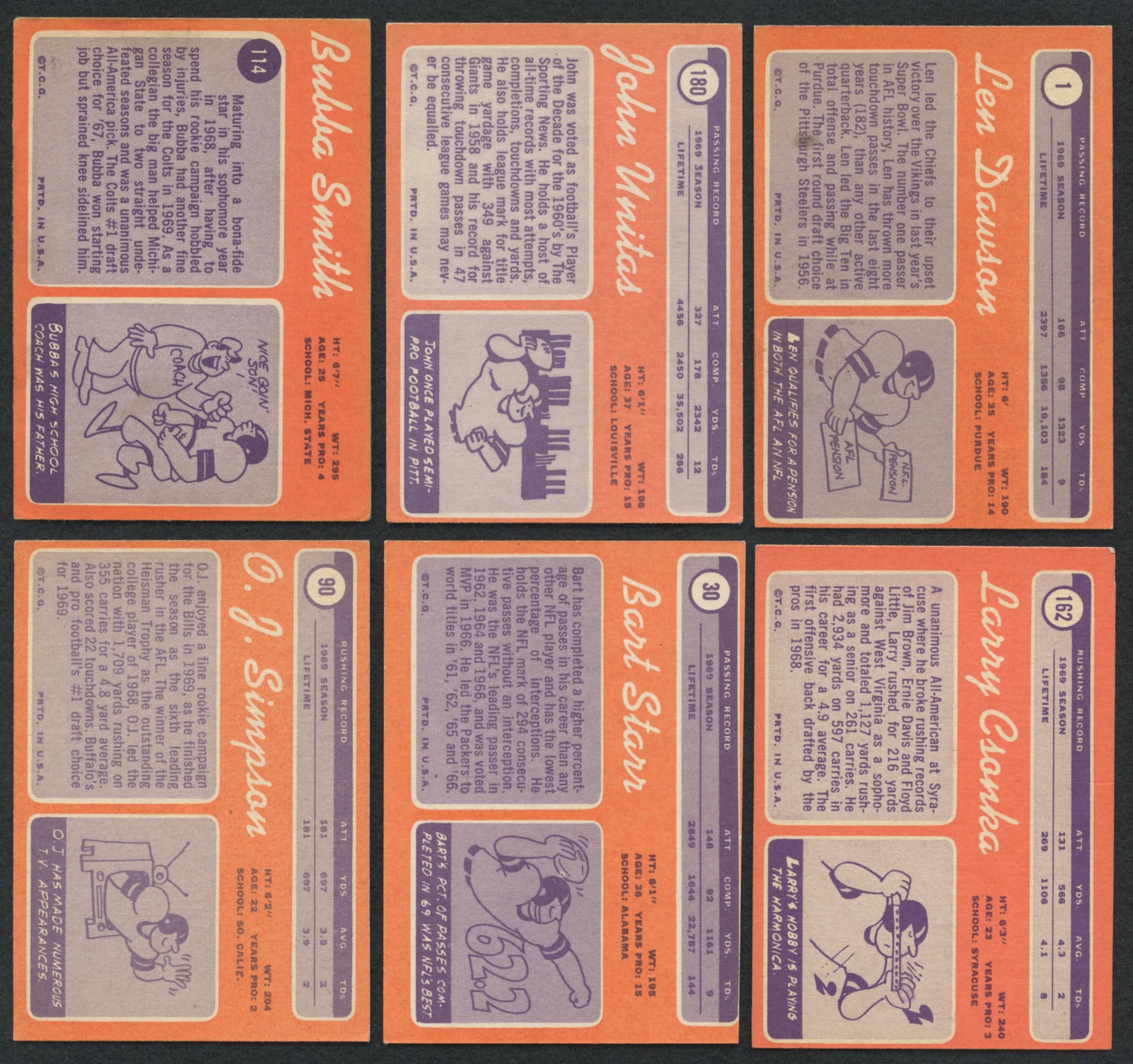 Key cards include #90 O.J. Simpson RC, #150 Joe Namath, #59 Alan Page RC, #30 Bart Starr, #70 Gale Sayers, #114 Bubba Smith RC, #180 Johnny Unitas, #190 Dick Butkus, #1 Len Dawson, #162 Larry Csonka.