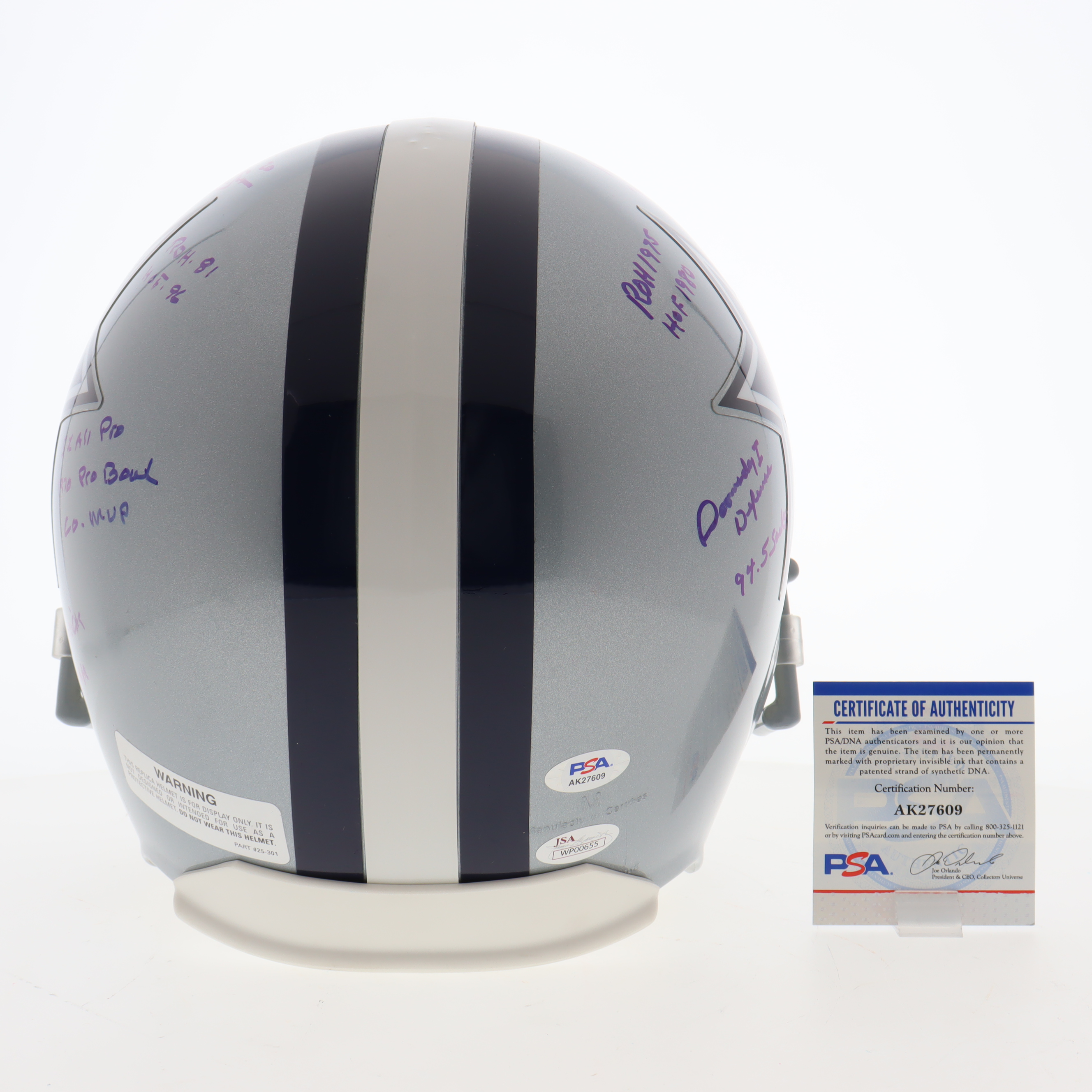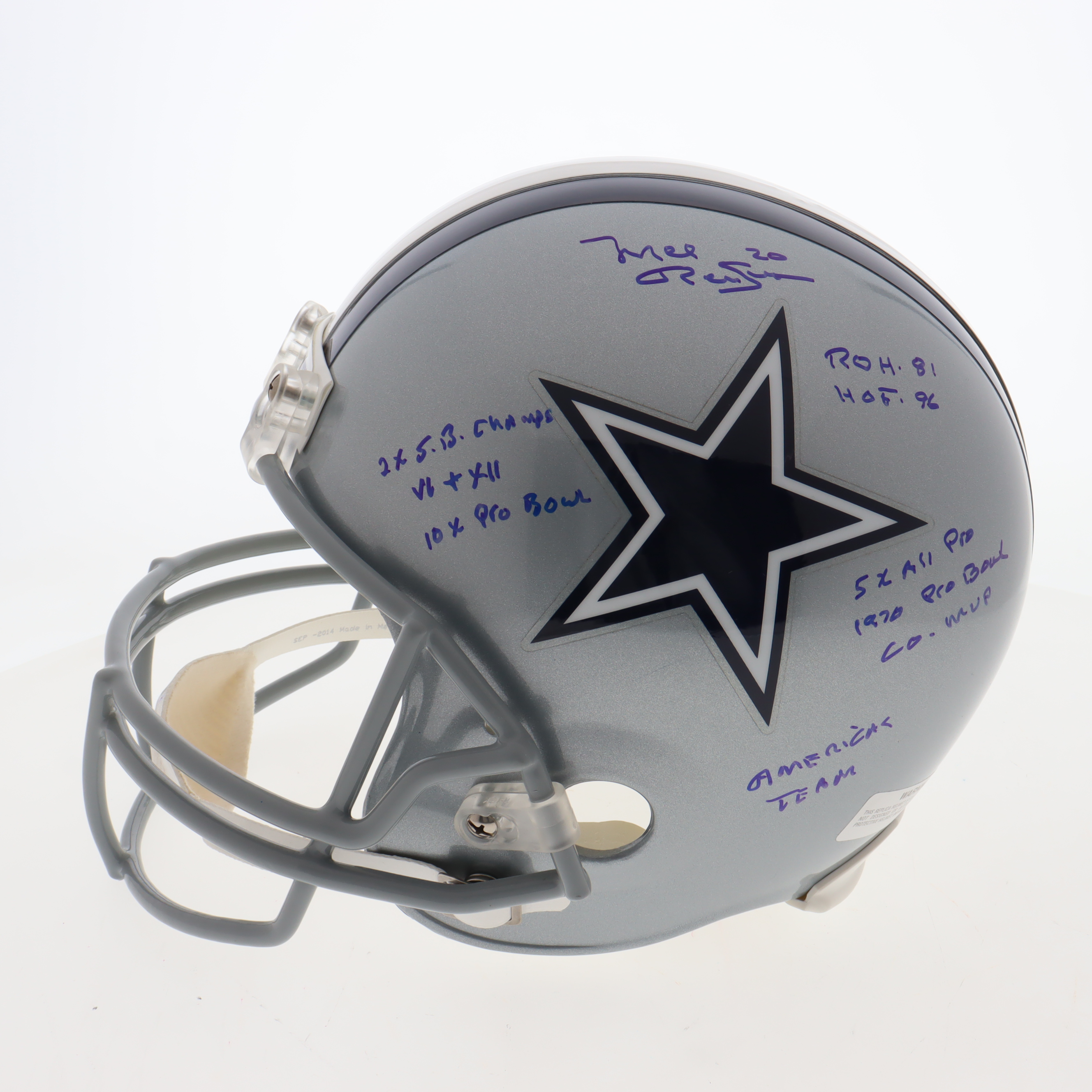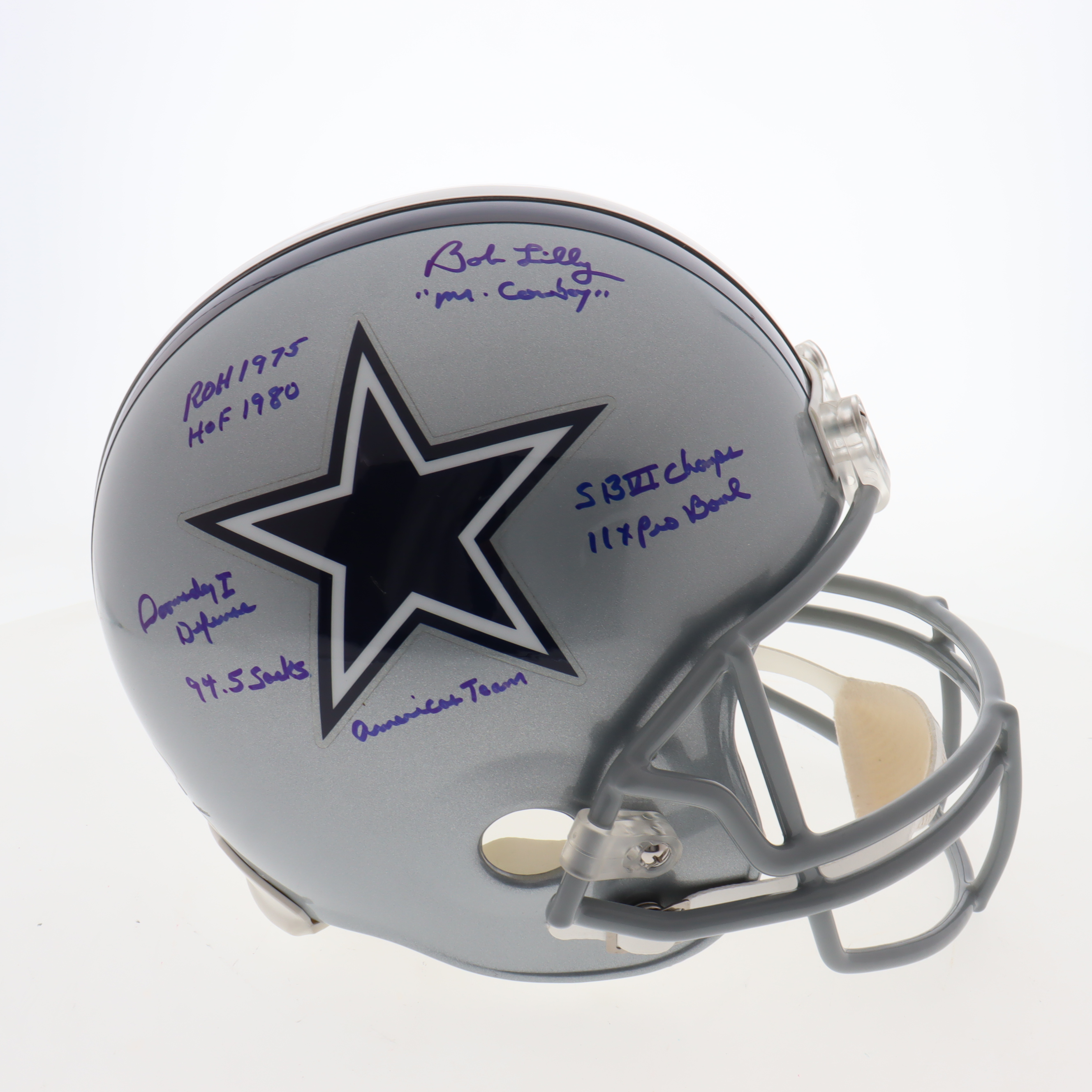 Riddell Dallas Cowboys Full-size authentic helmet. Hand-signed and inscribed by Bob Lilly (HOF) and Mel Renfro (HOF).
