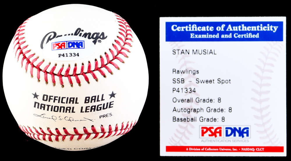 Rawlings Official National League baseball graded PSA 8. Hand-signed and inscribed by Stan Musial (D. 2013, St. Louis Cardinals, HOF).