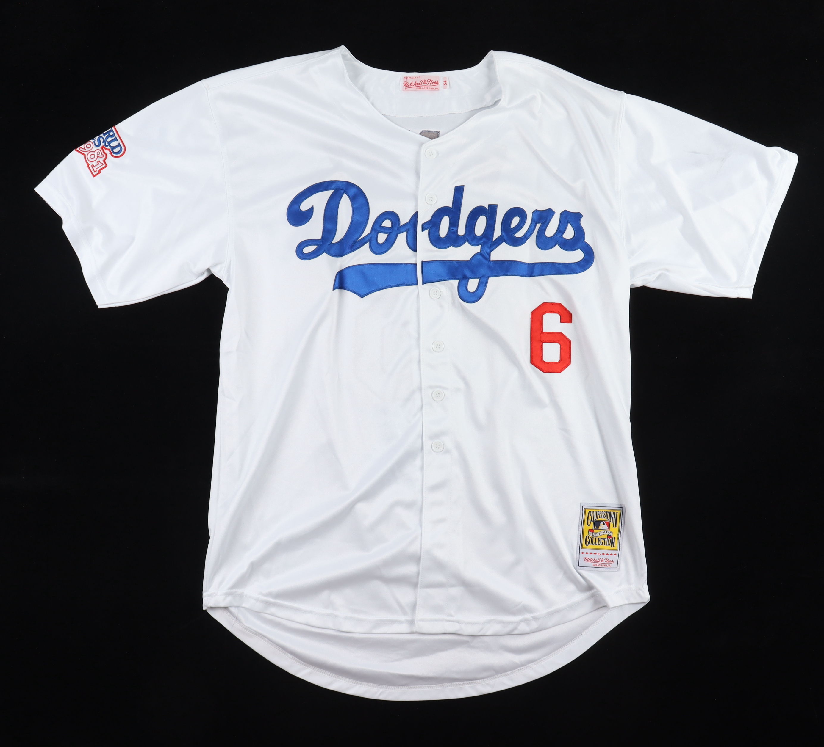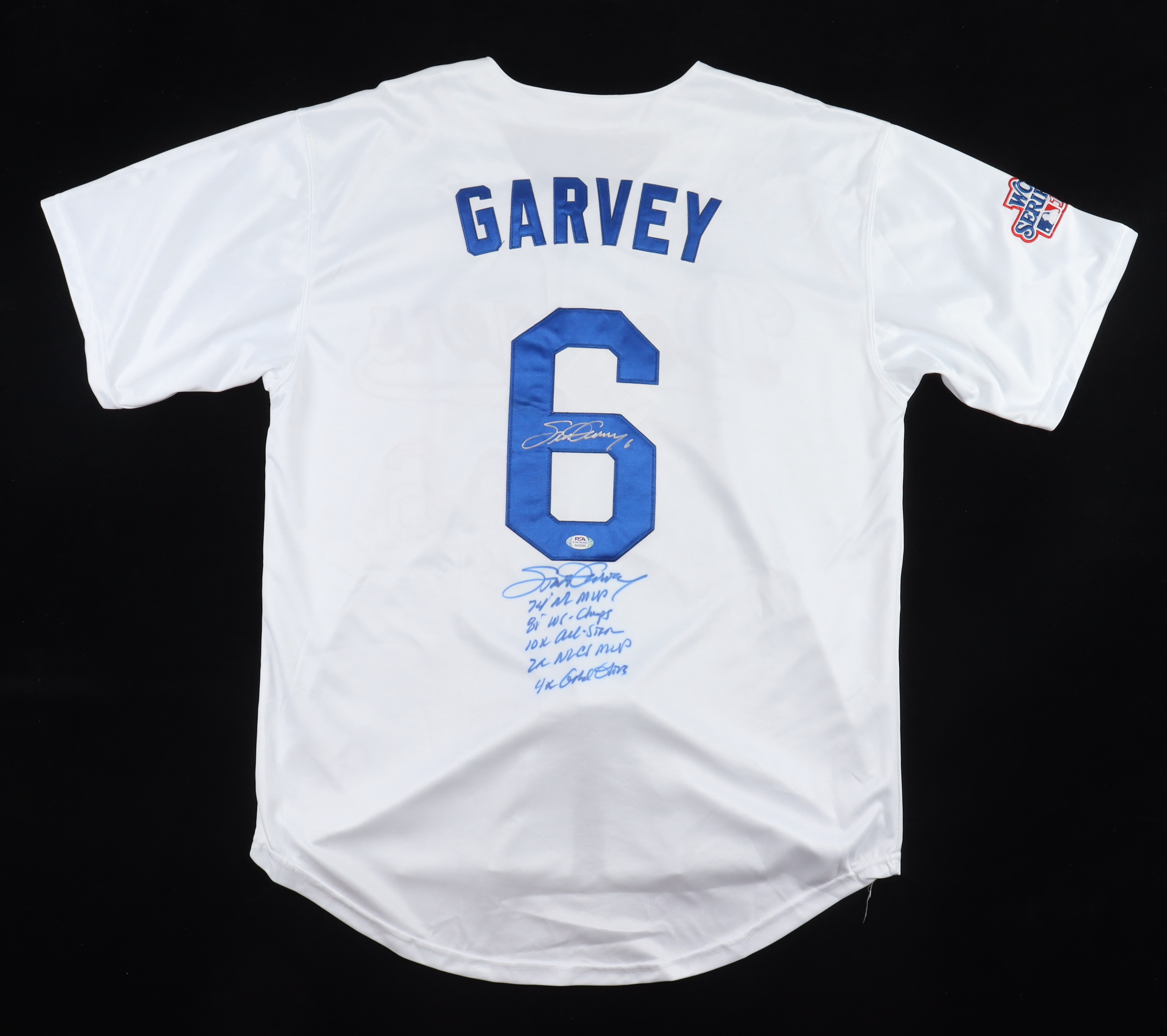 Mitchell & Ness baseball jersey. Everything sewn on, size XL. Hand-signed and inscribed by Steve Garvey (Los Angeles Dodgers).