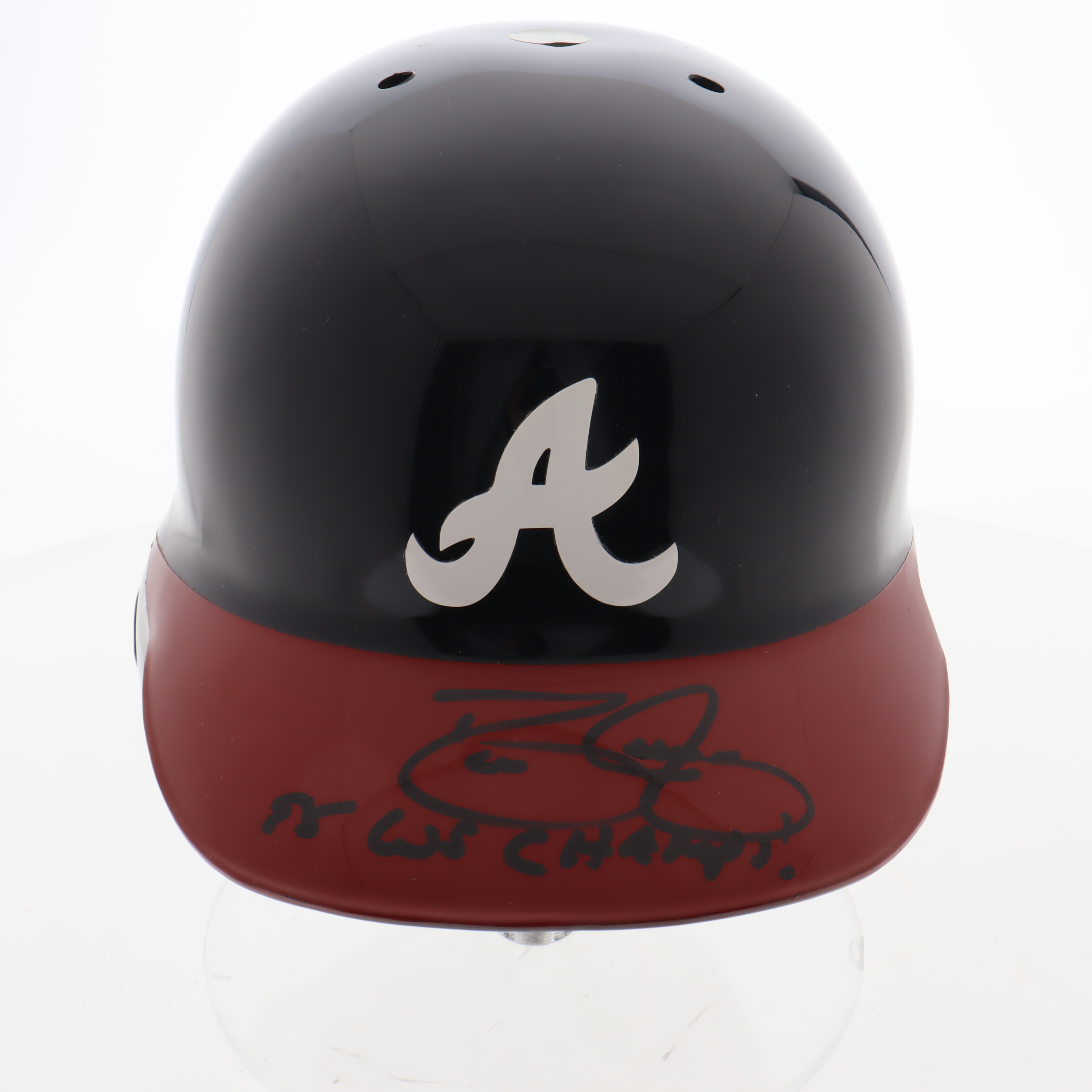Rawlings Atlanta Braves full-size authentic, on-field batting helmet. Hand-signed and inscribed by David Justice.