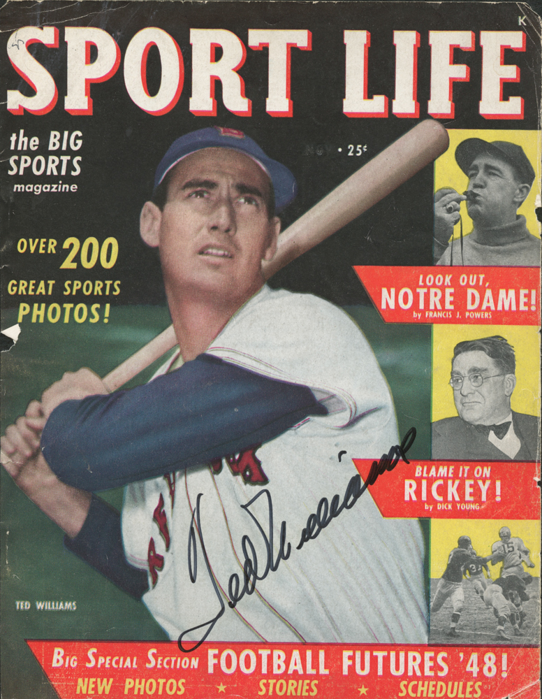 Magazine cover page measures approximately 8.5" x 11" in size. Hand-signed in black felt-tip pen by Ted Williams (D 2002, Red Sox HOF).