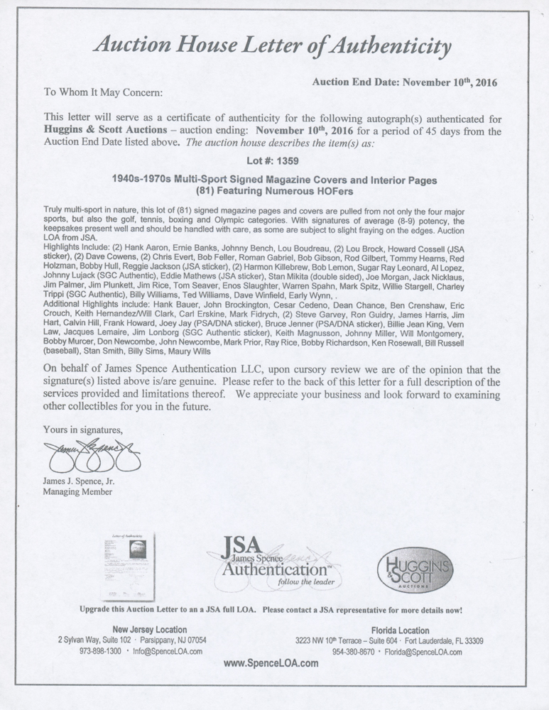 The autograph includes a James Spence Authentication (JSA) Auction House LOA for authenticity purposes.