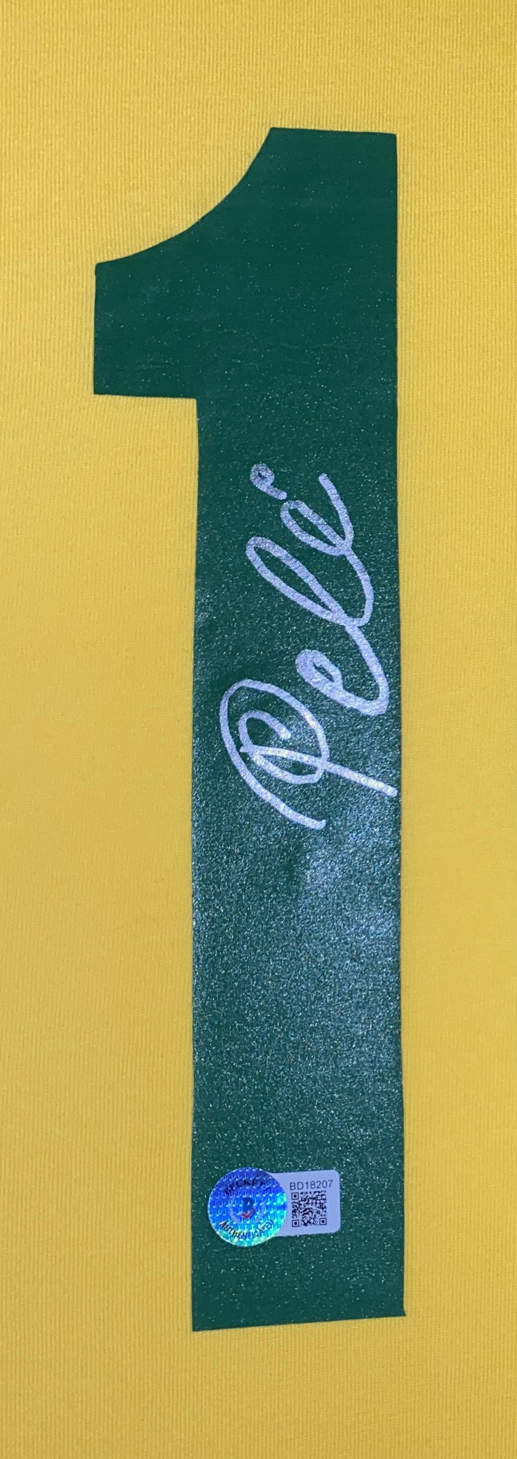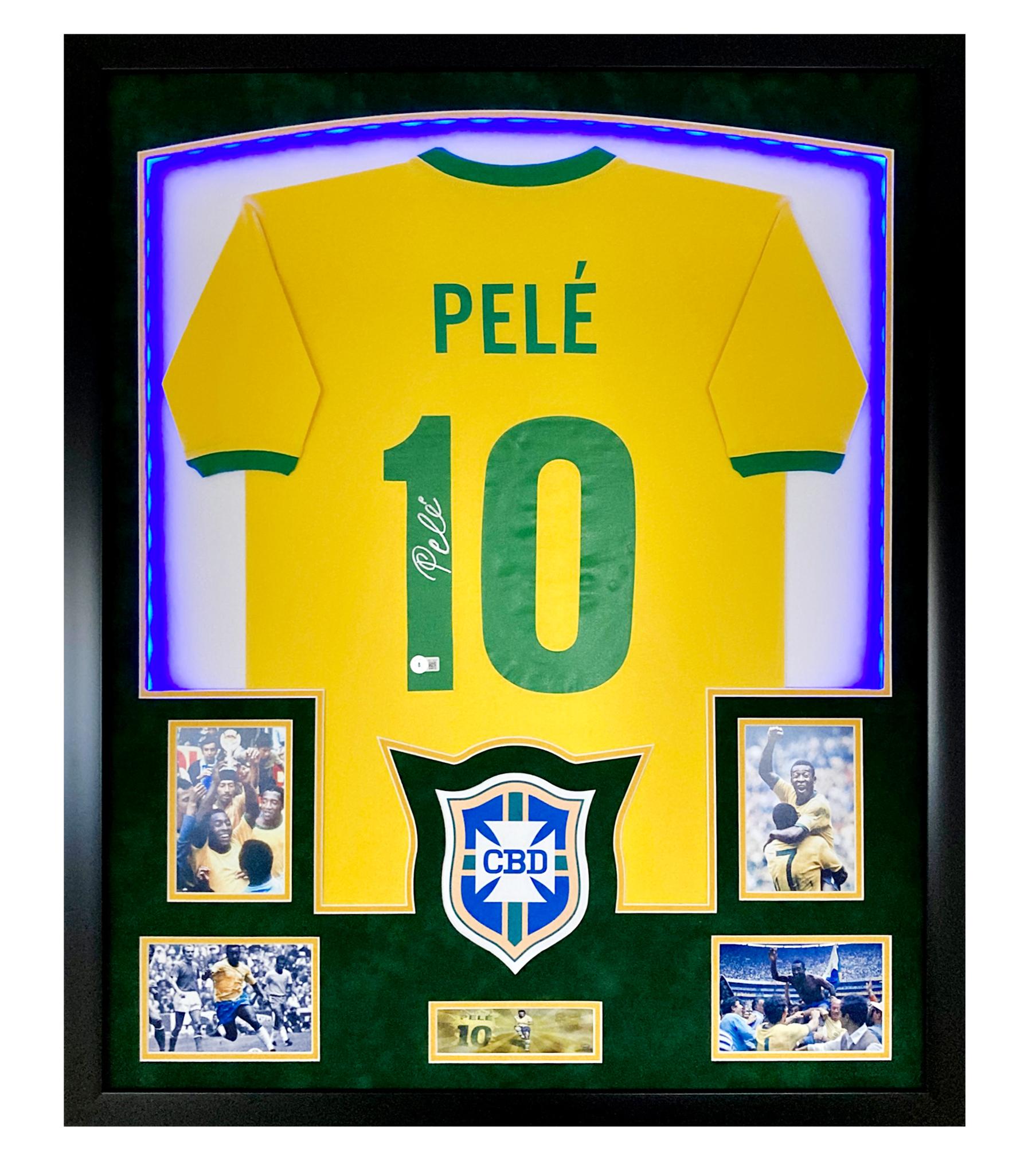 Custom framed, LED back-lit display measures 33" x 42" in size. Features a Brazil National Team jersey that has been hand-signed by Pele (D.2022). USB Powered Bluetooth LED Lights are controlled by an app.