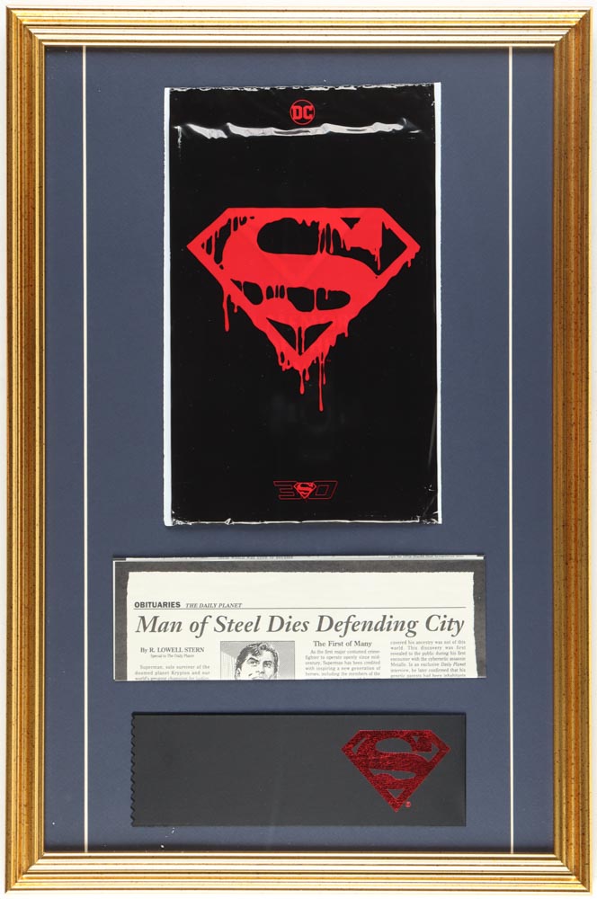 Custom framed measures 16" x 24" in size and features a factory sealed "The Death of Superman" 30th Anniversary comic book, as well as an original Superman cloth ribbon and a "The Daily Planet" newspaper clipping.