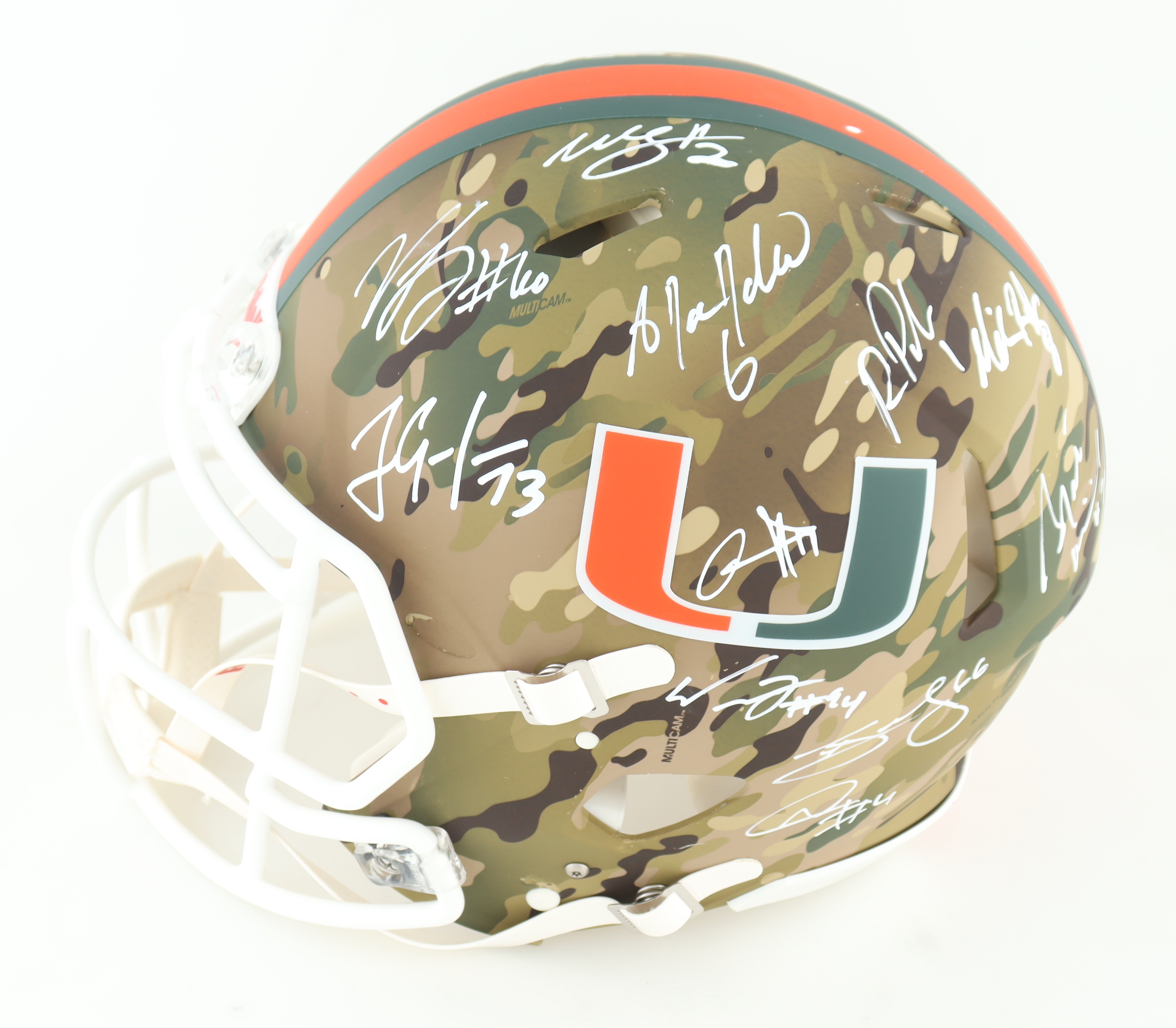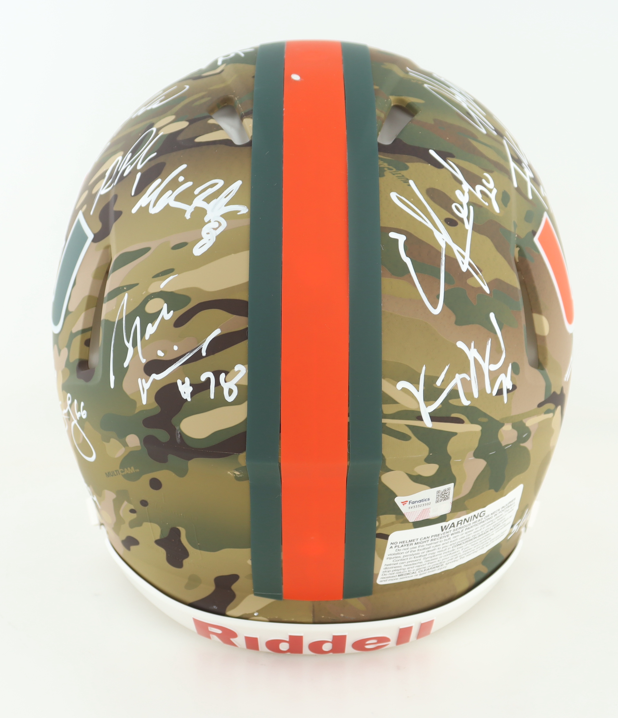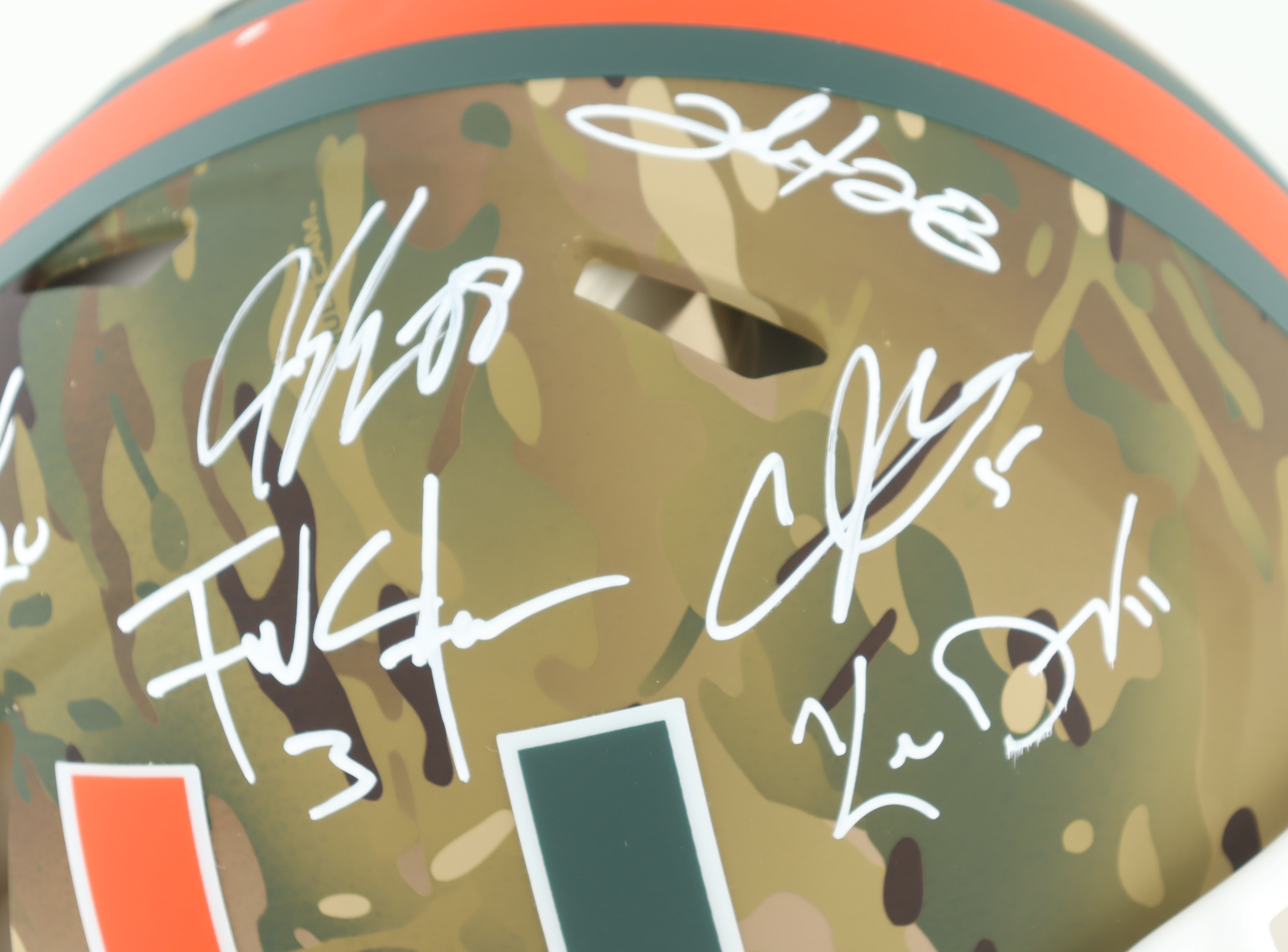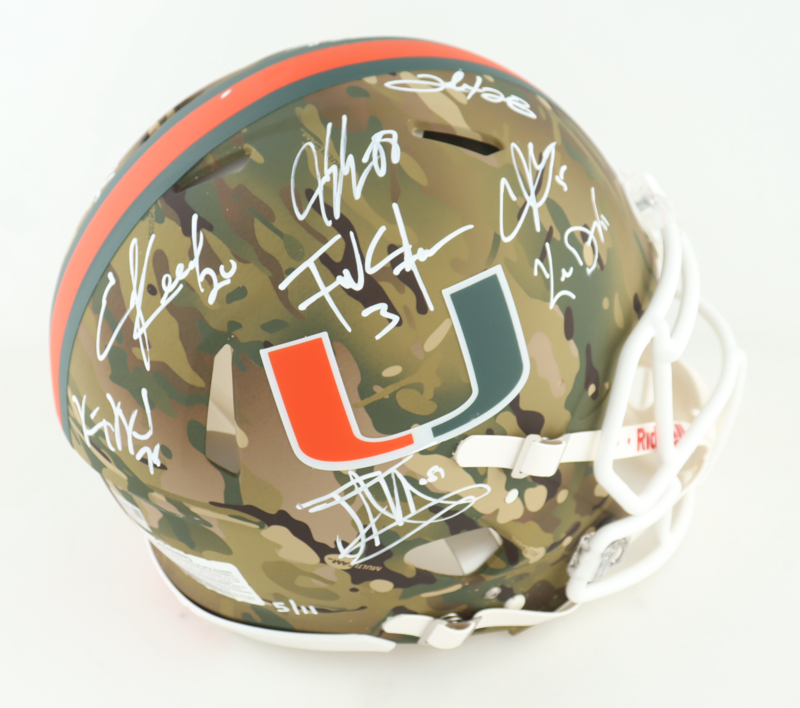 Riddell Miami Hurricanes full-size Authentic On-Field camo speed helmet. Hand-signed by (19) members of the 2001 Miami Hurricanes including