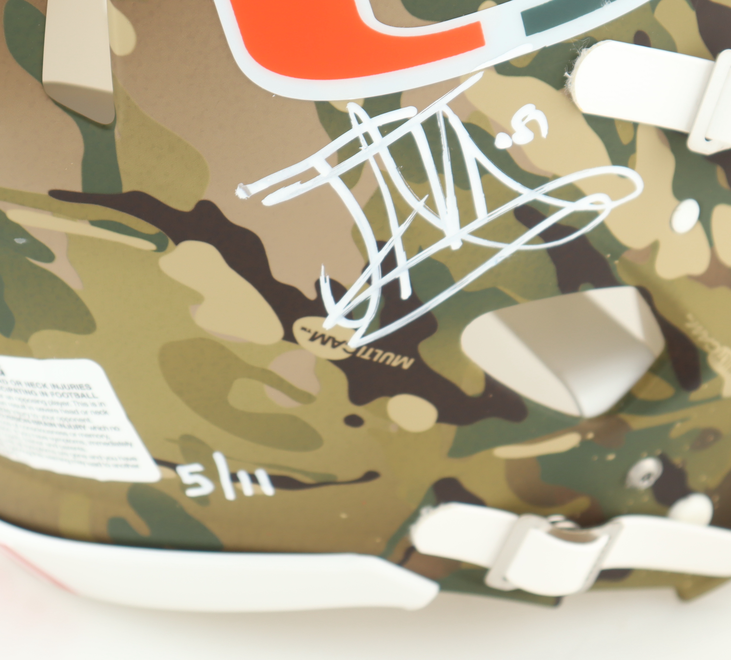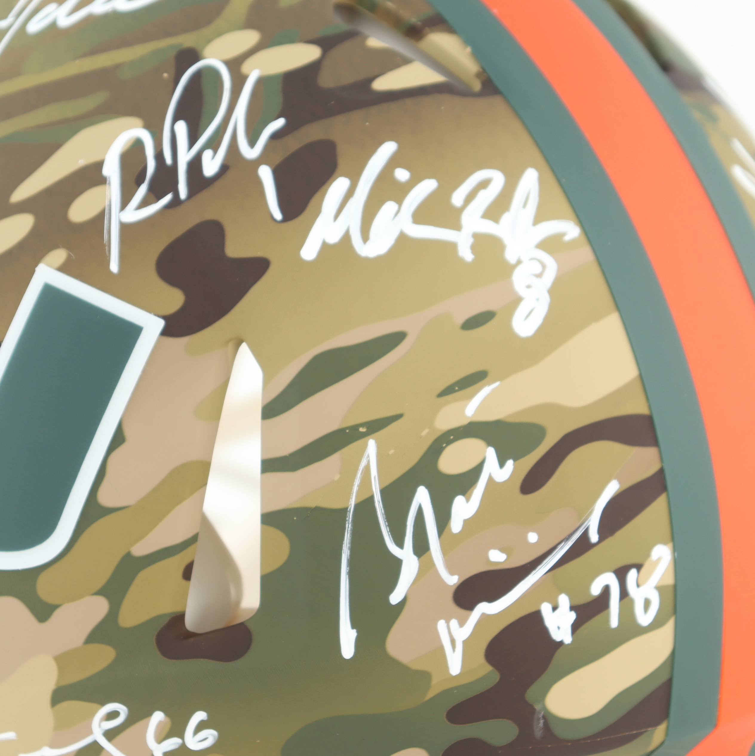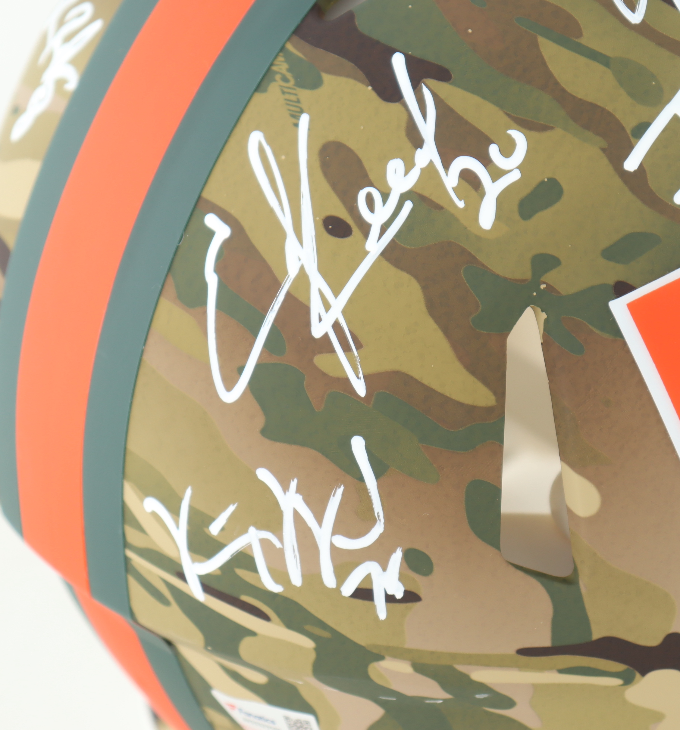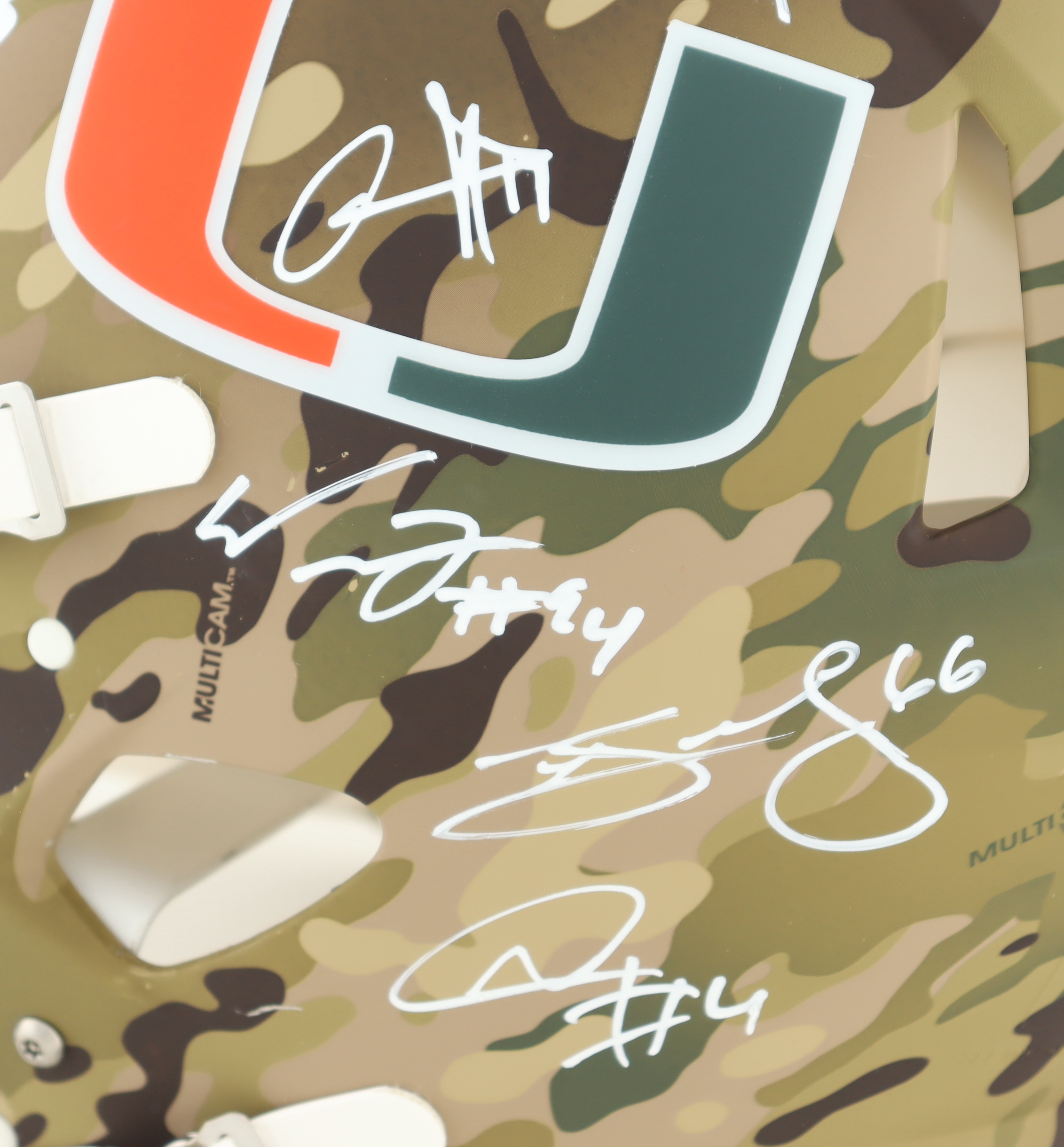 Riddell Miami Hurricanes full-size Authentic On-Field camo speed helmet. Hand-signed by (19) members of the 2001 Miami Hurricanes including
