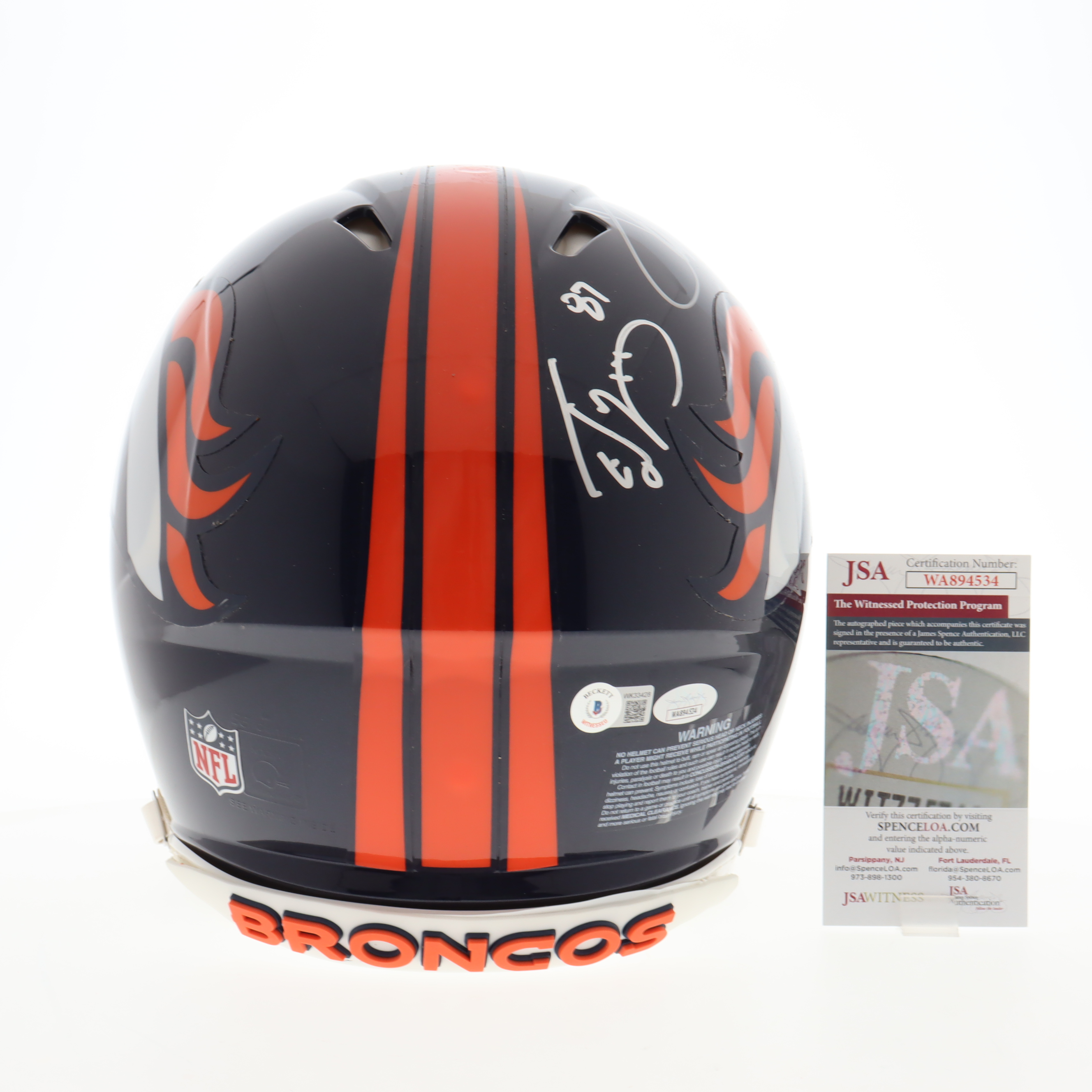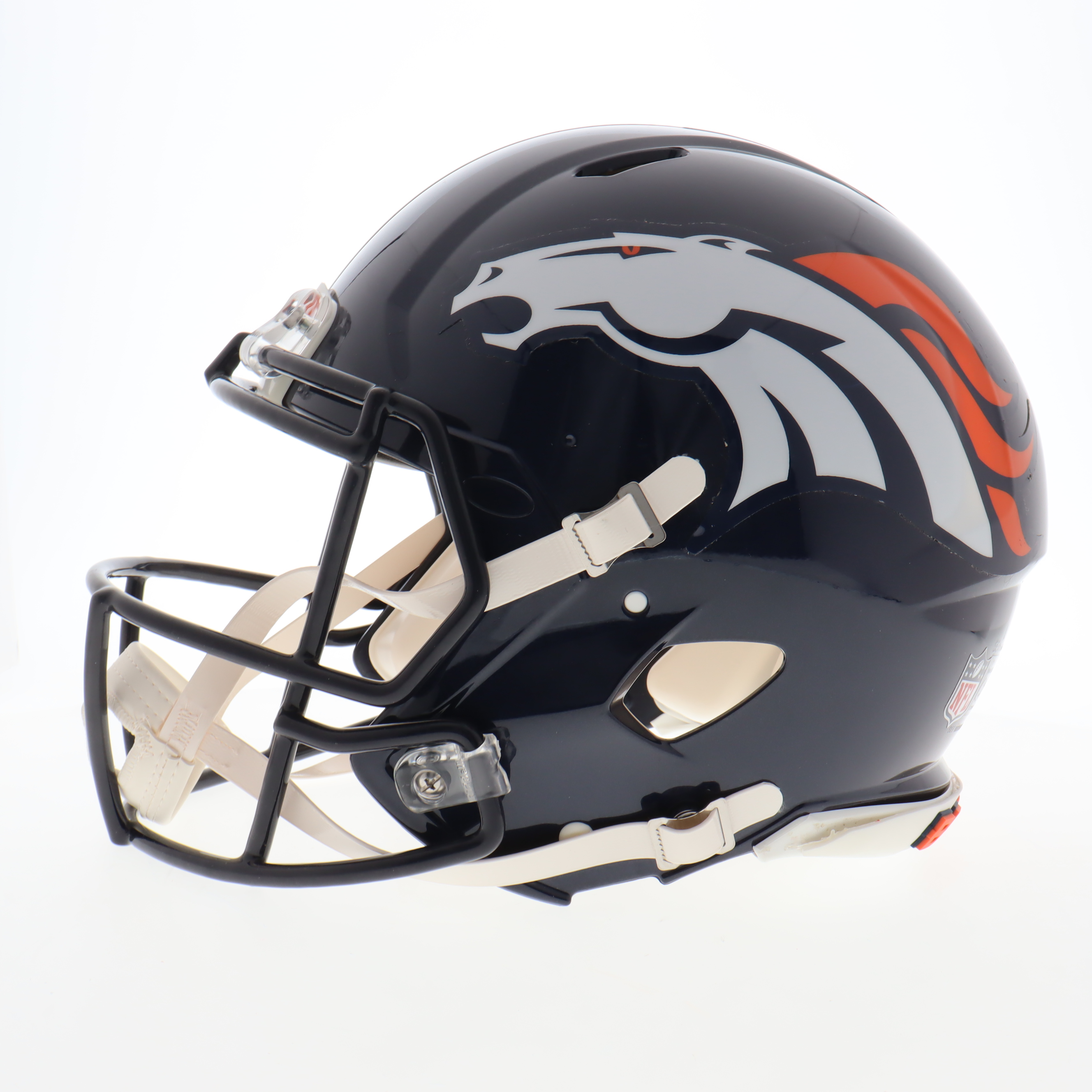Riddell Denver Broncos full-size authentic on-field Speed helmet. Hand-signed and inscribed by Terrell Davis (HOF) and Ed McCaffrey.