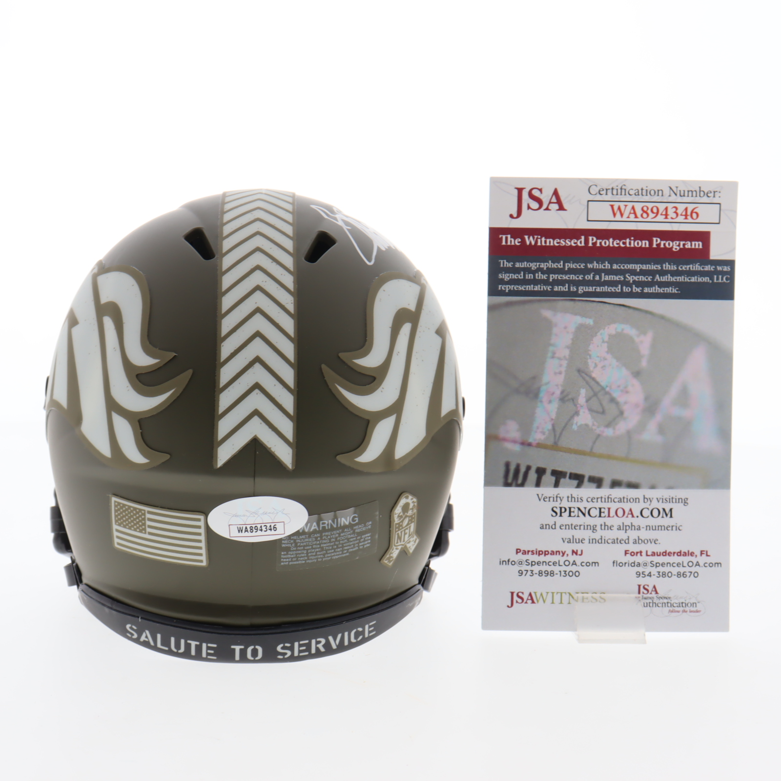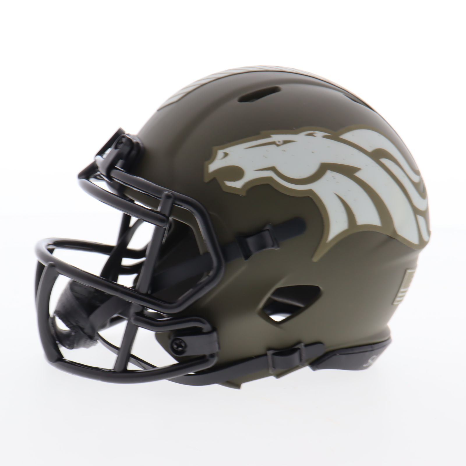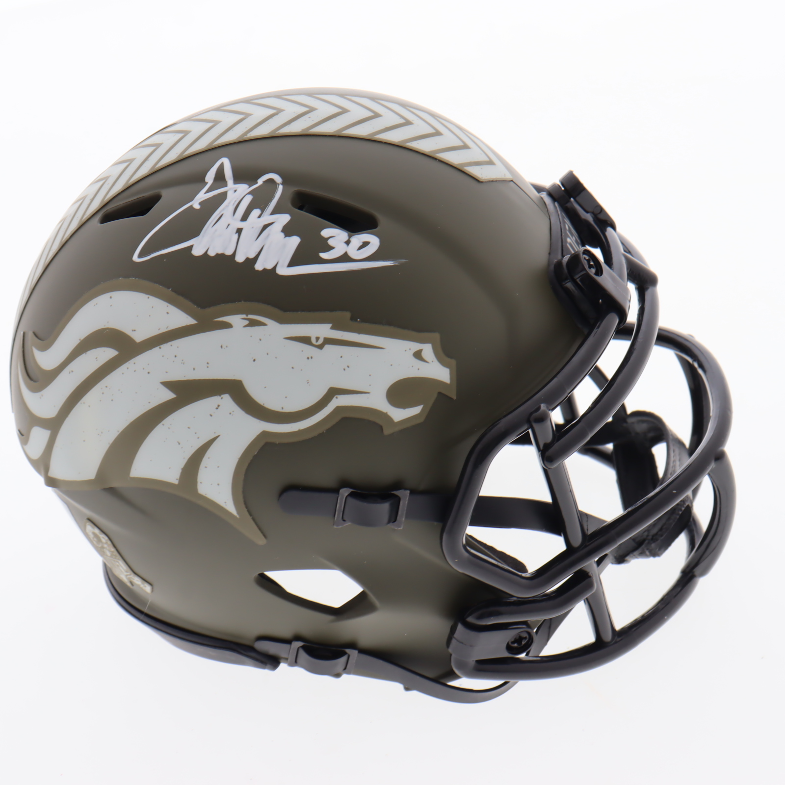 Riddell Denver Broncos Salute to Service Alternate Speed mini helmet has been hand-signed by Terrell Davis (HOF).