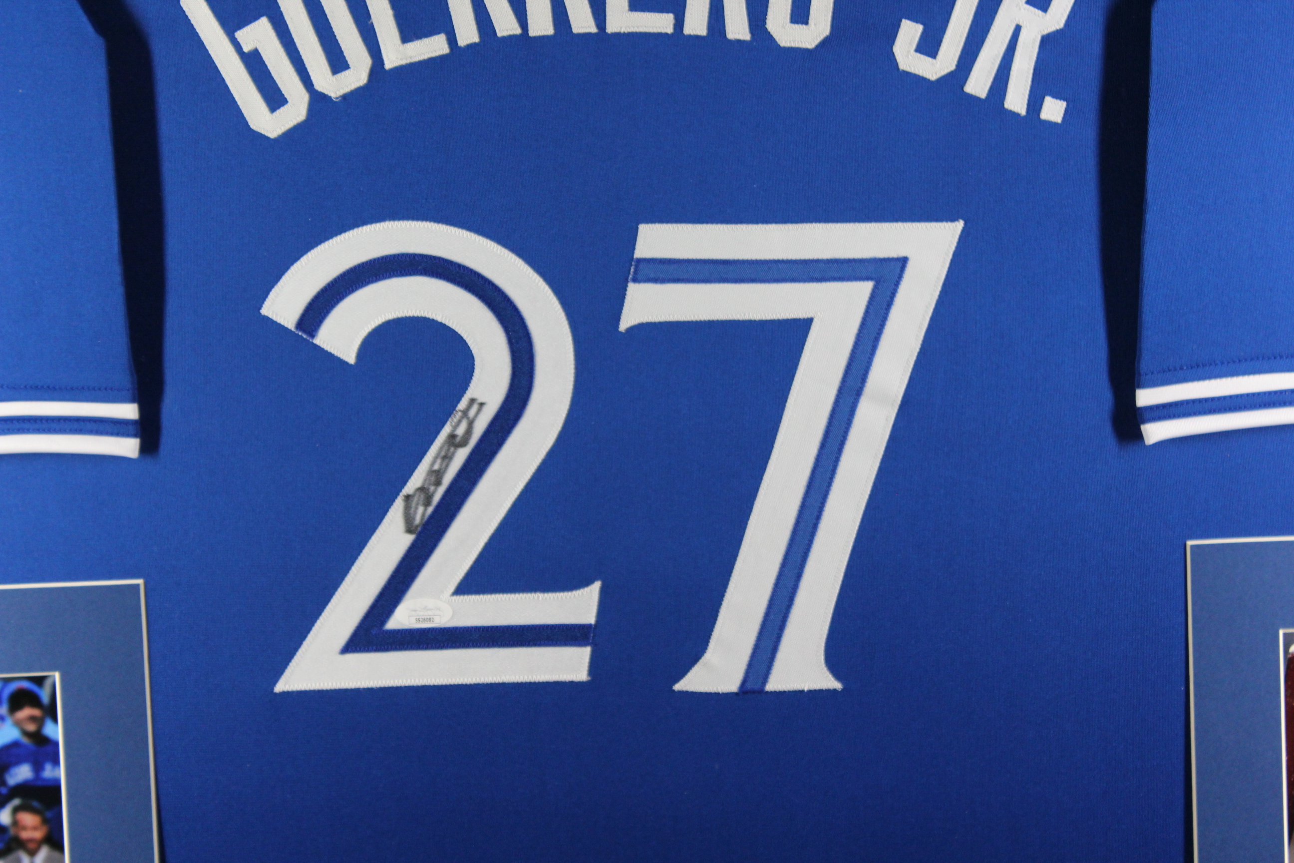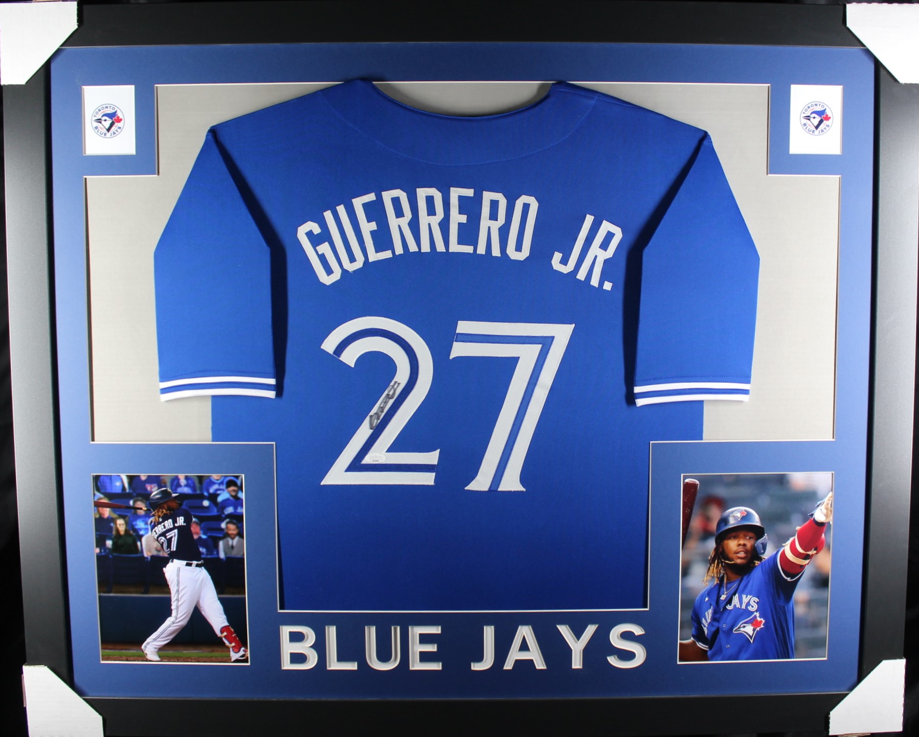 Custom frame measures approximately 35" x 43" in size and features a jersey hand-signed by Vladimir Guerrero Jr.