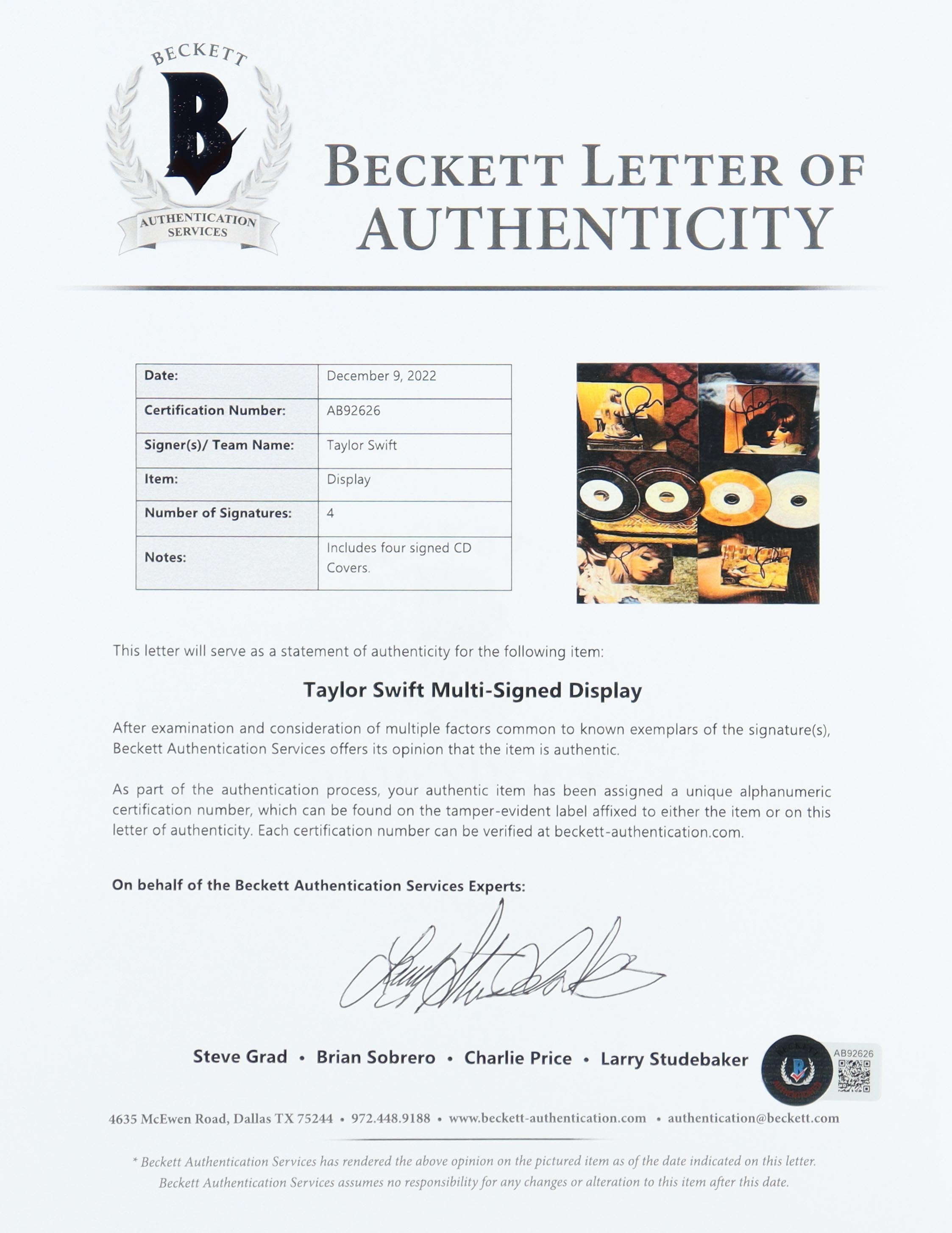 Custom frame measures approximately 35" x 35" in size. Features (4) CD album inserts that have all been hand-signed by Taylor Swift. The display includes (4) CDs and album art.