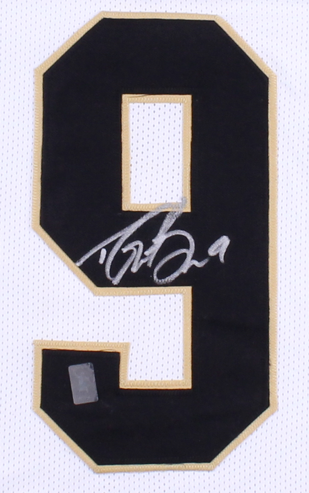 Custom on-field style jersey. Everything is sewn on, size XL. Hand-signed in silver paint pen by Drew Brees.