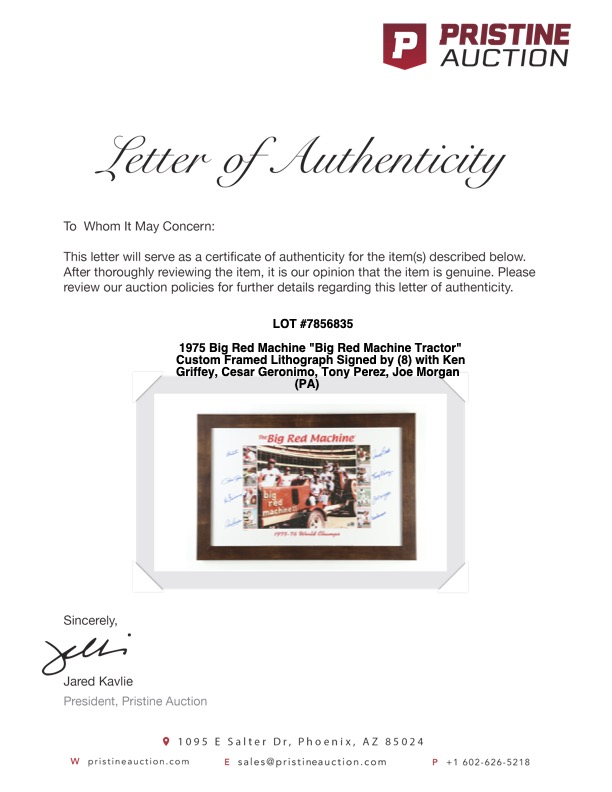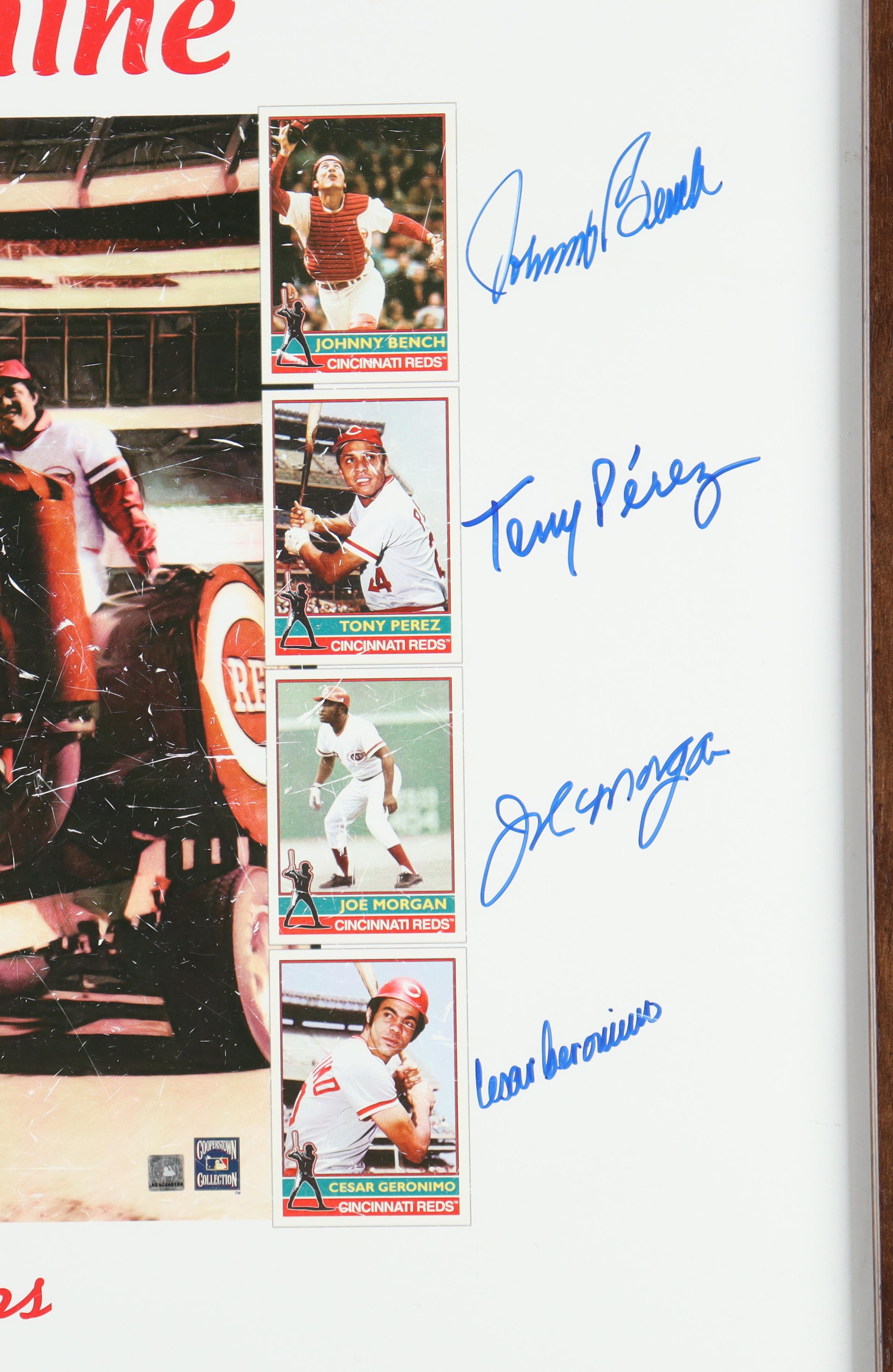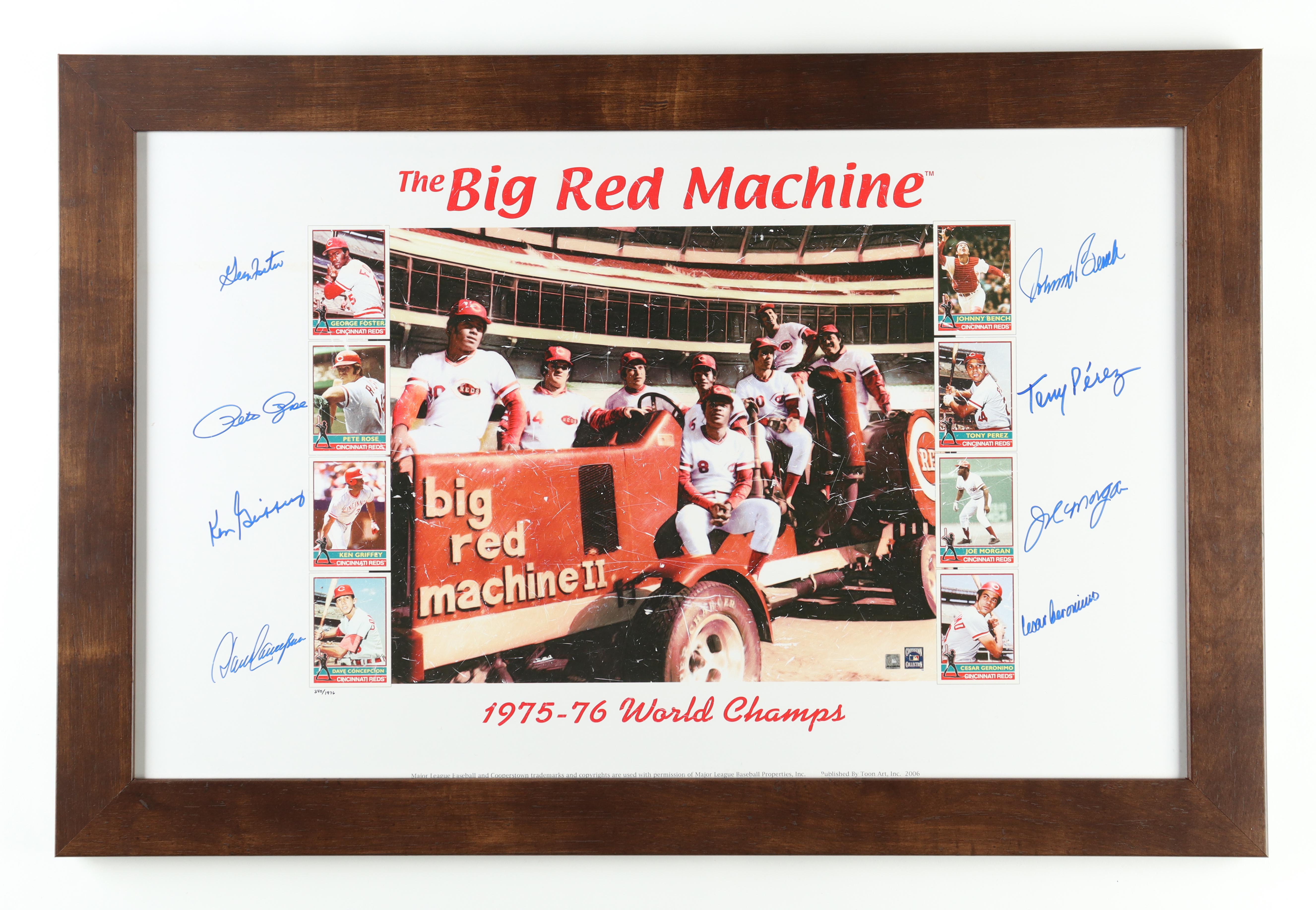 "Big Red Machine Tractor" is a lithograph featuring signatures from the Big Red Machine's starting eight; Johnny Bench (c), Tony Perez (1b), Joe Morgan (2b), Dave Concepcion (ss), Pete Rose (3b), Ken Griffey (rf), Cesar Geronimo (cf) and Geoge Foster (lf). The Reds became the first NL team since the 1921-1922 New York Giants to win consecutive World Series championships. The Big Red Machine of 1975-1976 is considered one of the best teams ever. This piece comes framed. Includes Certificate of Authenticity. Measures approximately 21" x 31.5" in size.