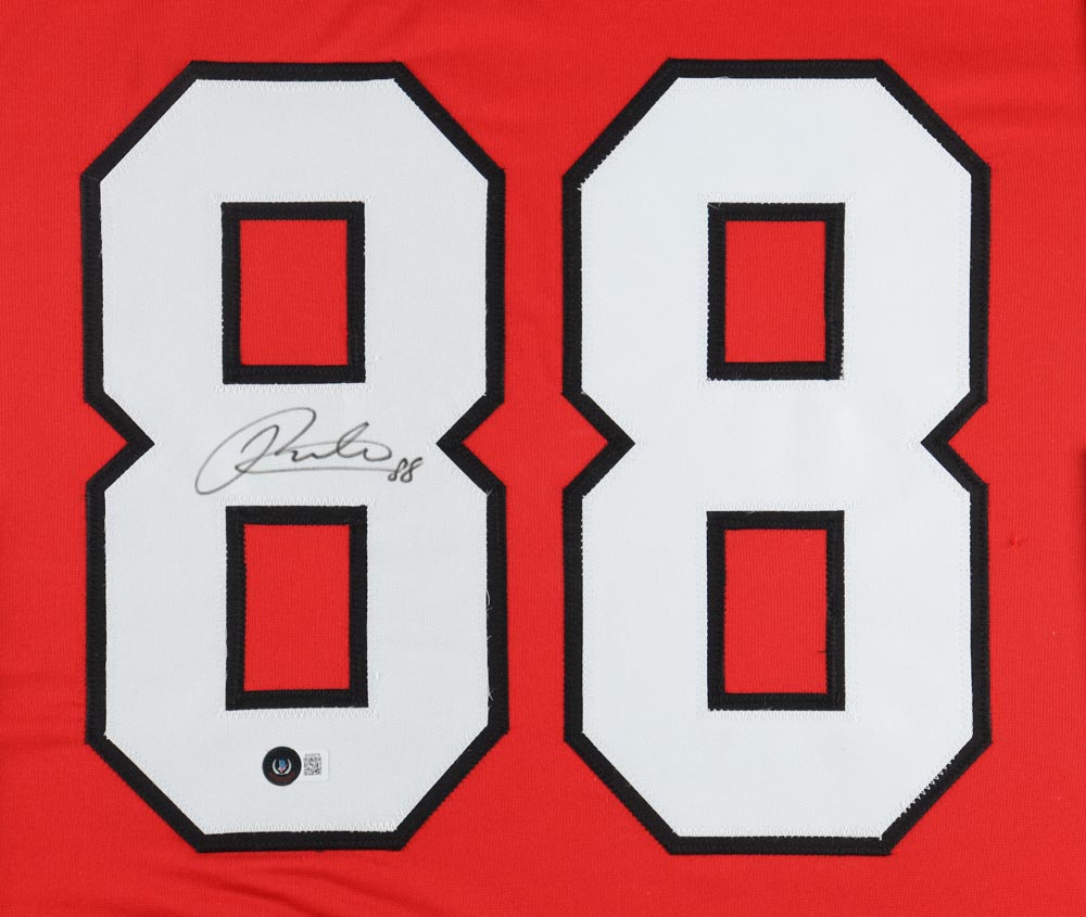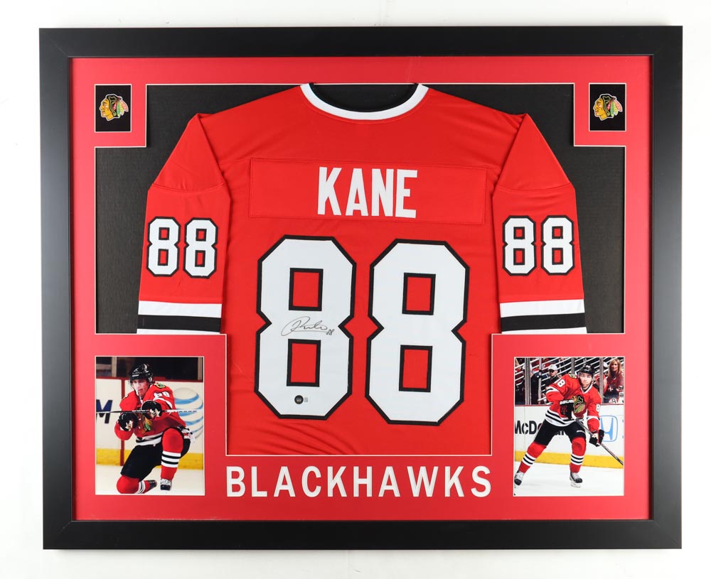 Custom frame measures approximately 35" x 43" in size and features a jersey hand-signed by Patrick Kane.