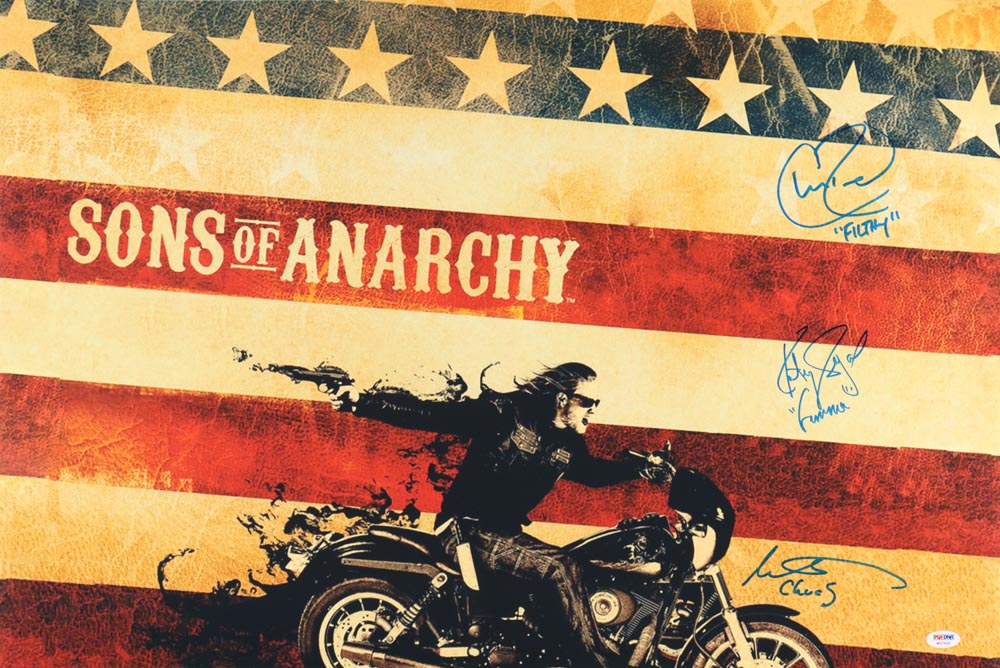 Photo measures 20" x 30" in size and has been hand-signed and inscribed by Katey Sagal (Gemma Teller Morrow), Michael Ornstein (Chucky Marstein) and Chris Reed (Philip 'Filthy Phil' Russell).
