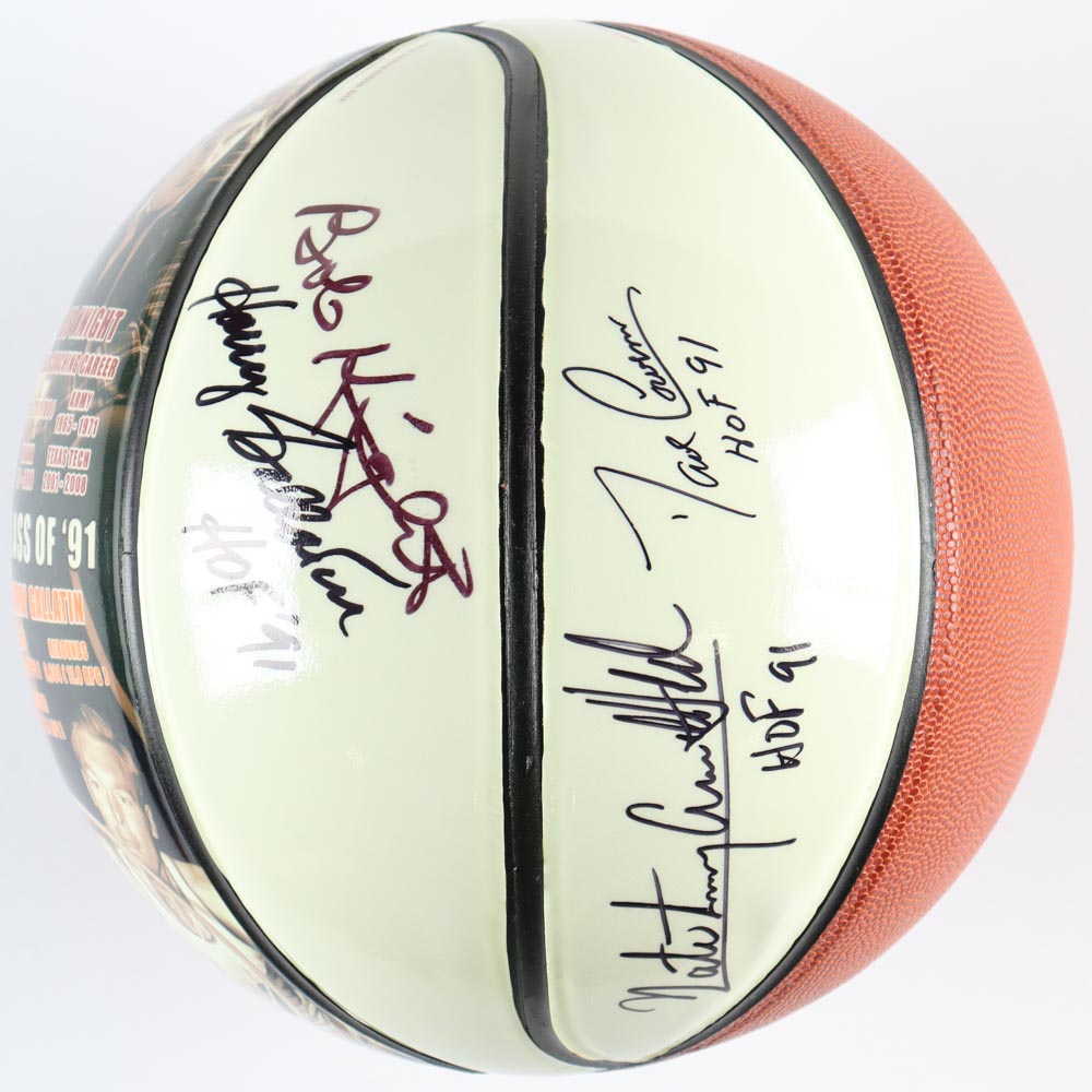 1991 Basketball Hall of Fame Graphic Basketball Signed by (4) with Bob Knight, Dave Cowens, Nate "Tiny" Archibald & Harry Gallatin with (3) Inscriptions (JSA)