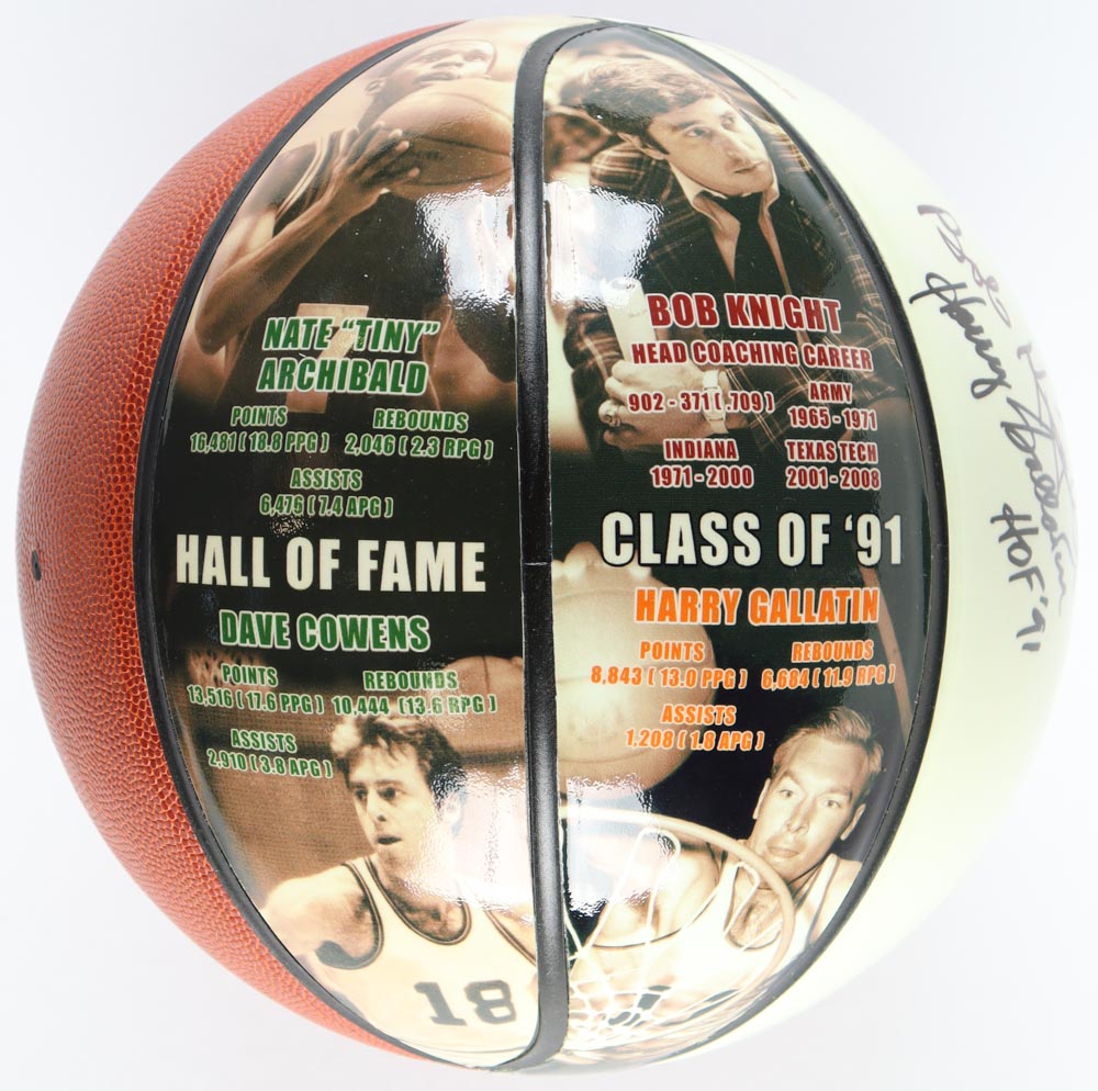 Graphic basketball has been hand-signed and inscribed by (4) with Bob Knight, Dave Cowens, Nate "Tiny" Archibald and Harry Gallatin.