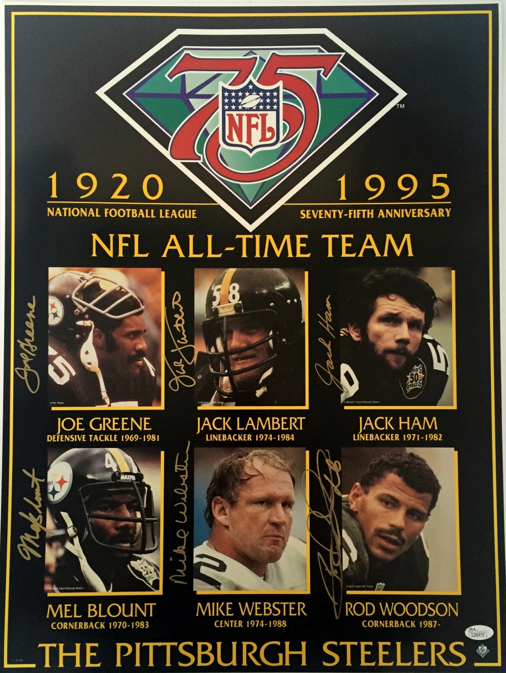 Steelers "75th Anniversary" Poster measures 18" x 24" in size. Has been hand-signed by (6) members of the Pittsburgh Steelers including Joe Greene, Jack Lambert, Jack Ham, Mel Blount, Mike Webster and Rob Woodson.