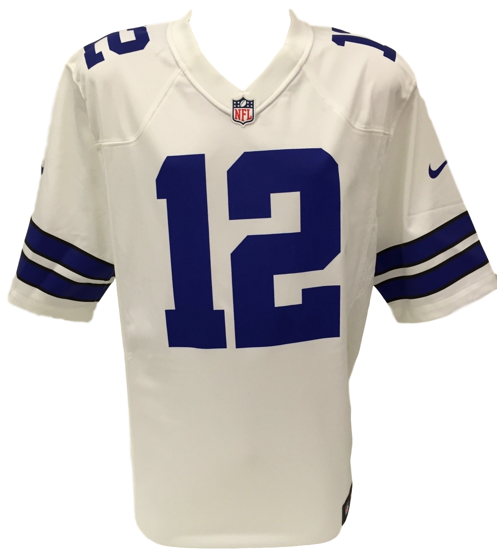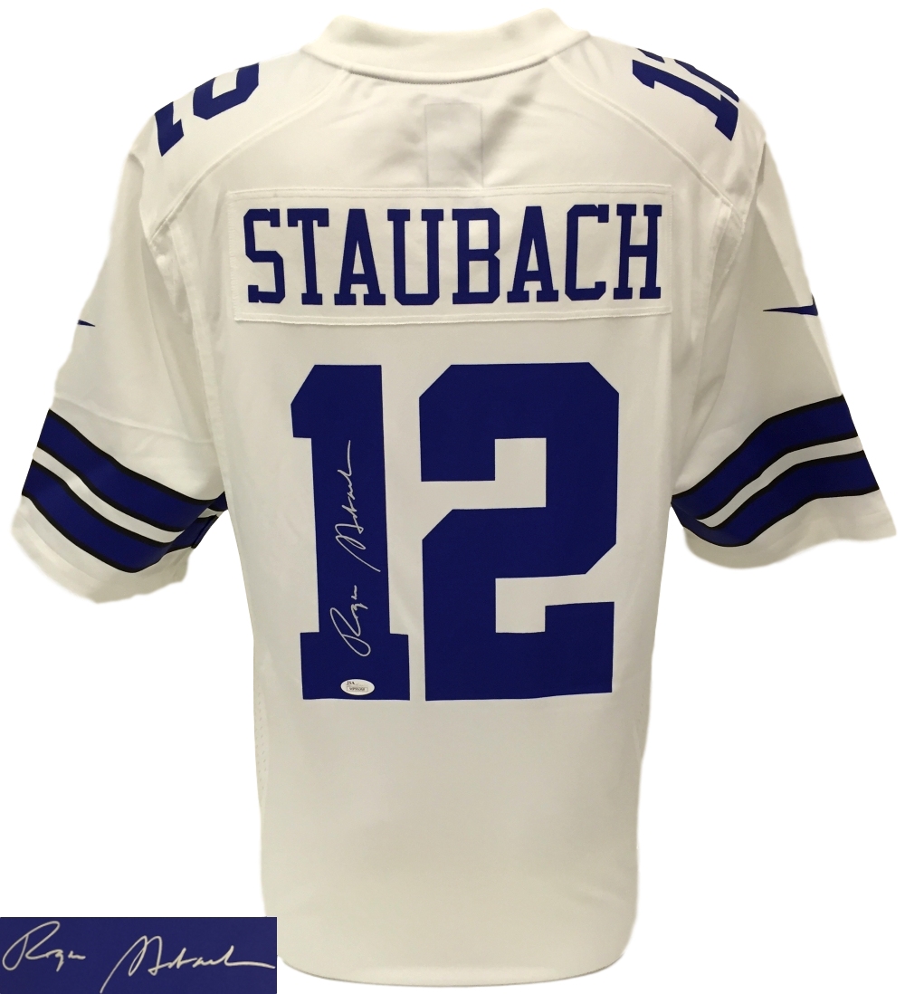 Nike on-field style jersey. Everything is screen printed on, size XL. Hand-signed in silver paint pen by Roger Staubach (HOF).