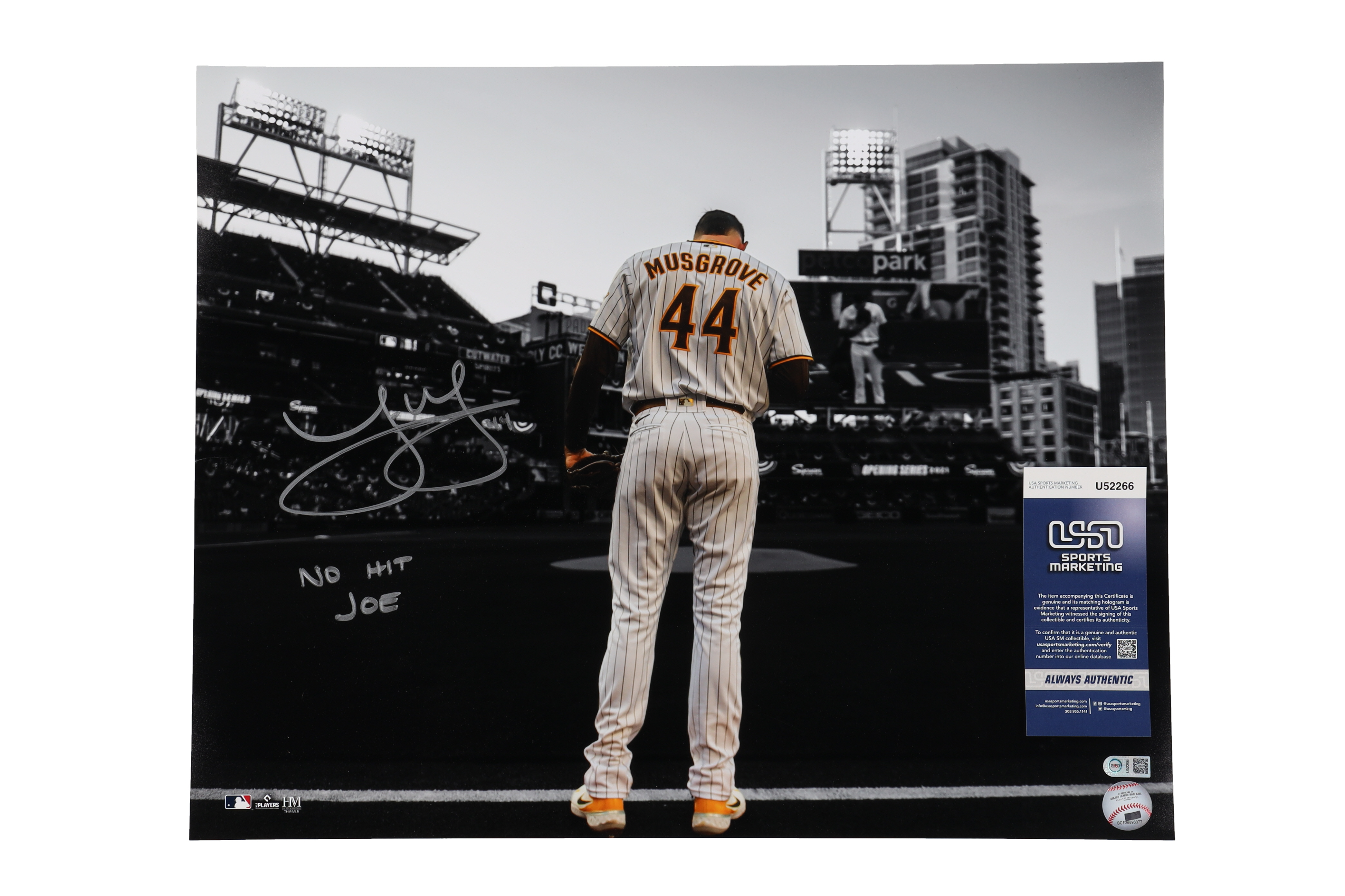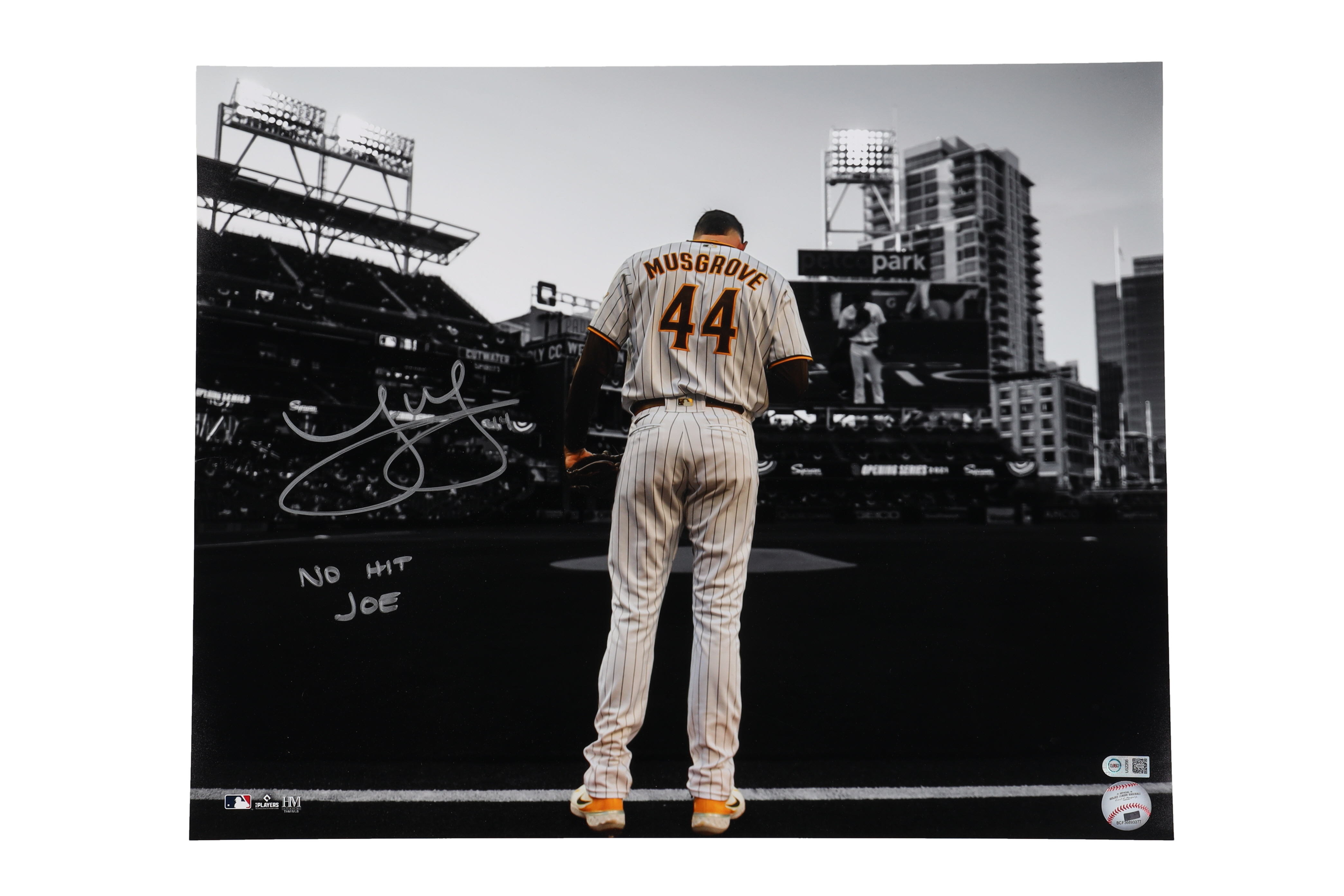 Photo measures 16" x 20" in size and has been hand-signed and inscribed by Joe Musgrove (San Diego Padres).