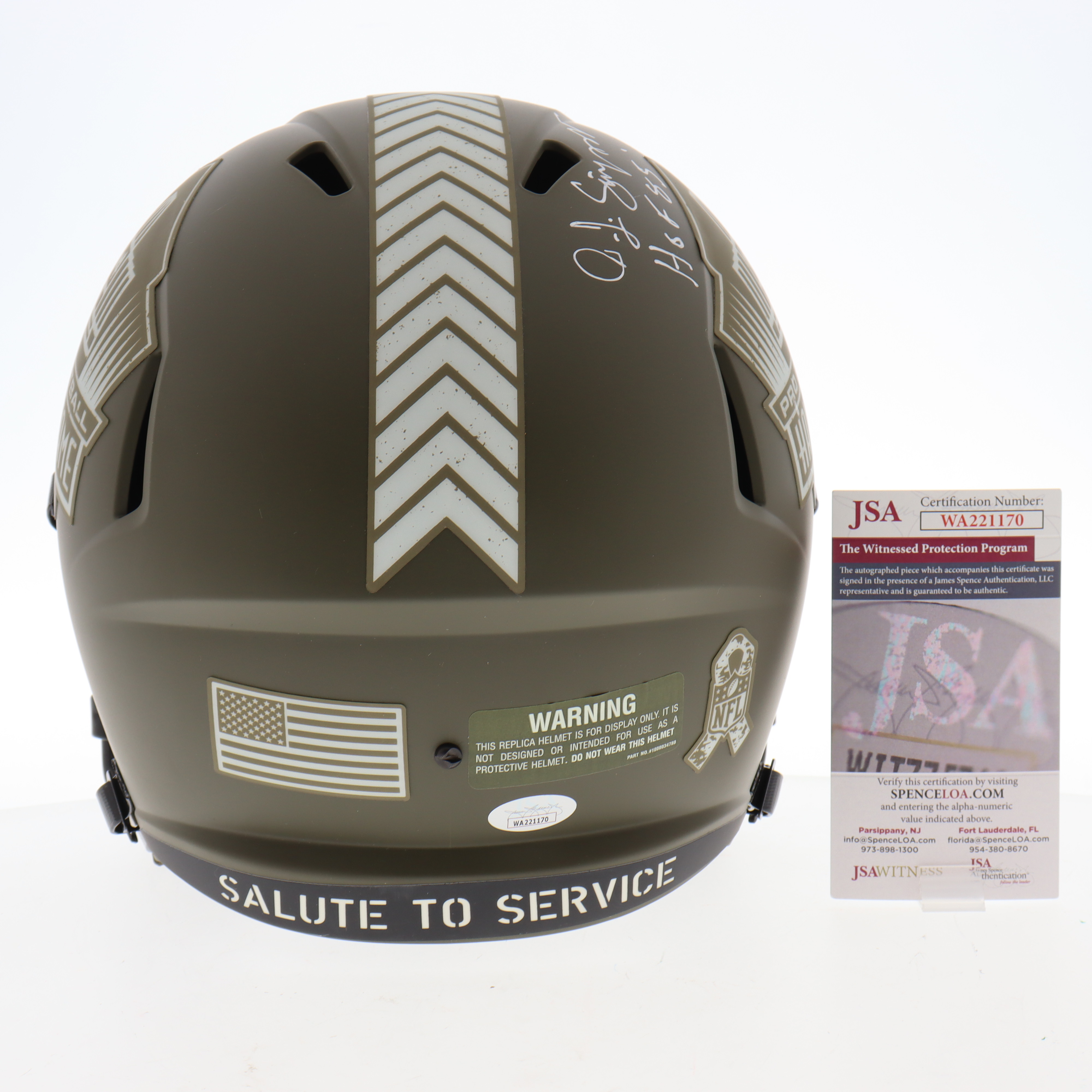 Riddell Pro Football Hall of Fame full-size replica Salute to Service Alternate Speed helmet. Hand-signed and inscribed by O. J. Simpson (Buffalo Bills, HOF).