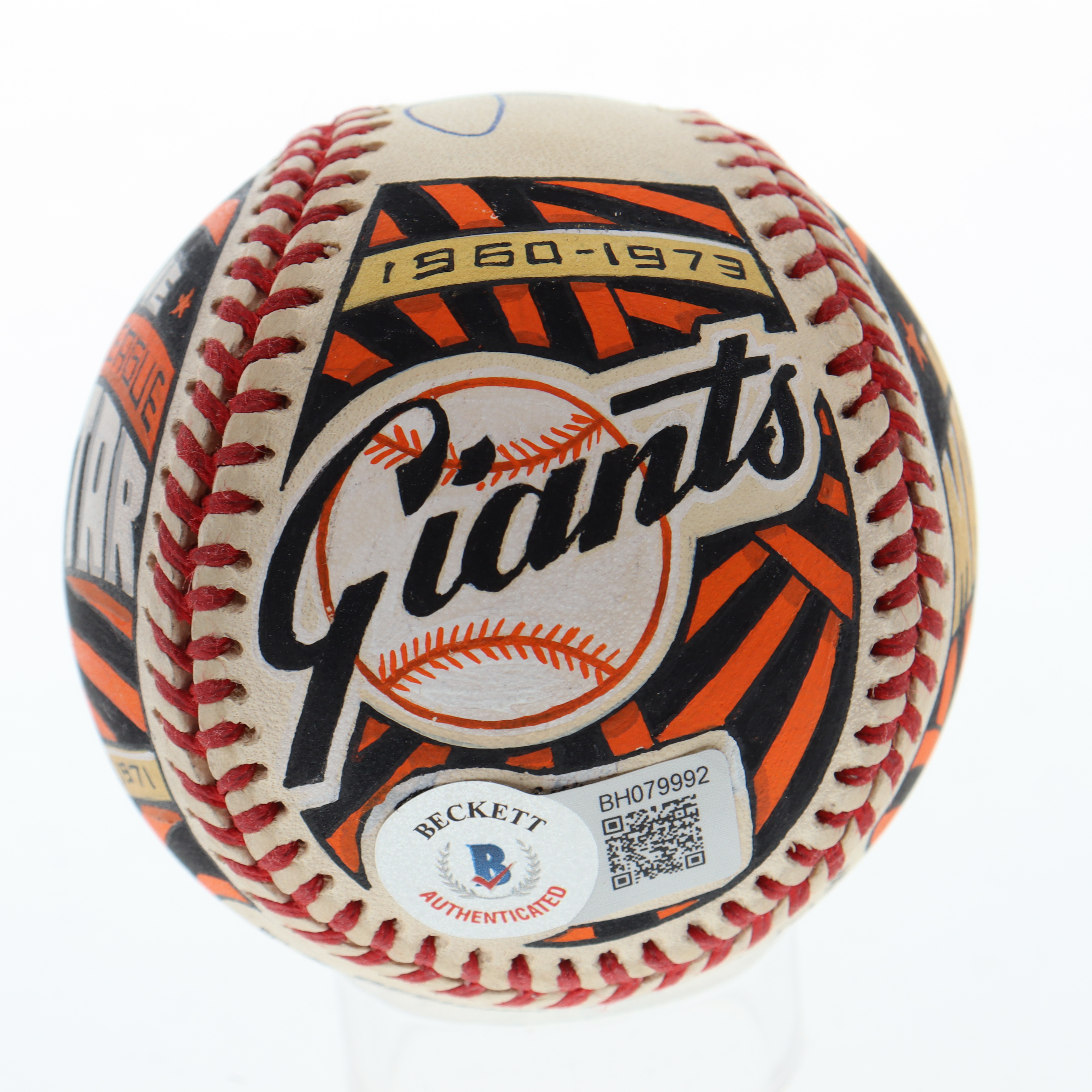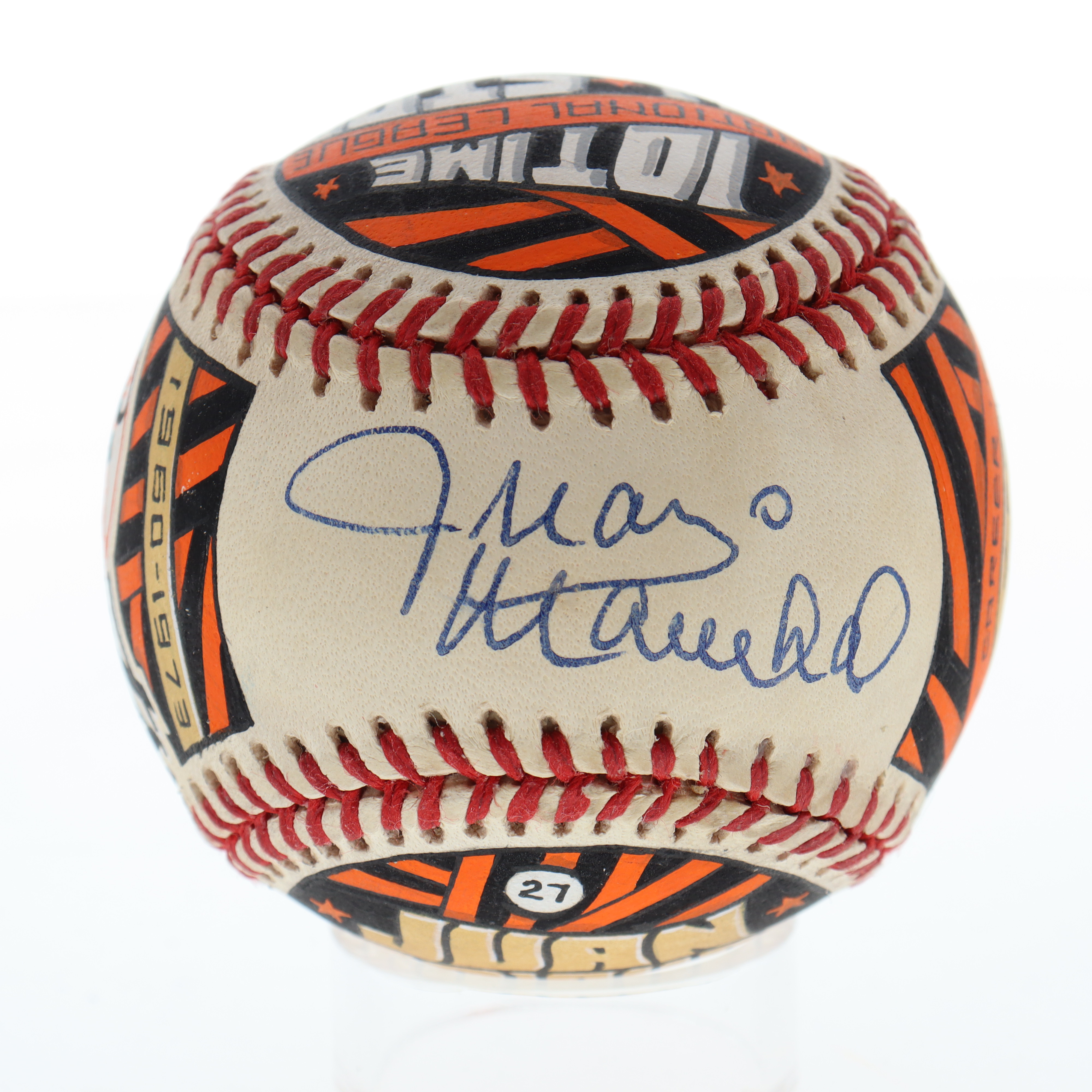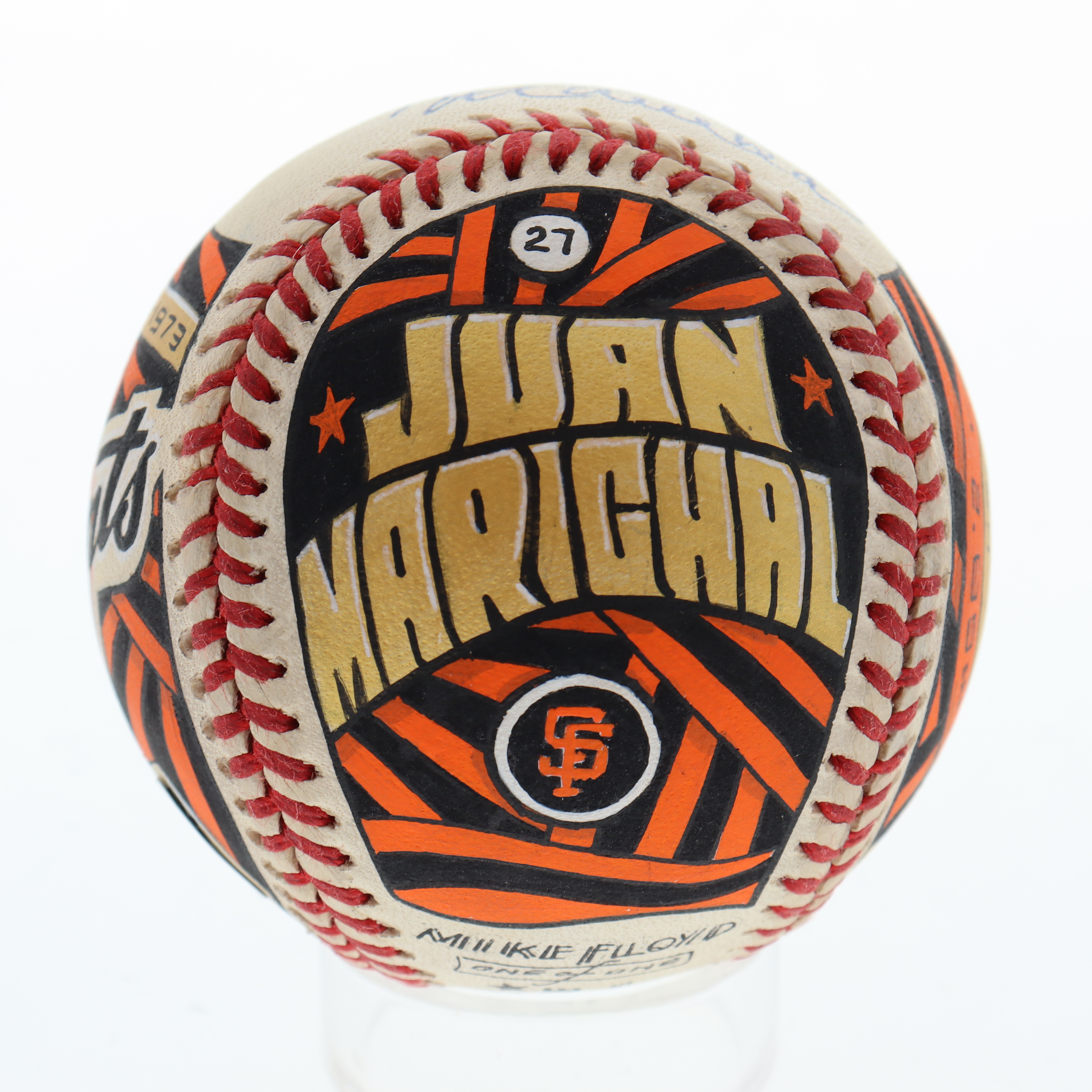 Rawlings Official National League baseball has been hand-signed by Juan Marichal (San Francisco Giants, HOF). This is a limited edition #1 / 1 art baseball which has been entirely hand drawn and painted by the artist, Mike Floyd.