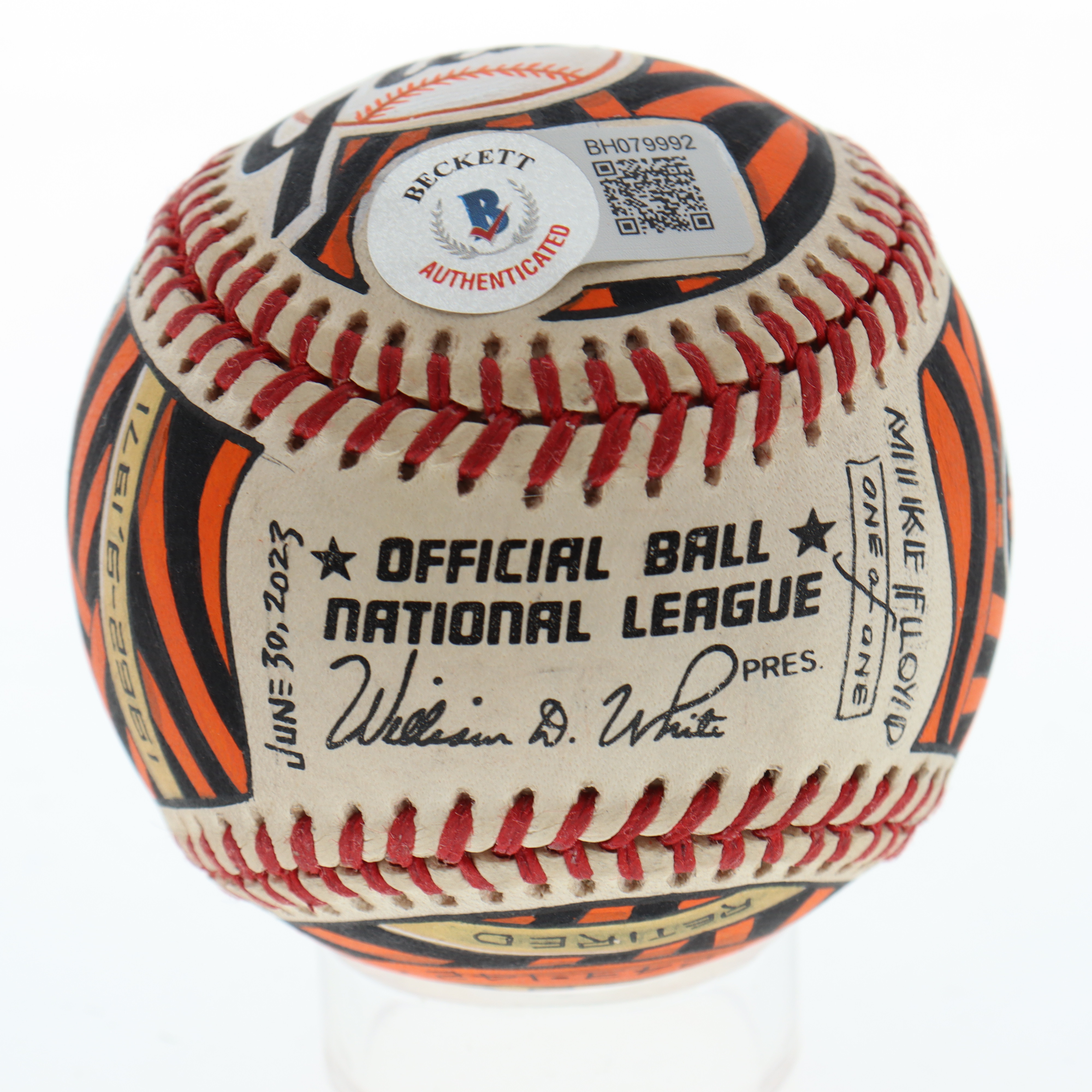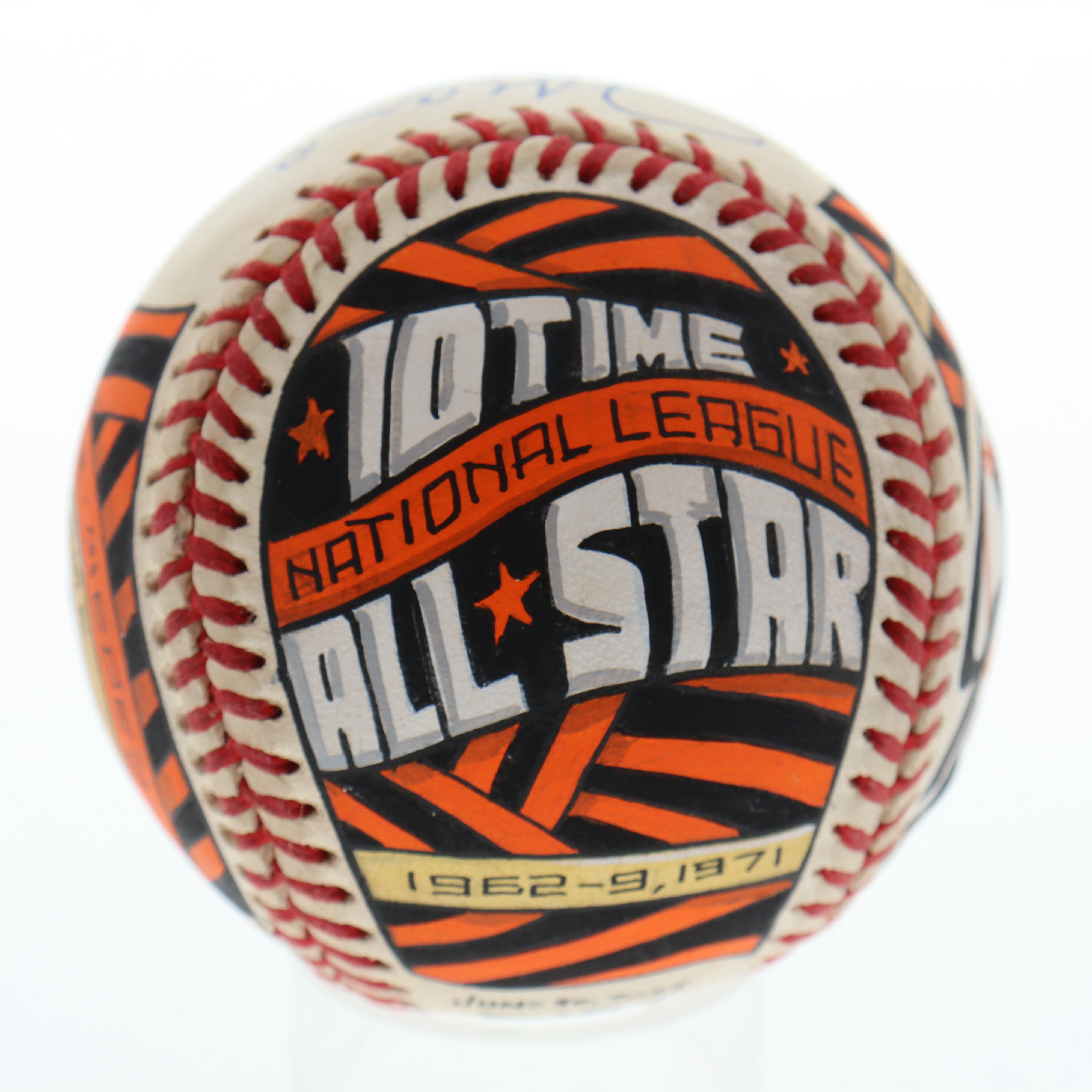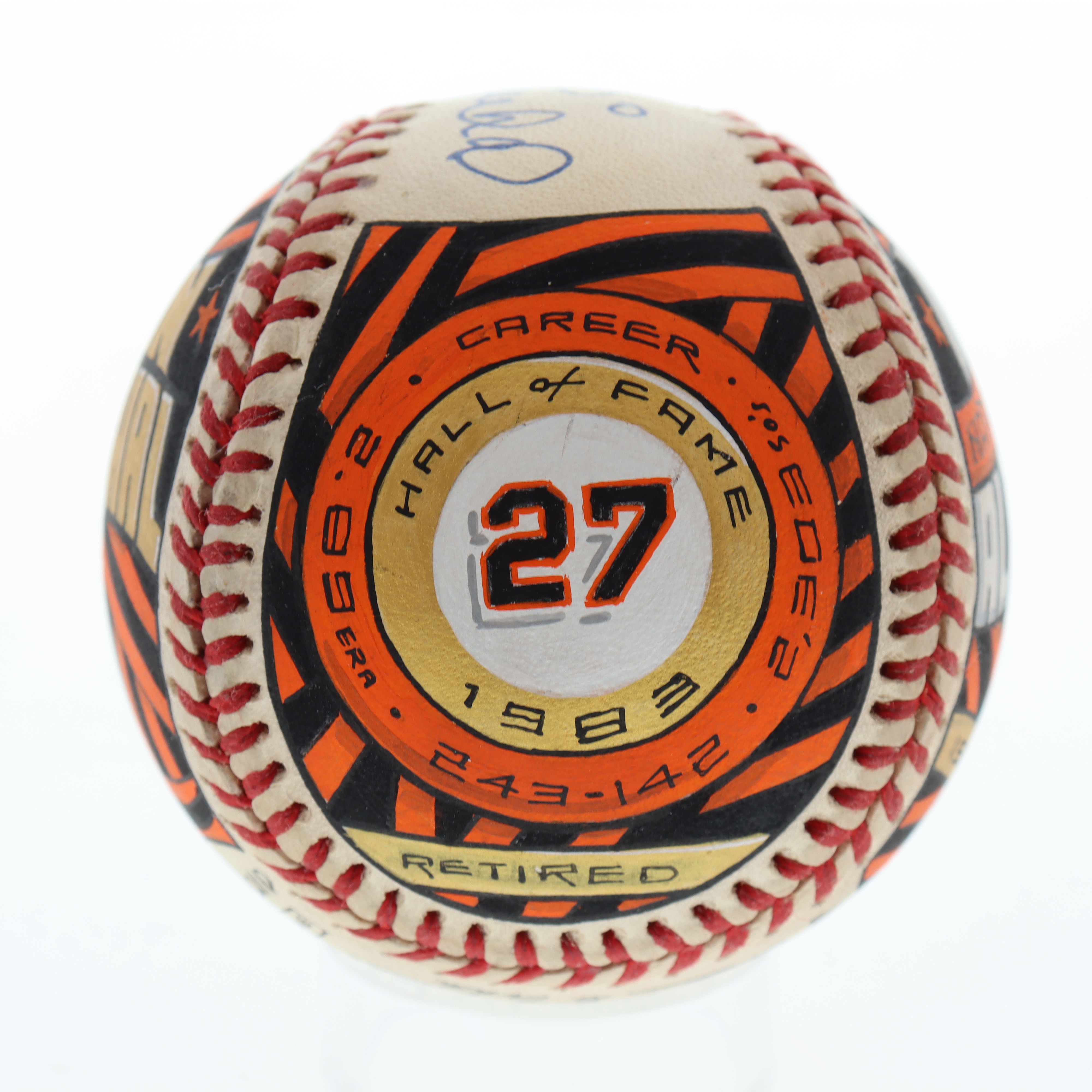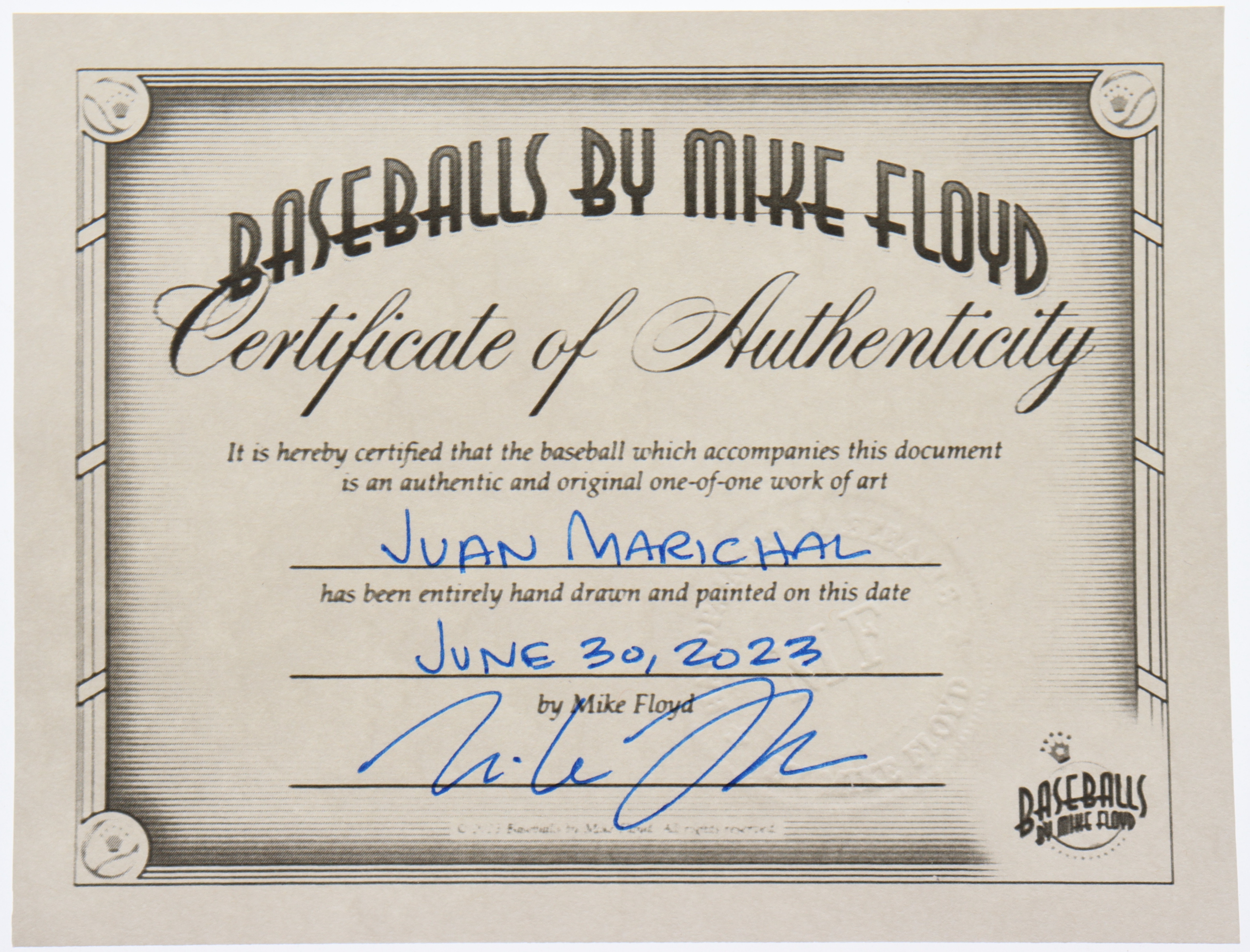 Rawlings Official National League baseball has been hand-signed by Juan Marichal (San Francisco Giants, HOF). This is a limited edition #1 / 1 art baseball which has been entirely hand drawn and painted by the artist, Mike Floyd.