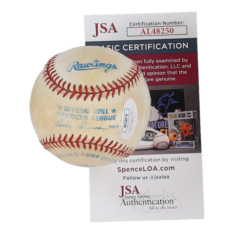 Rawlings Official American League Baseball. Hand-signed and inscribed by Ken Griffey Jr. (Seattle Mariners, HOF). Please note, the baseball is naturally toned.