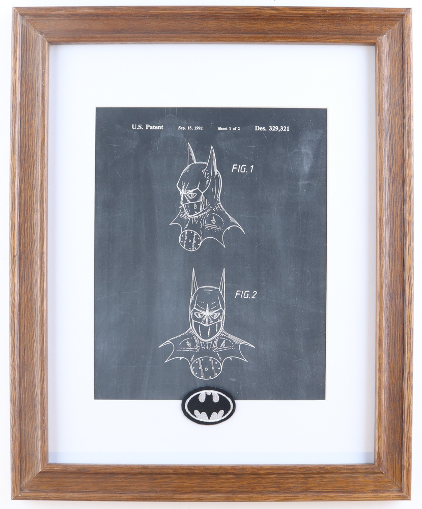 Custom frame measures 12" x 15" in size and features a 1992 U.S. patent blueprint of the bat cowl from "Batman Returns", as well as a Batman logo patch.