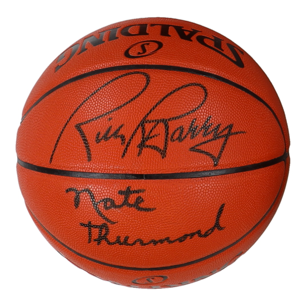 Spalding NBA Game Ball Series Basketball. Has been hand-signed by Rick Barry (Golden State Warriors, HOF) and Nate Thurmond (D. 2016, Golden State Warriors, HOF).