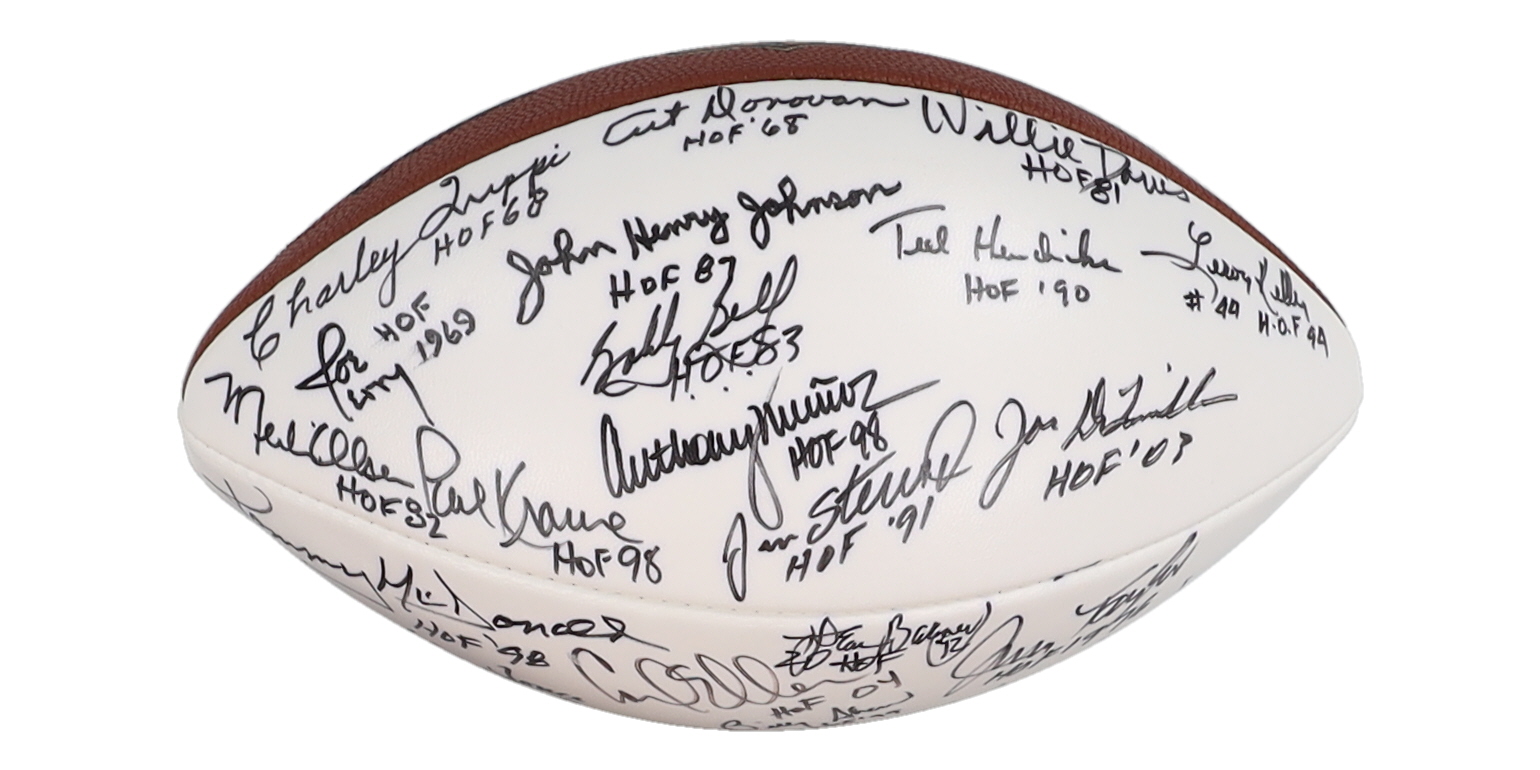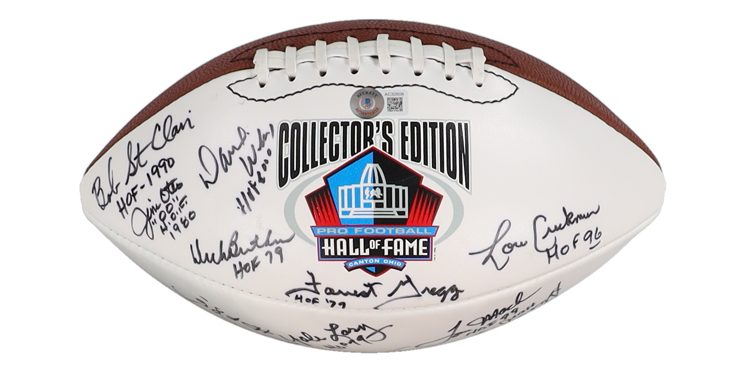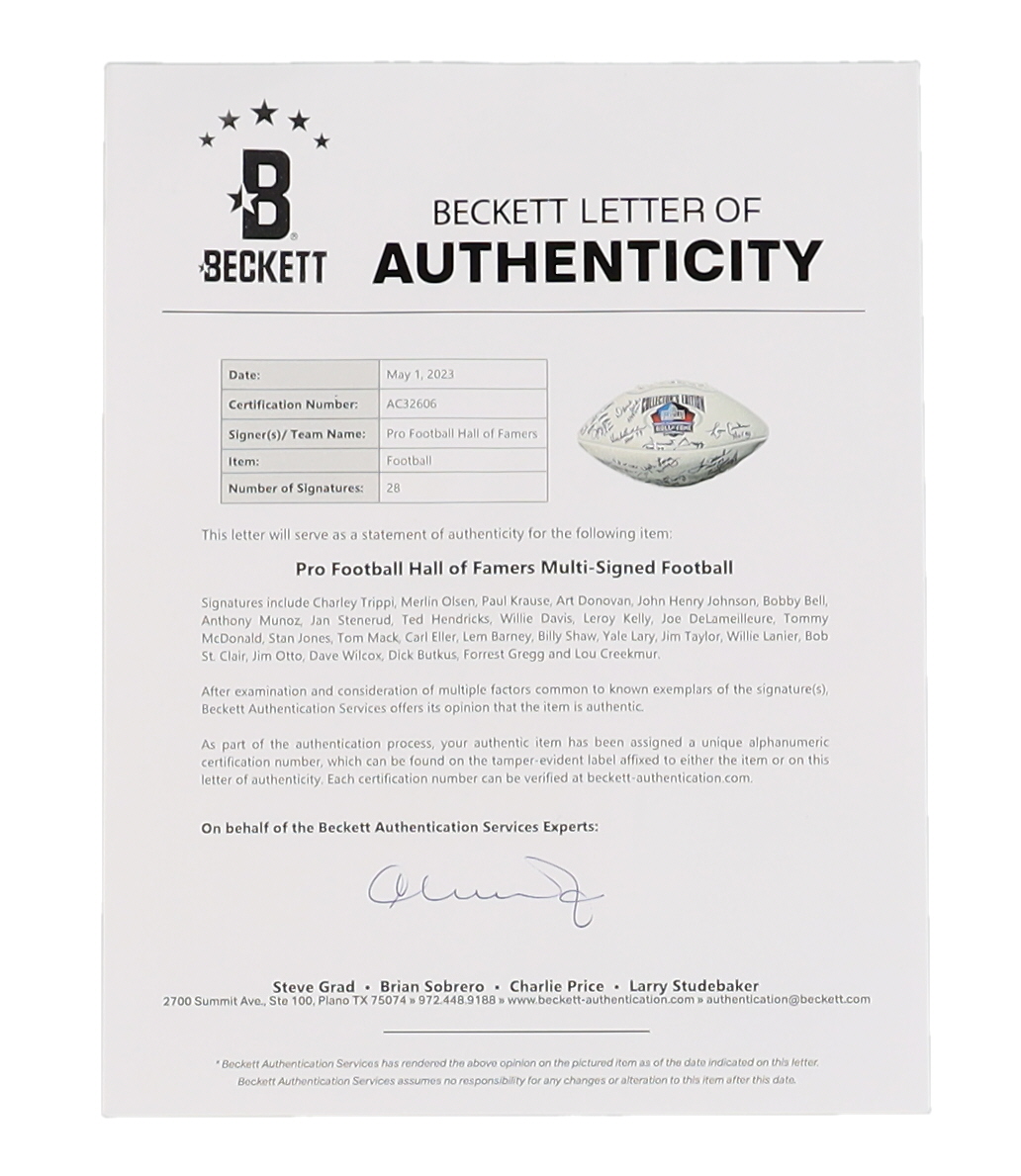 Pro Football Hall of Fame Collector's Edition football has been hand-signed and inscribed by (28) with Charley Trippi, Merlin Olsen, Paul Krause, Art Donovan, John Henry Johnson, Bobby Bell, Anthony Munoz, Jan Stenerud, Ted Hendricks, Willie Davis, Leroy Kelly, Joe DeLameilleure, Tommy McDonald, Stan Jones, Tom Mack, Carl Eller, Lem Barney, Billy Shaw, Yale Lary, Jim Taylor, Willie Lanier, Bob St. Clair, Jim Otto, Dave Wilcox, Dick Butkus, Forrest Gregg and Lou Creekmur. Please note, some signatures have bled.