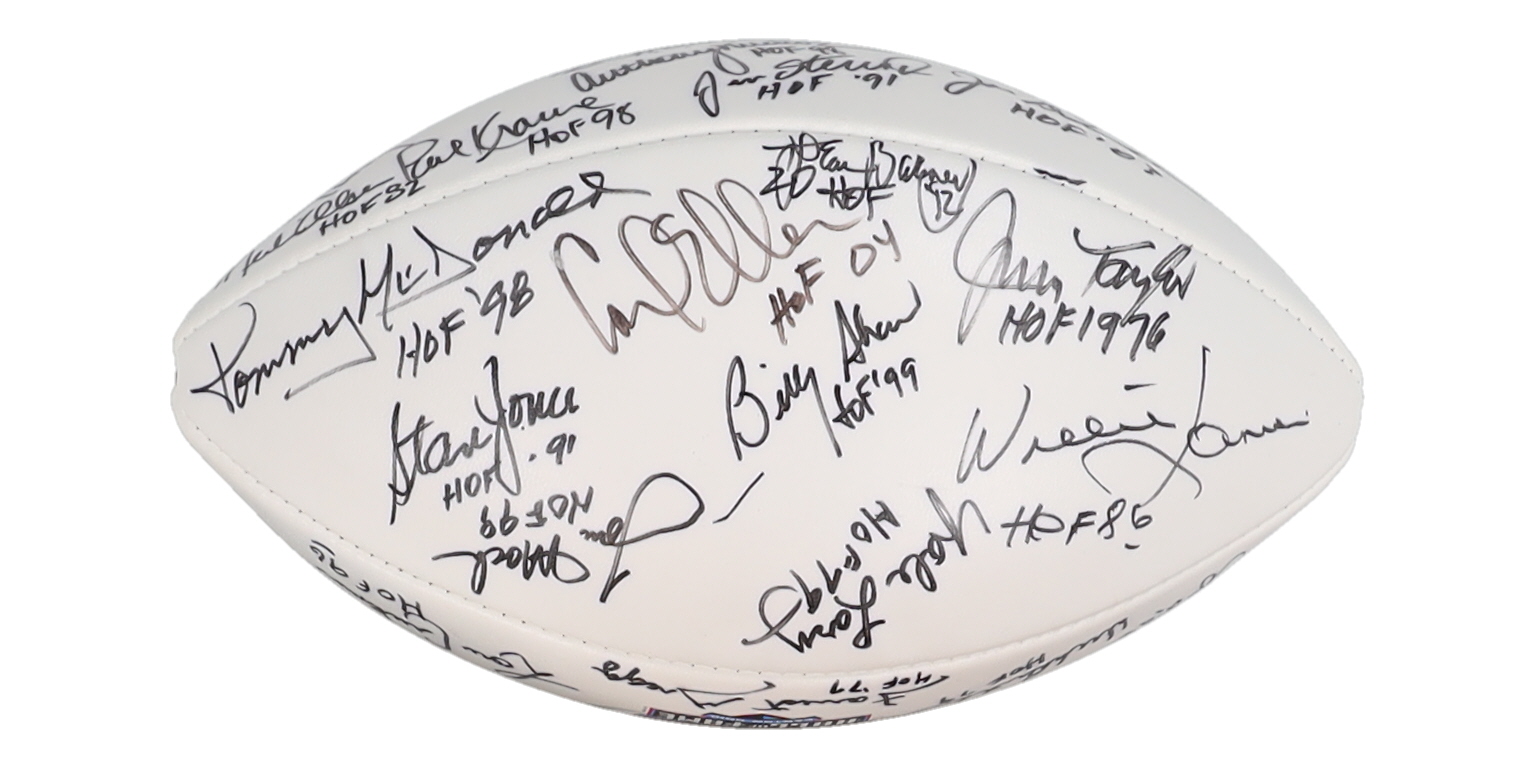 Pro Football Hall of Famers HOF Logo Collector's Edition Football Signed by (28) with Jim Taylor, Charley Trippi, Art Donovan, Anthony Munoz with Multiple HOF Year Inscriptions (Beckett)