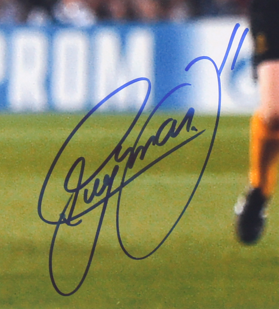 Photo measures 16" x 20" in size and has been hand-signed in blue felt-tip pen by Neymar.