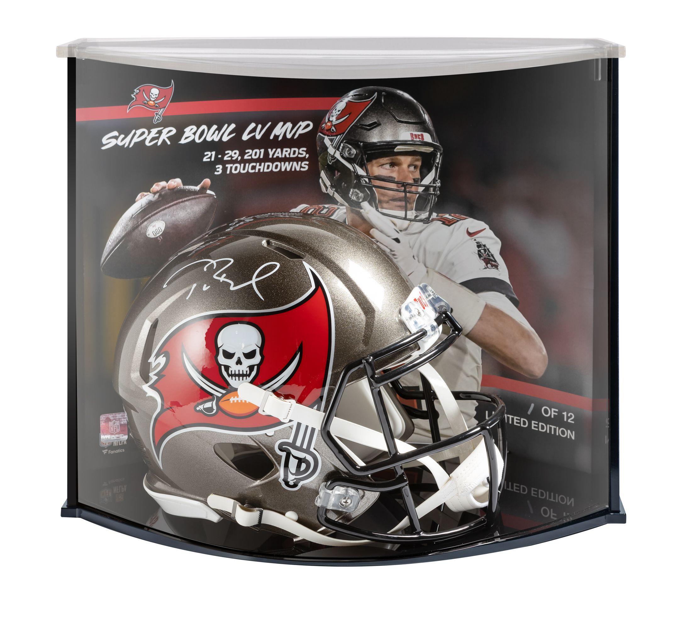 This authentic speed helmet has been personally hand-signed by Tom Brady. Paired with this helmet is a Limited Edition Tampa Bay Buccaneers Super Bowl MVP Stat Curve Display. Both the helmet and display are officially licensed. The helmet comes with an individually numbered, tamper-evident hologram from Fanatics Authentic. To ensure authenticity, the hologram can be reviewed online. This process helps to ensure that the product purchased is authentic and eliminates any possibility of duplication or fraud. It is important to note that the helmet is not limited. The curve display is limited. You will receive number "12" from the edition. Game Day Legends is proud to bring to you 'The Curve' display case. This unique memorabilia display case will enhance anyone's personal collectibles showroom. With a dynamic appearance thanks to its sleek curved design, this case beautifully highlights your autographed item. Within the curve display is a custom 16 x 20 action photograph. Due to the curved nature of this display, the image is visible from all angles of the display case and perfectly accentuates the signed item making this the ultimate collectible and the safest way to display your collectible. You must see this to believe just how beautiful it is. Overall, the display case has an approximate size of 19.875" wide x 16" high x 12.25" deep and weighs 9 lbs. Carefully packed inside a protective box for shipment are the display's base, two clear acrylic covers, lid, two side panels, brace, 4 screws, and a "game item" holder. This custom designed case is a must have for any sports fan. Please note, some minor assembly is required. This is a stock item and stock images may be used in this listing. The exact item you will receive will be of equal quality to the one pictured. You will receive number "12" from this edition.