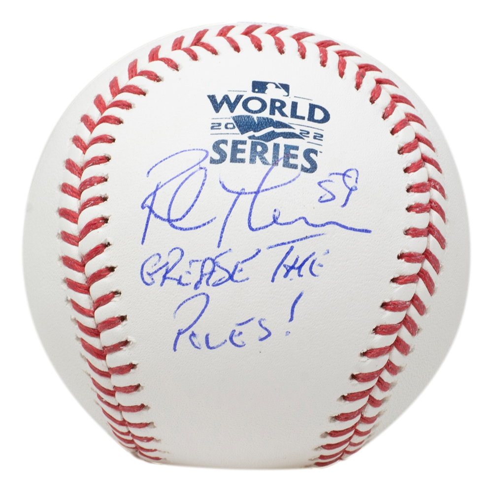 Rawlings Official 2022 World Series logo baseball. Hand-signed and inscribed by Rob Thompson (Philadelphia Phillies).