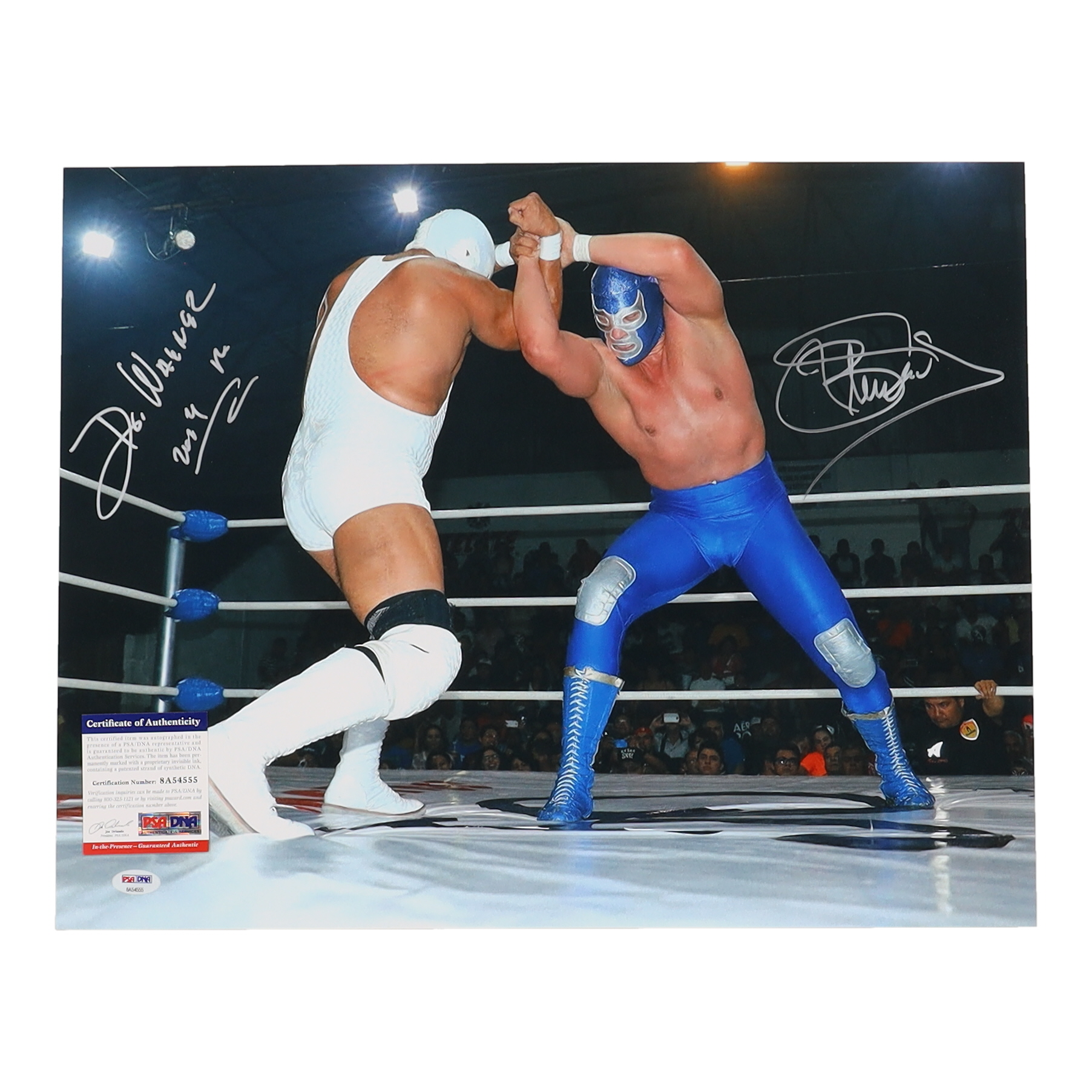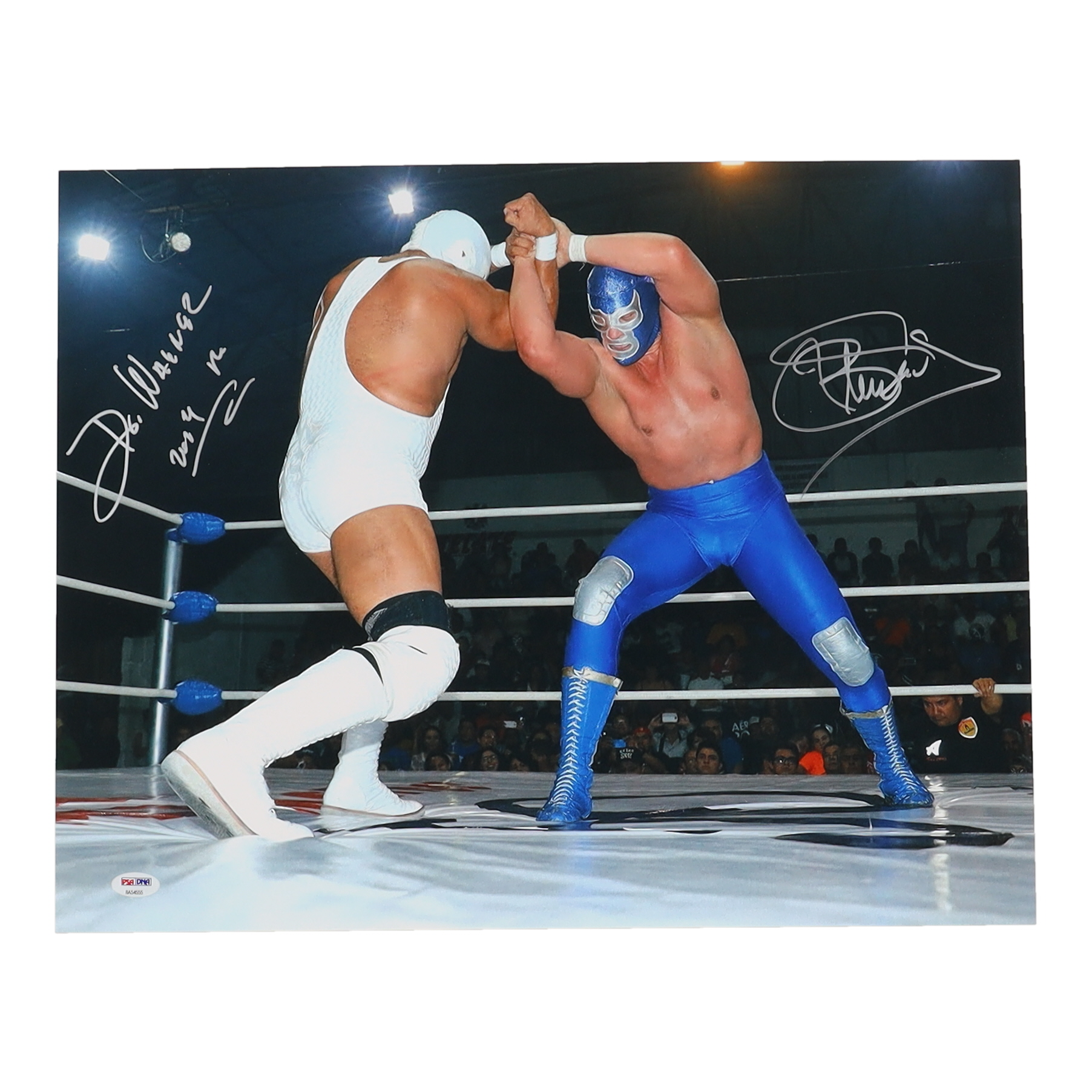 Photo measures 16" x 20" in size and has been hand-signed by Blue Demon Jr. and Dr. Wagner Jr..