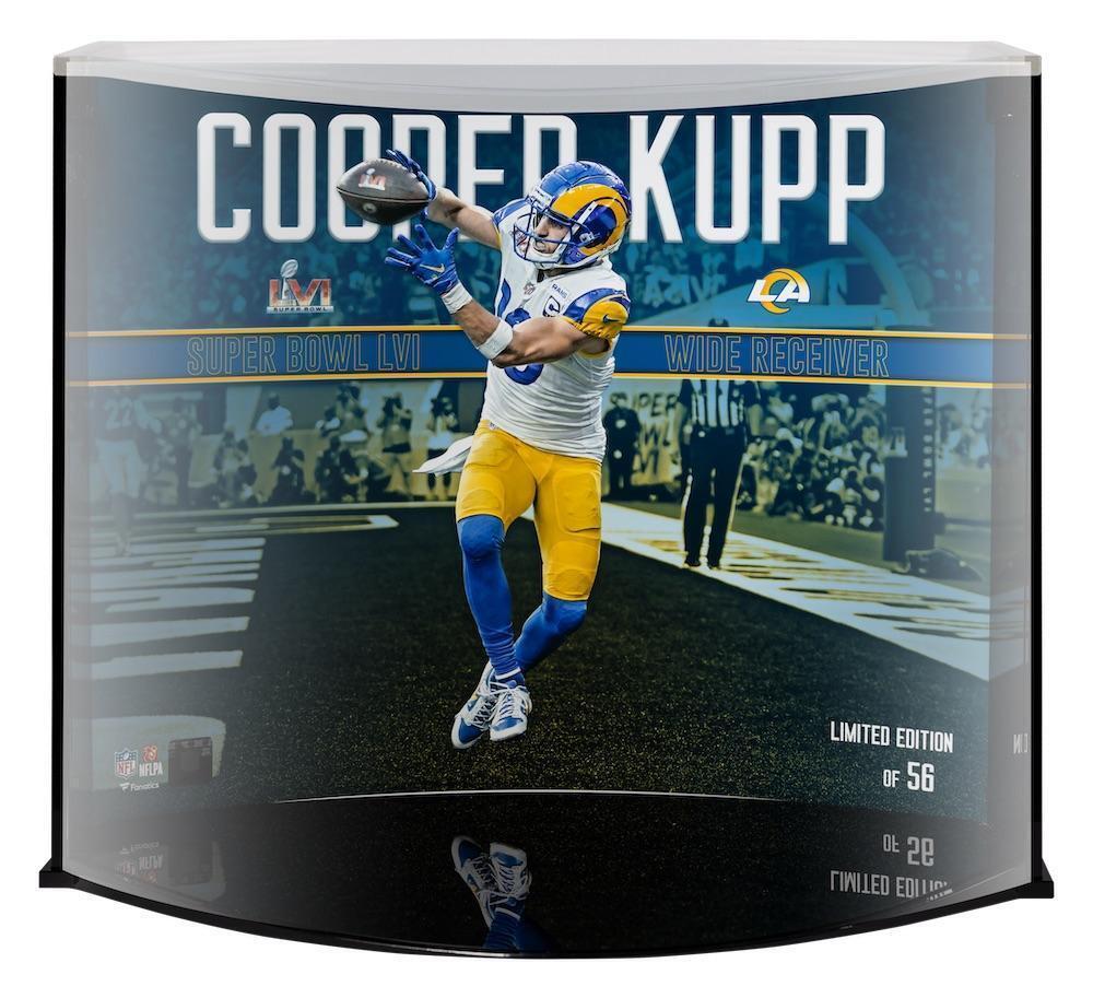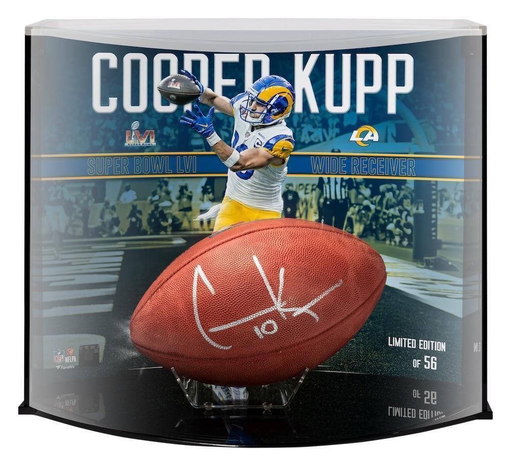 This Official Super Bowl LVI authentic football has been personally hand-signed by Cooper Kupp. This is beautifully paired with a limited edition 16" x 20" photograph and curve display that showcases Cooper Kupp's Super Bowl Championship MVP performance at Super Bowl LVI. It is officially licensed by the National Football League and comes with an individually numbered, tamper-evident hologram from Fanatics Authenticated. To ensure authenticity, the hologram can be reviewed online. This process helps to ensure that the product purchased is authentic and eliminates any possibility of duplication or fraud. It is important to note that the football is not limited. The curve display is limited. You will receive number "10" from the edition.