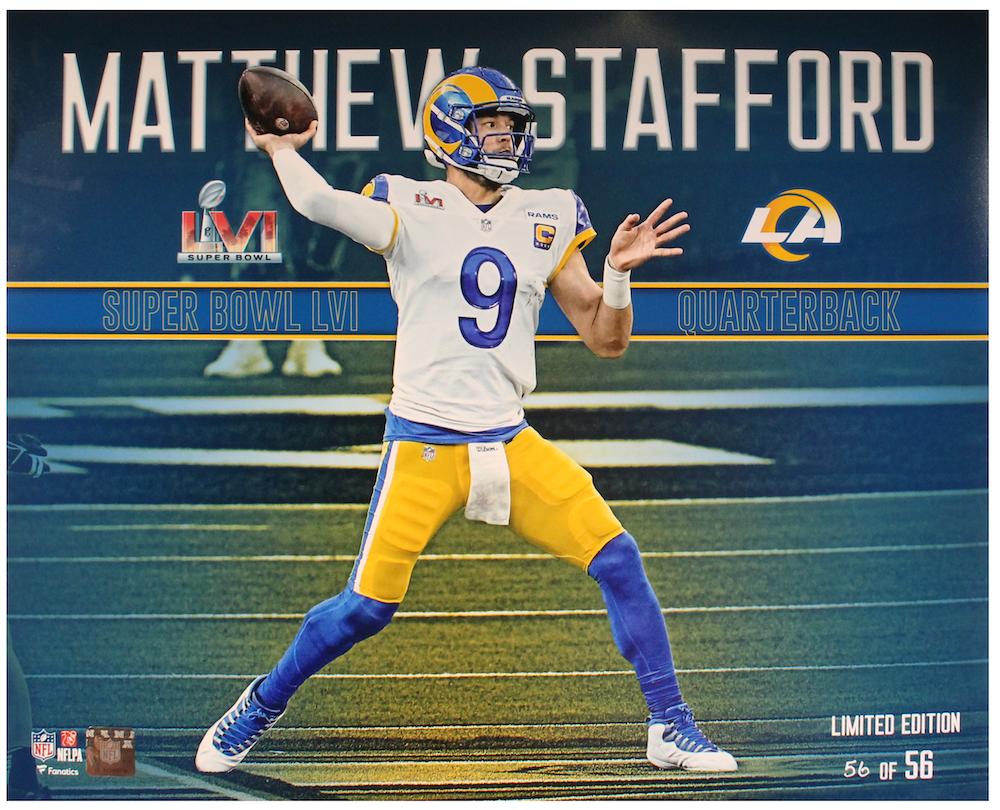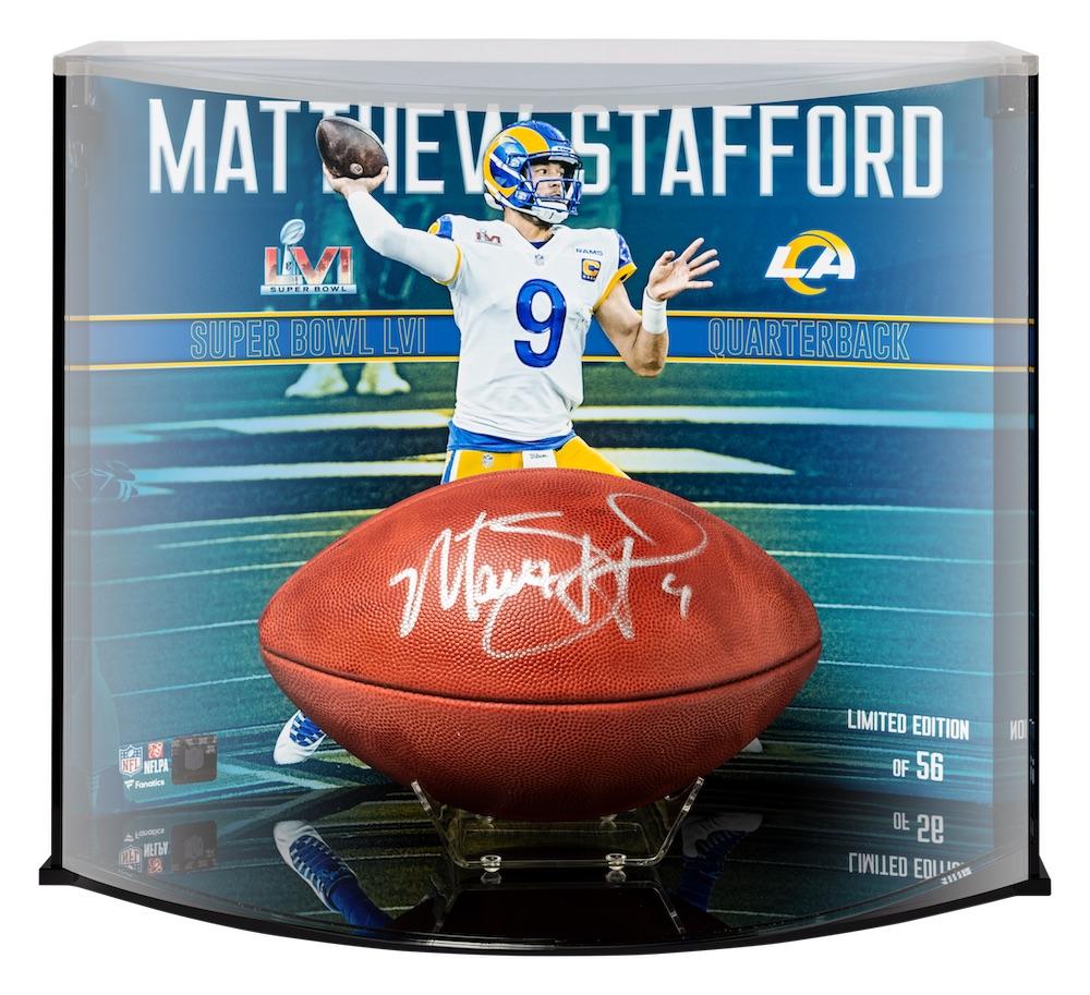 This NFL Super Bowl LVI Official authentic football has been personally hand-signed by Matthew Stafford. This is beautifully paired with a limited edition 16" x 20" photograph and curve display that showcases Matthew Stafford's Super Bowl Champion performance at Super Bowl LVI. It is officially licensed by the National Football League and comes with an individually numbered, tamper-evident hologram from Fanatics Authenticated. To ensure authenticity, the hologram can be reviewed online. This process helps to ensure that the product purchased is authentic and eliminates any possibility of duplication or fraud. This curve display is limited to 56 and you will receive number "56" from the edition.