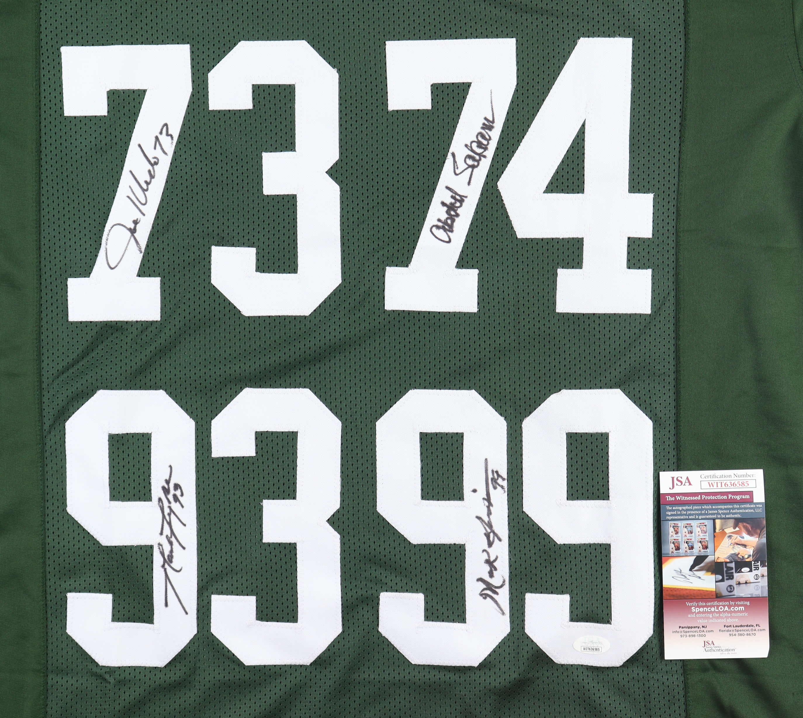 Custom style jersey. Everything is sewn on, size XL. Hand-signed by (4) including Joe Klecko, Abdul Salaam, Mark Gastineau and Marty Lyons.