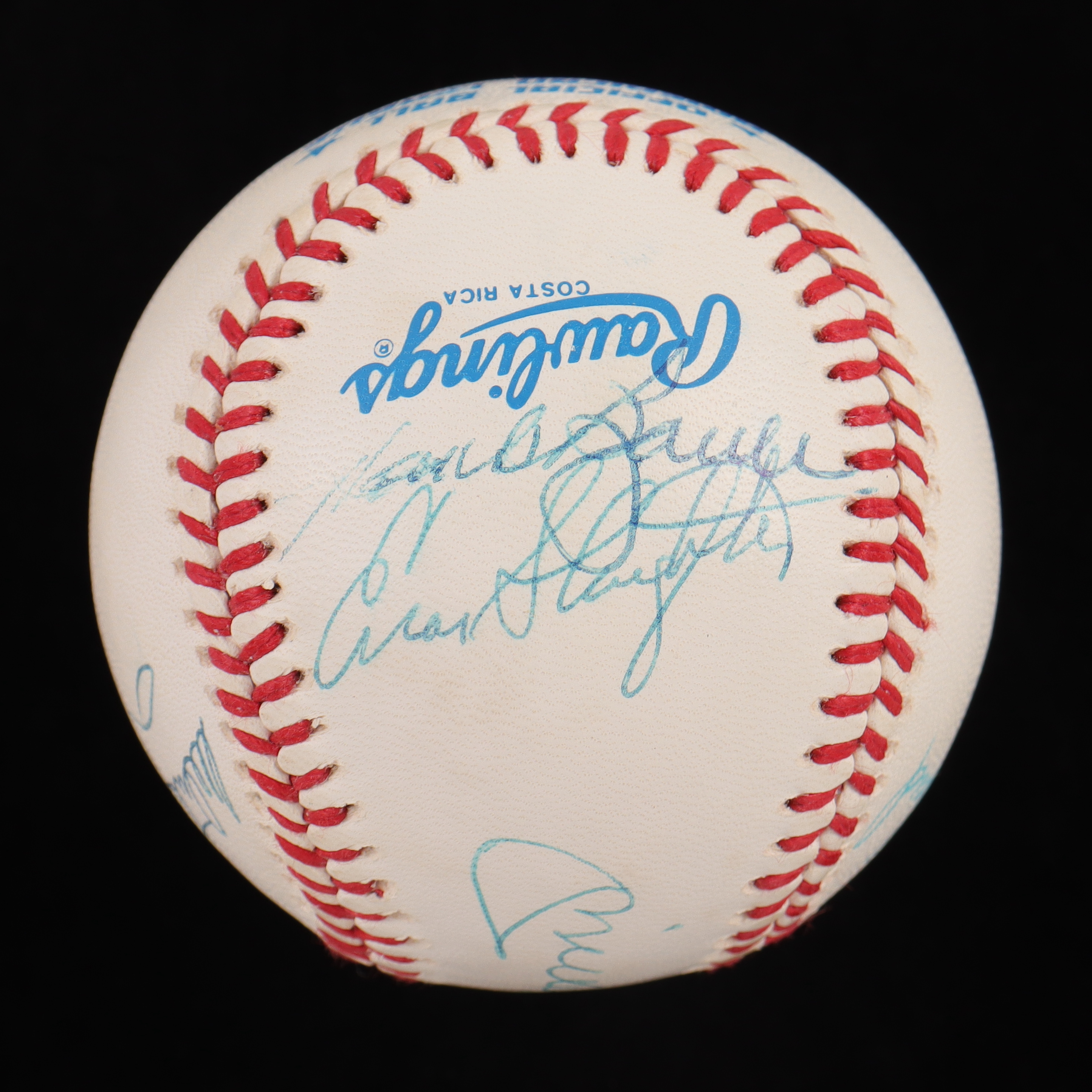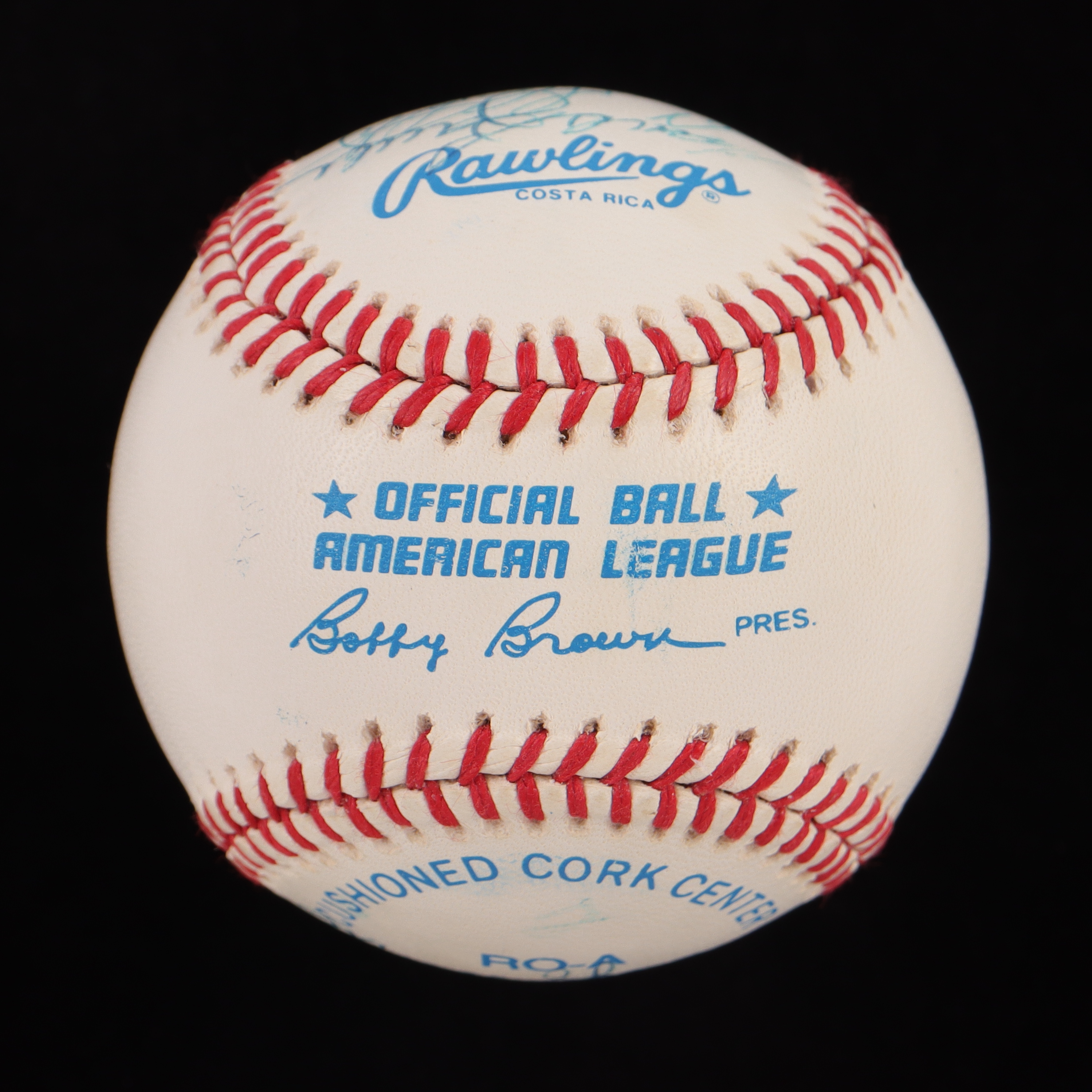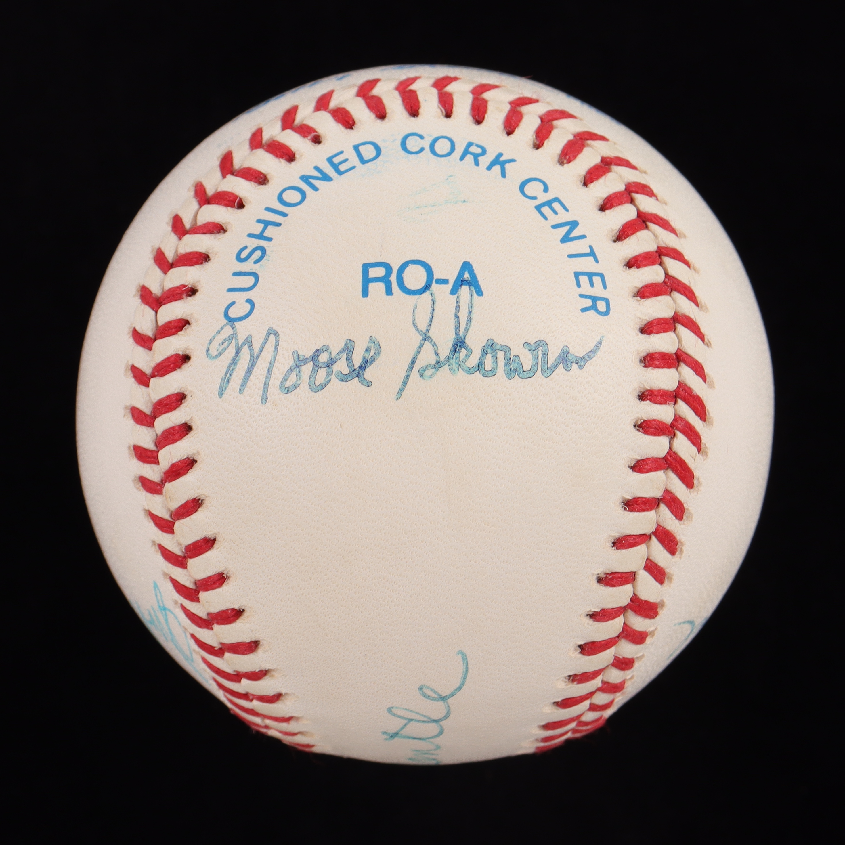 Rawlings Official American League Baseball has been hand-signed by Mickey Mantle, Enos Slaughter, Whitey Ford, Moose Skowron, Hank Bauer and Johnny Blanchard (New York Yankees).