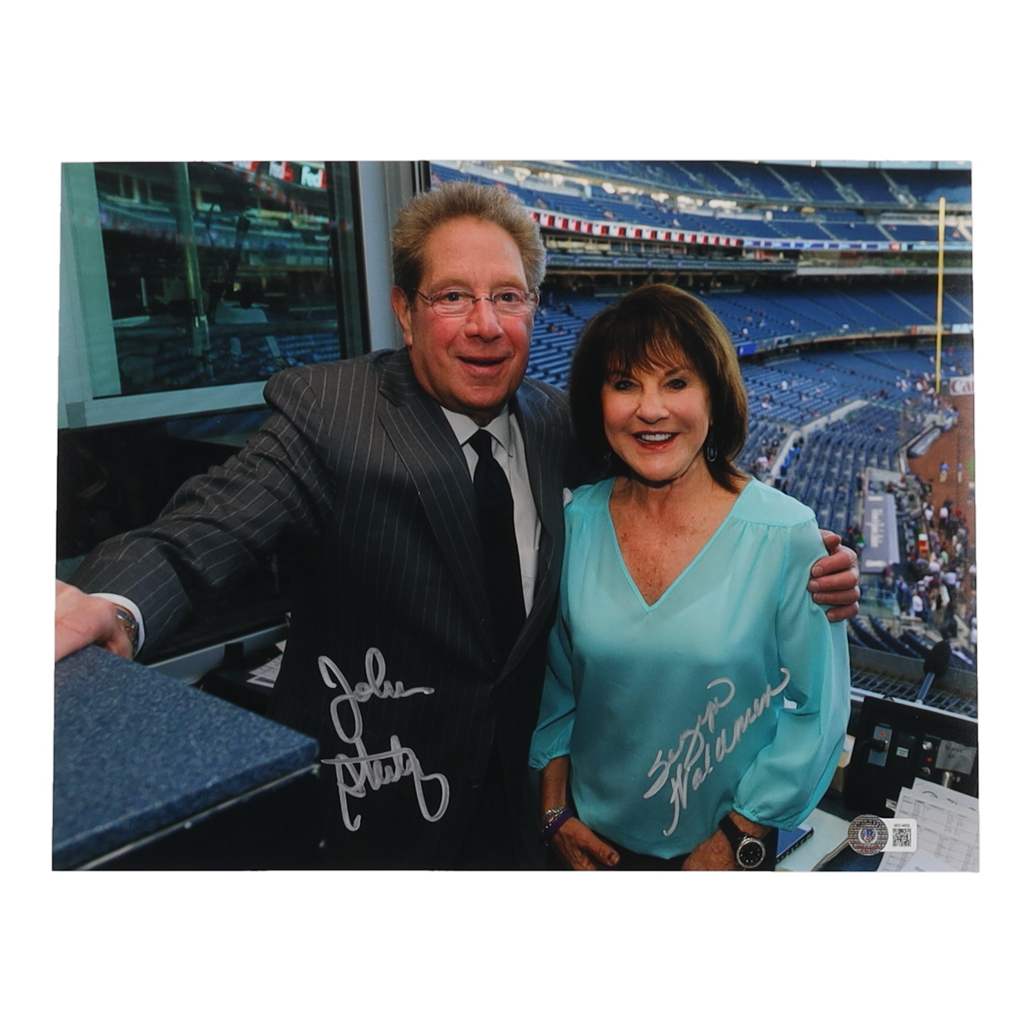 Photo measures 11" x 14" in size and has been hand-signed by John Sterling (Sportscaster) and Suzyn Waldman (Sportscaster).
