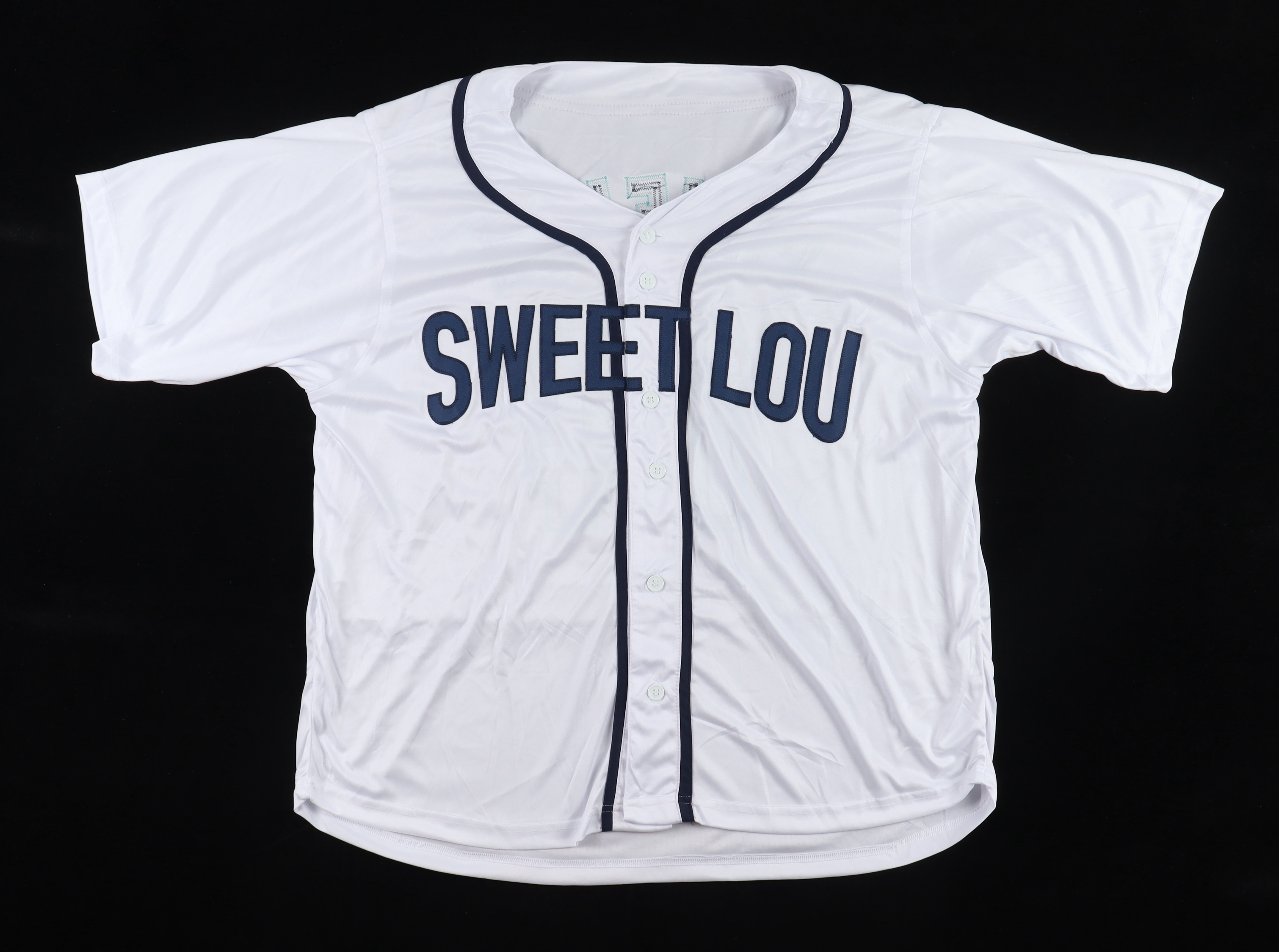 Custom jersey with everything sewn on, size XL. Hand-signed by Lou Piniella.
