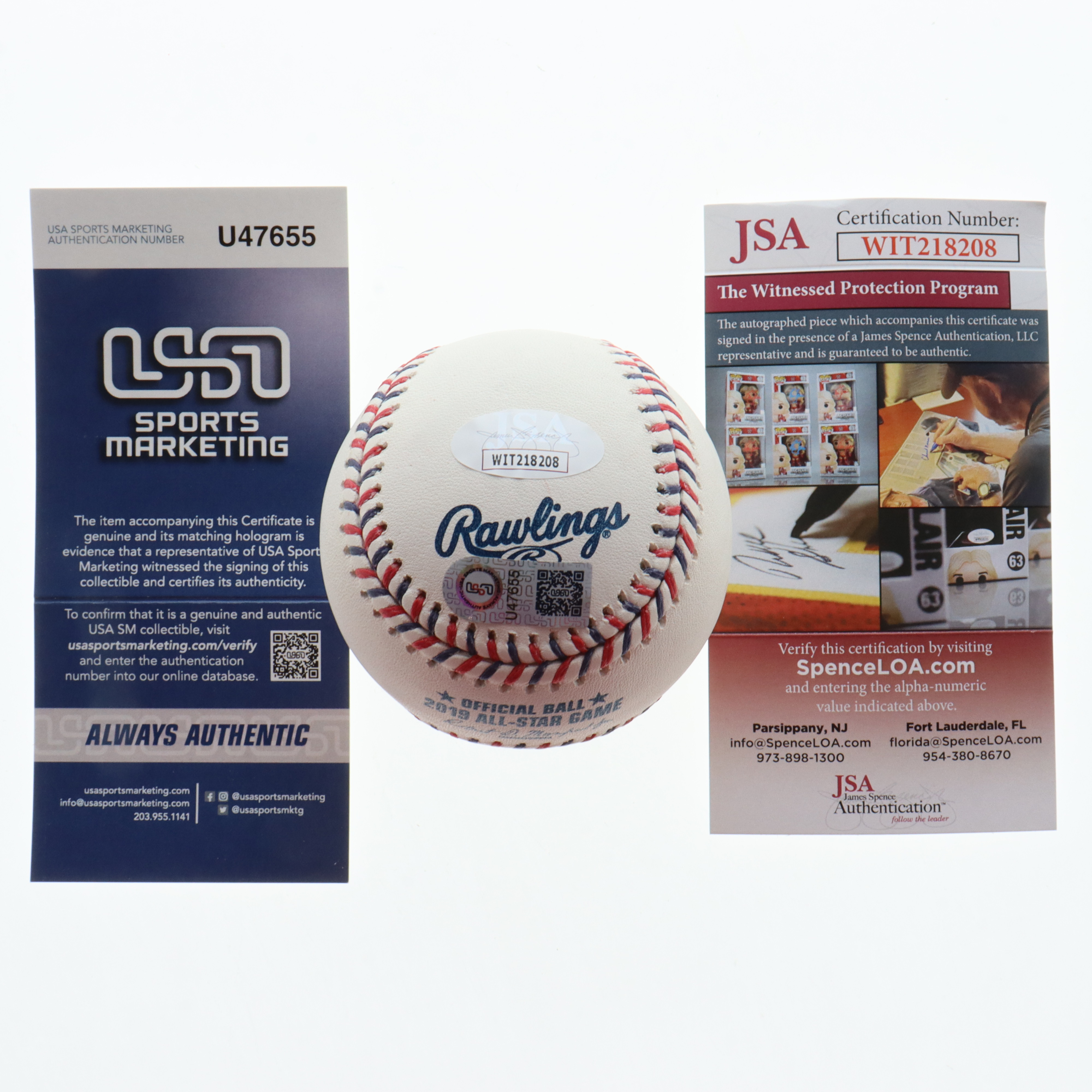 The lot / autograph(s) includes an official USA Sports Marketing (USA SM) hologram and matching COA, as well as an official James Spence Authentication (JSA) hologram and COA for authenticity purposes. The signing of this item was witnessed by JSA.