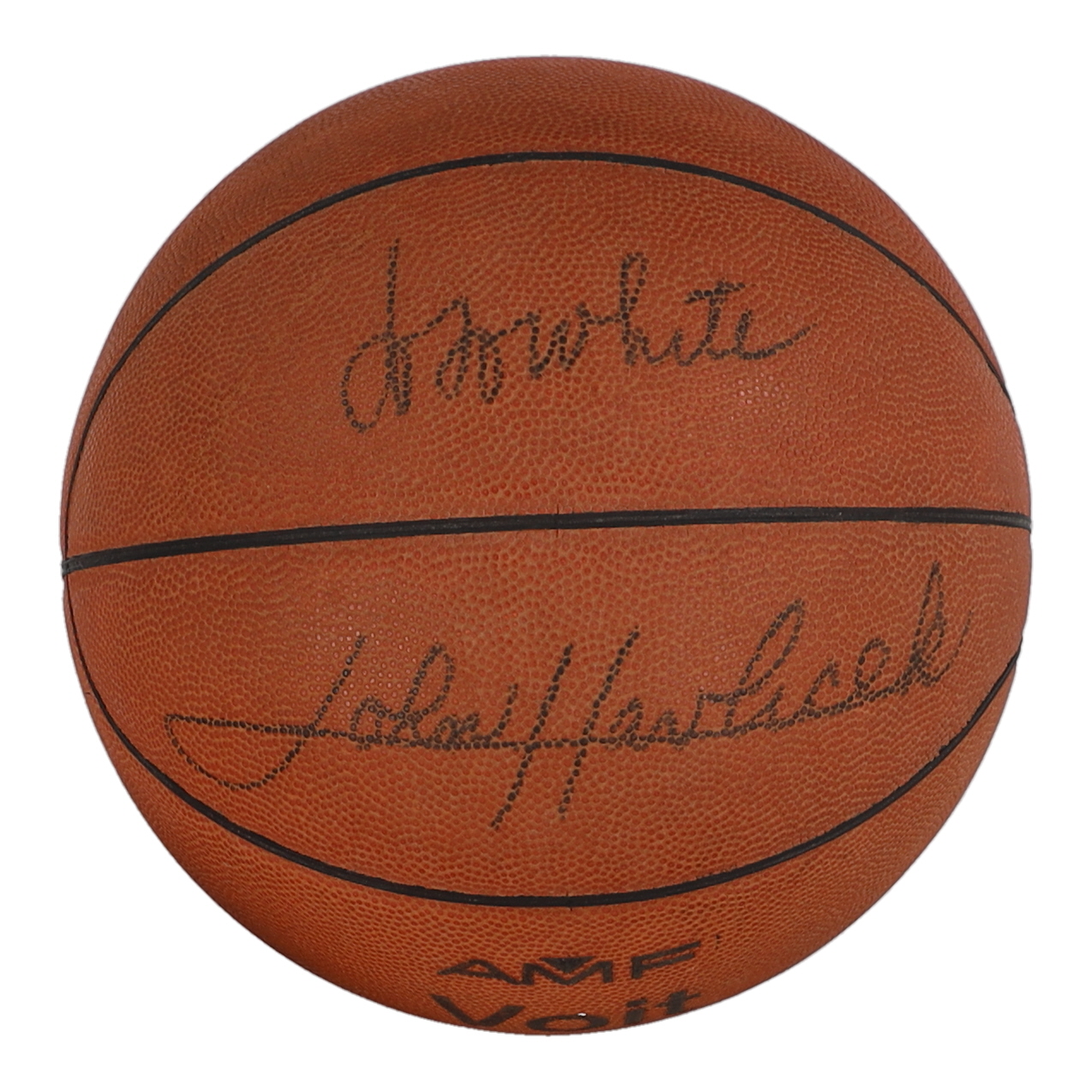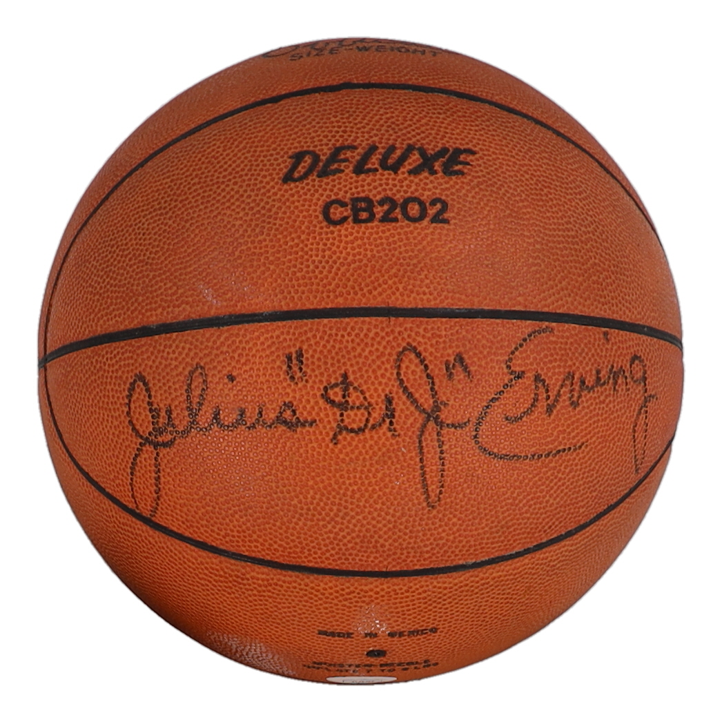 AMF Voit Official Basketball. Hand-signed by Julius Erving ( Philadelphia 76ers, HOF), John Havlicek (D. 2019, Boston Celtics, HOF), Jo Jo White (D. 2018, Boston Celtics, HOF). Please note, the basketball shows signs of natural aging as well as scuffing.