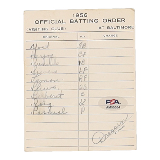 Chuck Dressen Signed 1956 Senators Original Batting Order Card at Baltimore Orioles Memorial Stadium (PSA)