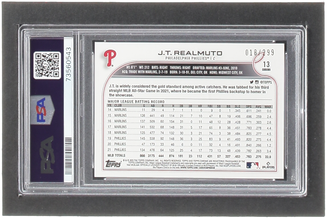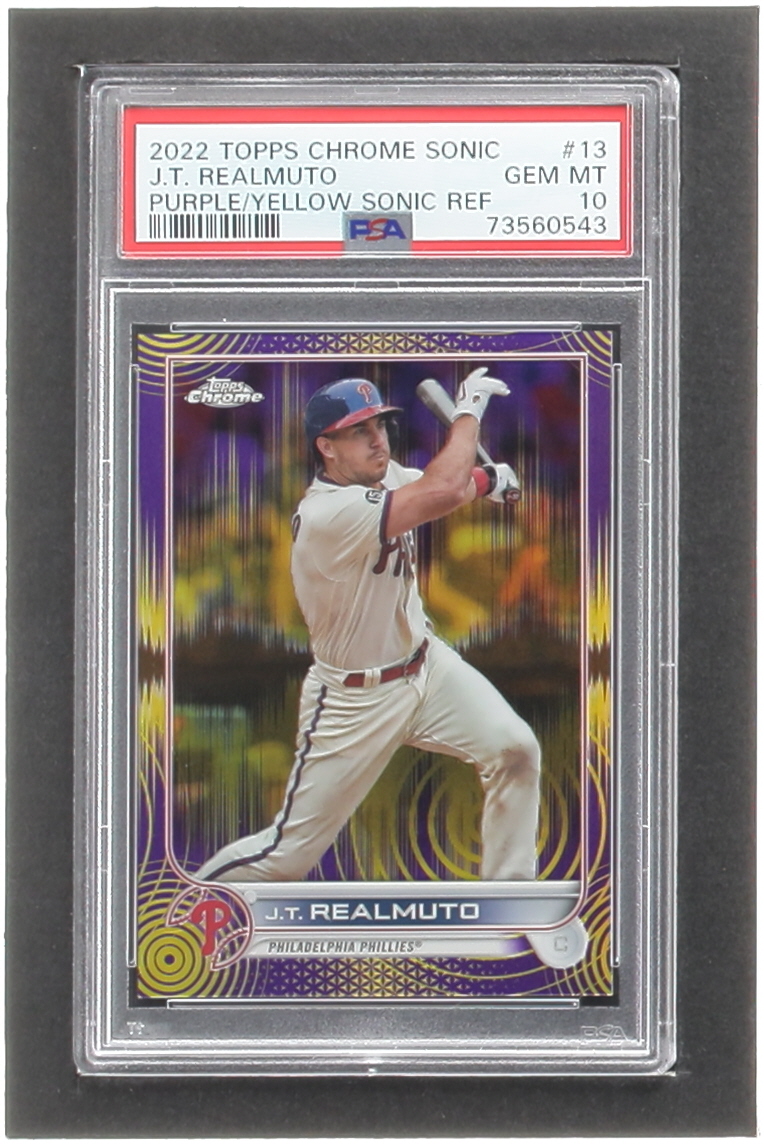 J.T. Realmuto 2022 Topps Chrome Sonic Purple Yellow Sonic Refractors #13 #018/299 (PSA 10)