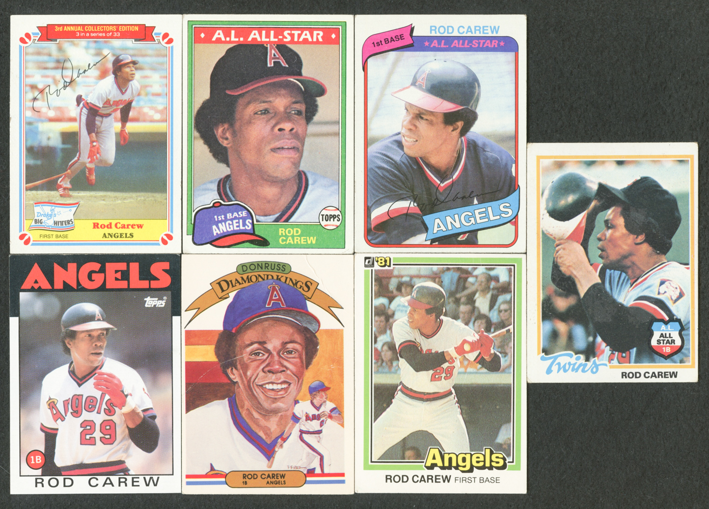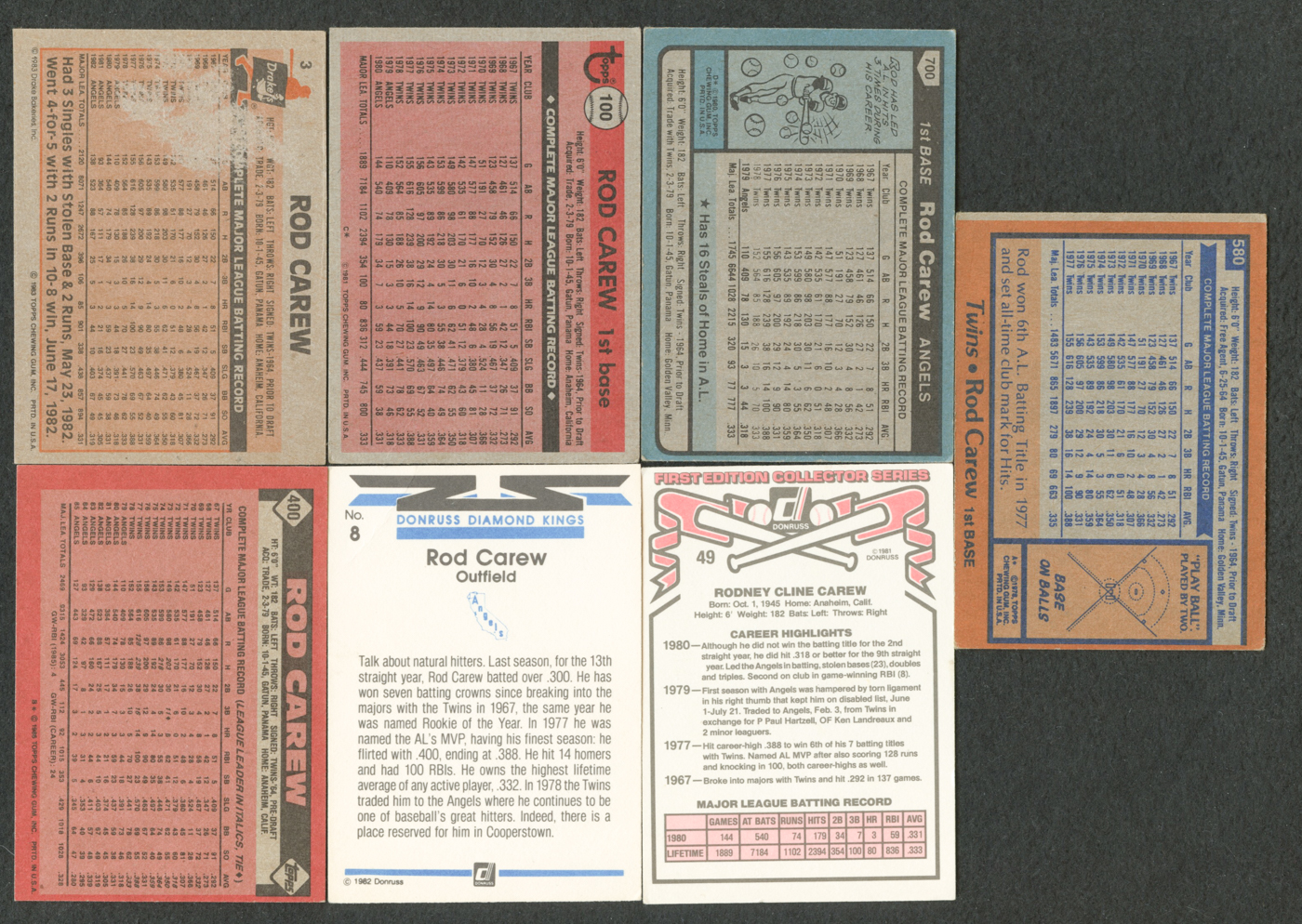 Lot of (7) Rod Carew Baseball Cards with 1983 Drake's #3, 1981 Topps #100, 1986 Topps #400, 1980 Topps #700, 1981 Donruss #49, 1981 Donruss #49, & 1982 Donruss #8