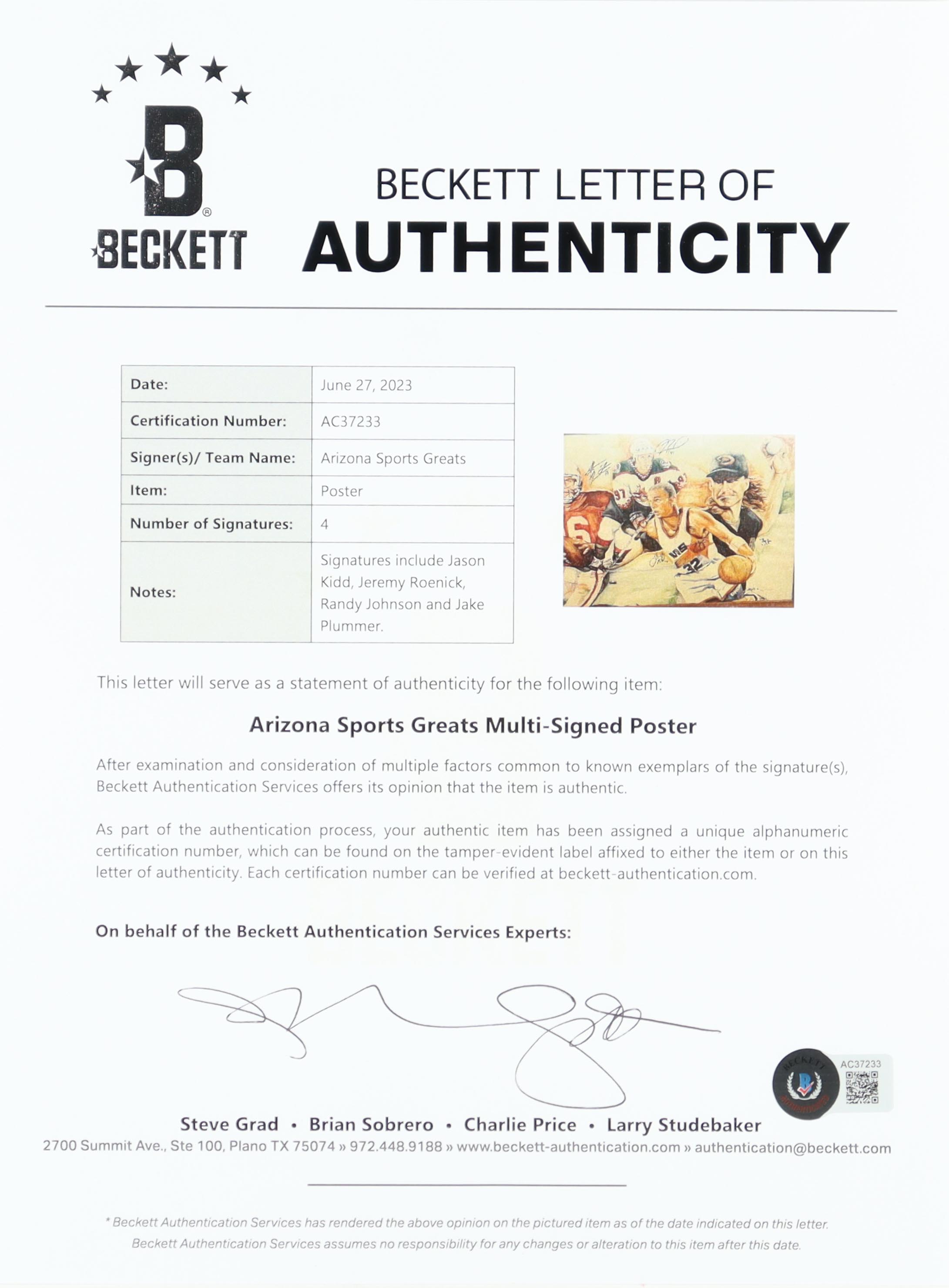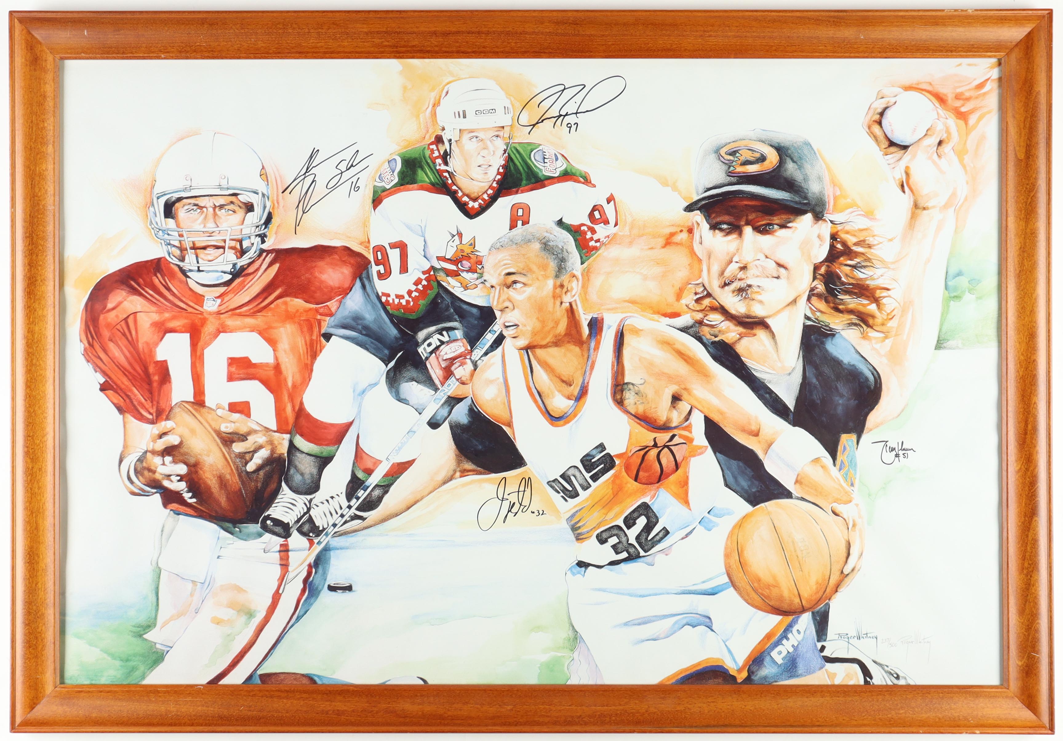 Custom frame measures 27" x 40" in size. Features a limited edition print numbered #237/500 that has been hand-signed by (4) with Jason Kidd (Phoenix Suns, HOF), Jeremy Roenick (Phoenix Coyotes, HOF), Randy Johnson (Arizona Diamondbacks, HOF) and Jake Plummer (Arizona Cardinals).