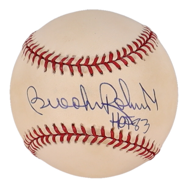 Rawlings Official American League baseball. Hand-signed and inscribed by Brooks Robinson (Baltimore Orioles, HOF). Please note, the baseball is naturally toned.